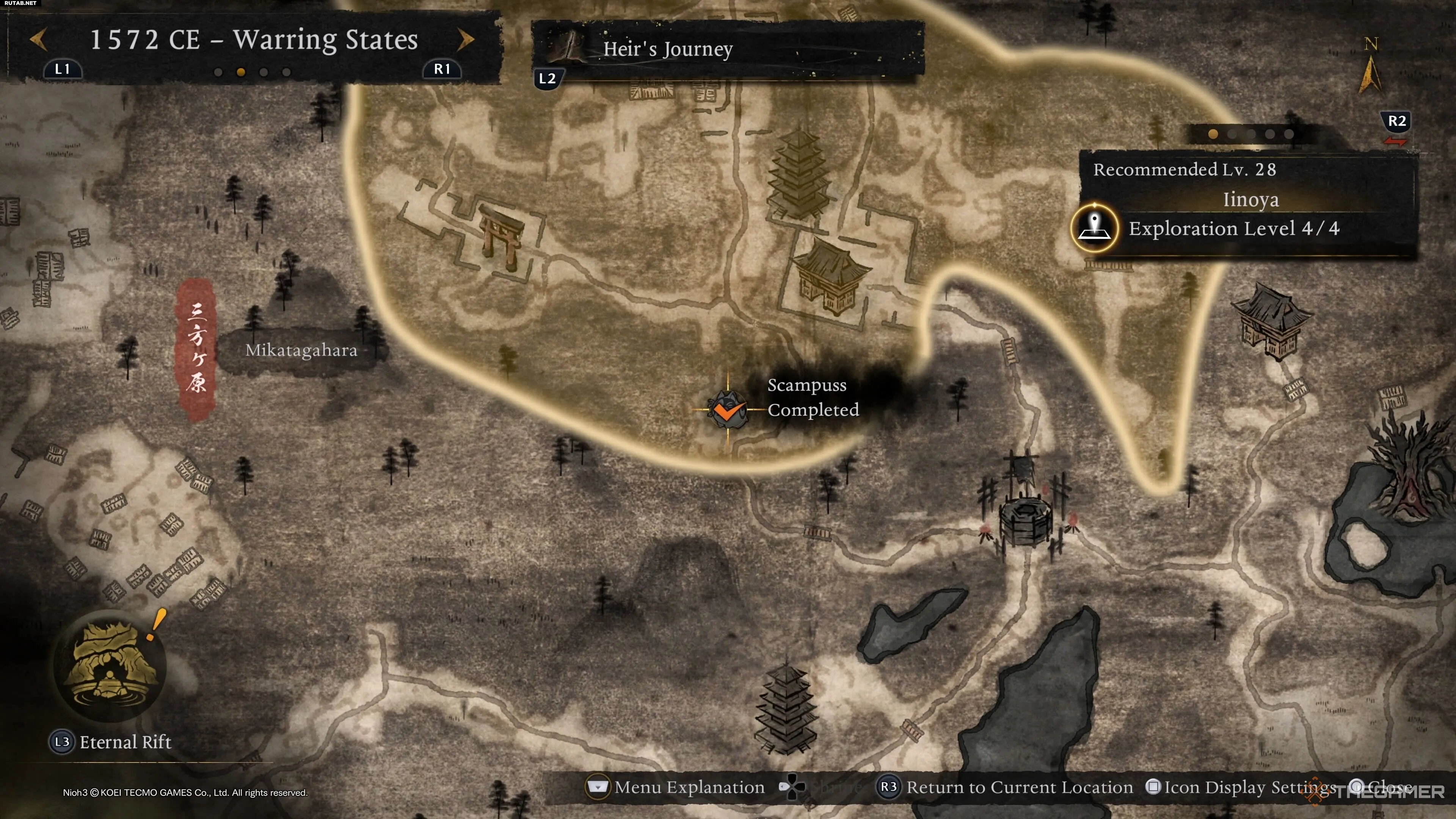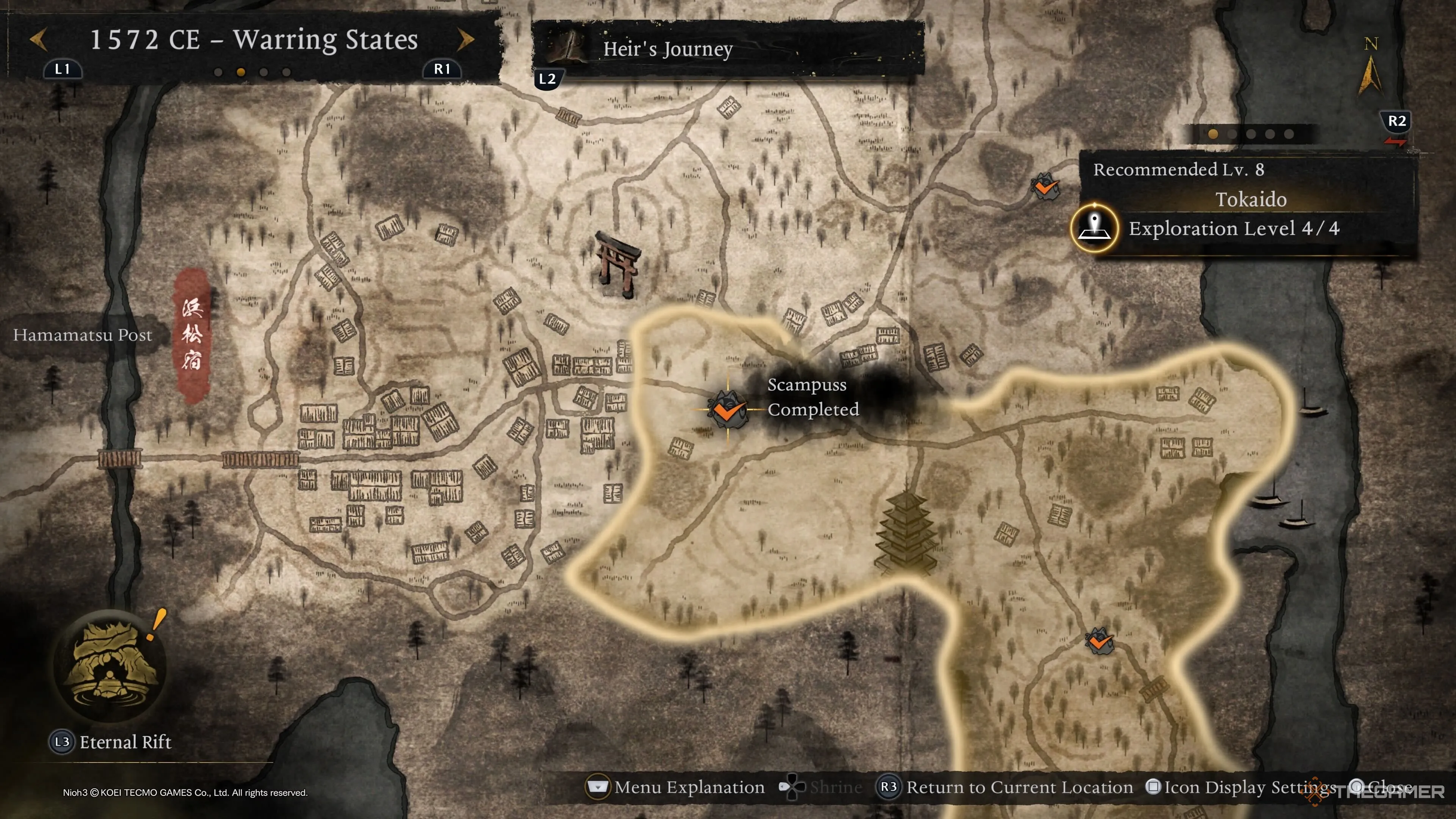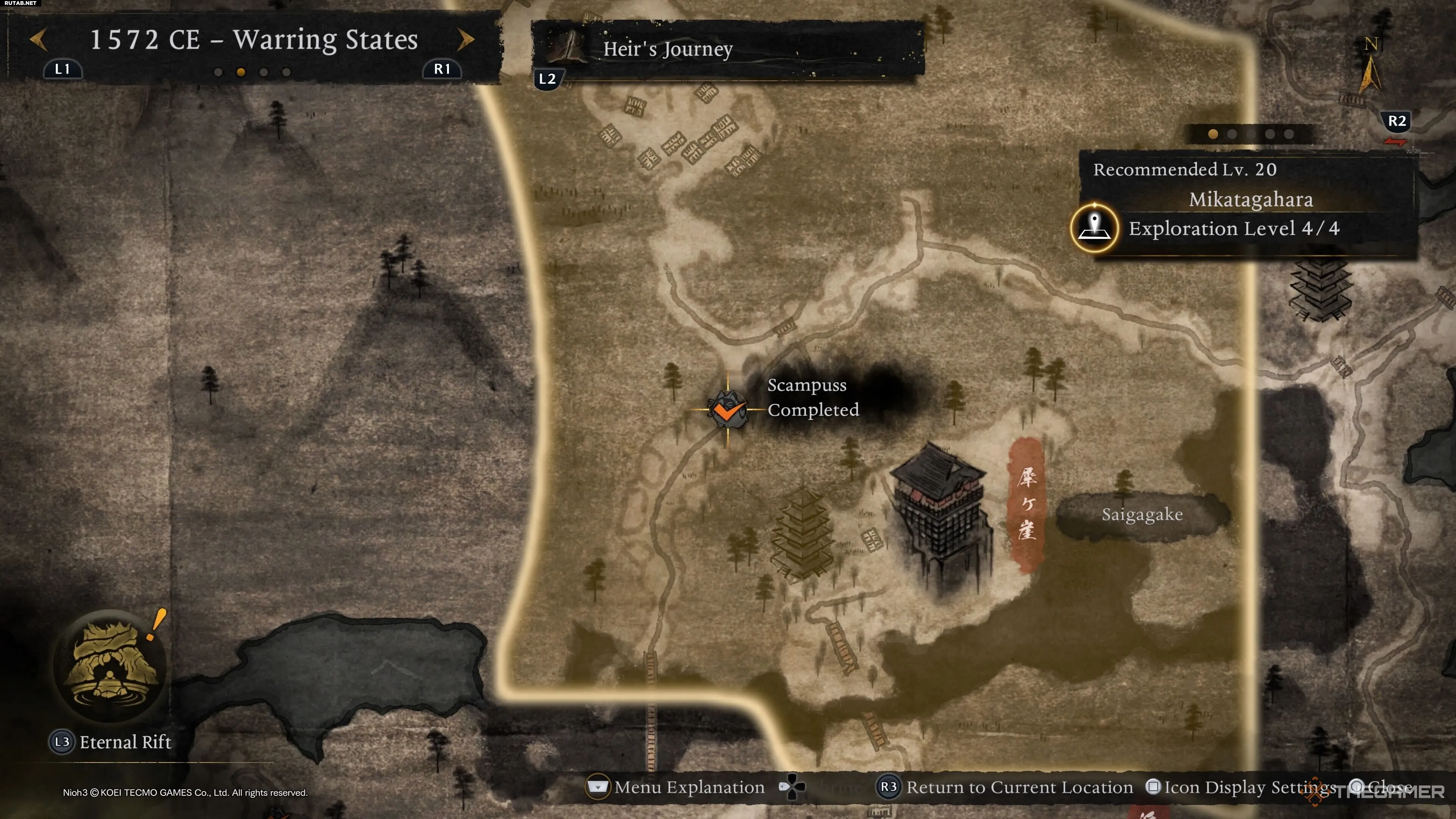 Скампус Микатагахары находится довольно близко к Святилищу Лагеря Токугава. Отсюда развернитесь и вернитесь назад по тропе, чтобы найти Скампуса, и снова отправляйтесь за ним в погоню.