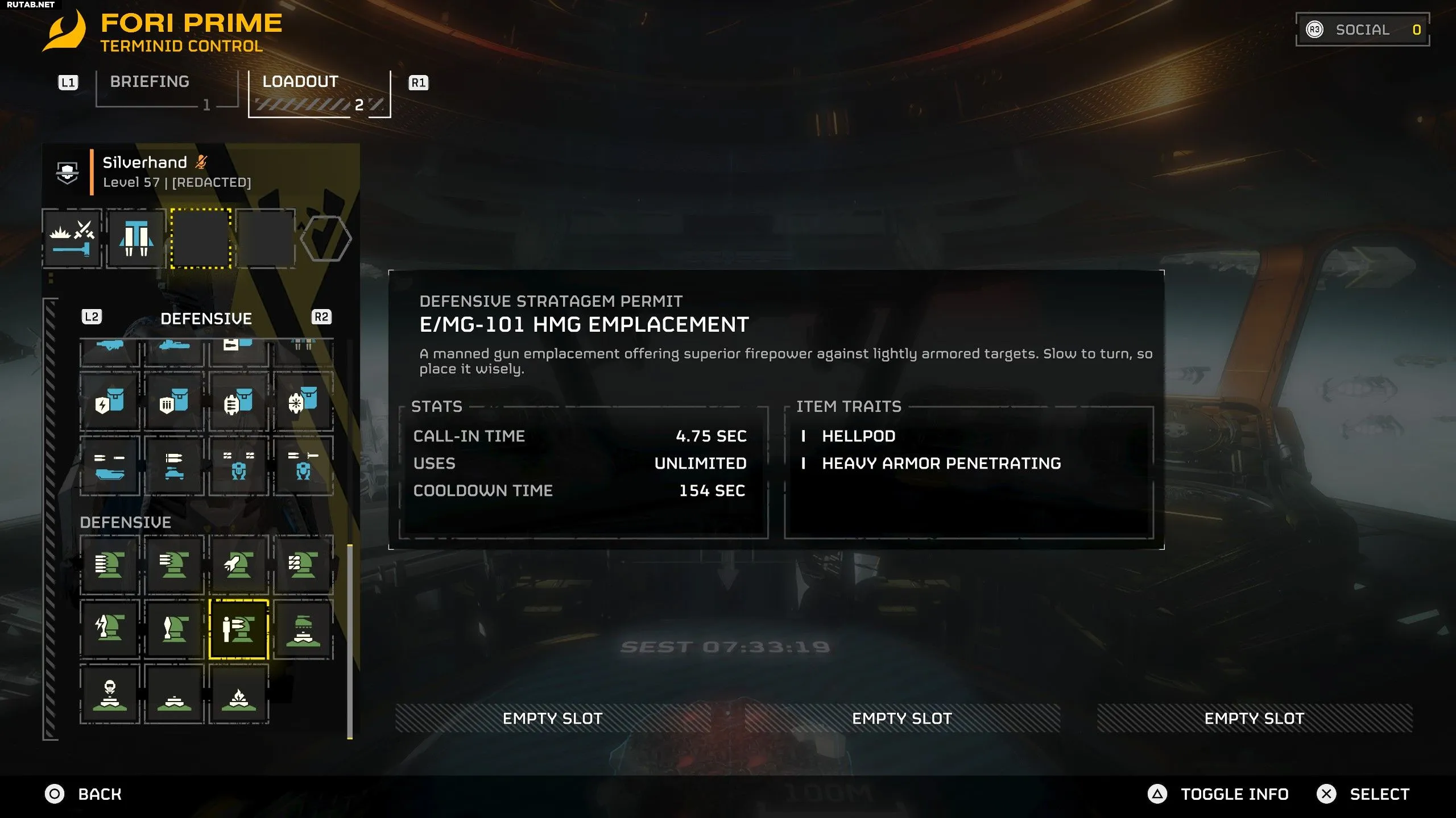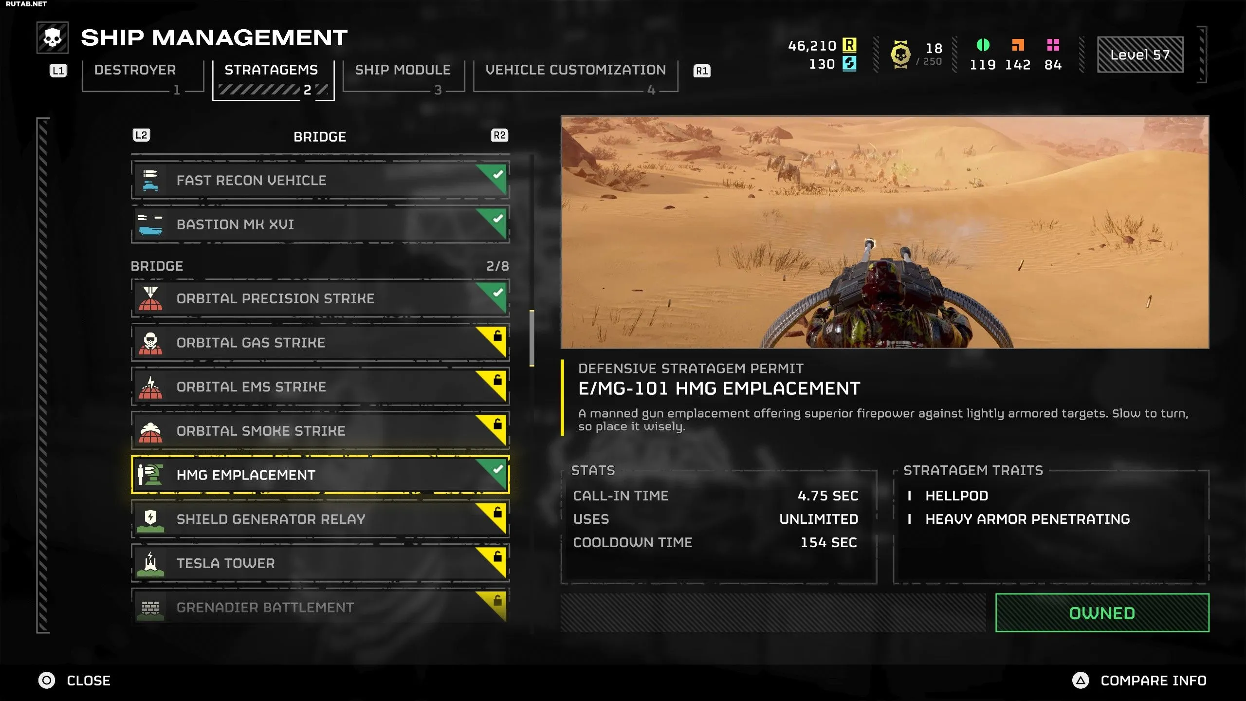 HMG Emplacement — это стратагема, которую можно купить за 10 000 ордерных талонов после достижения 10-го уровня. Выполнив оба условия, зайдите в меню управления кораблем и приобретите HMG Emplacement в разделе стратагем на мостике.