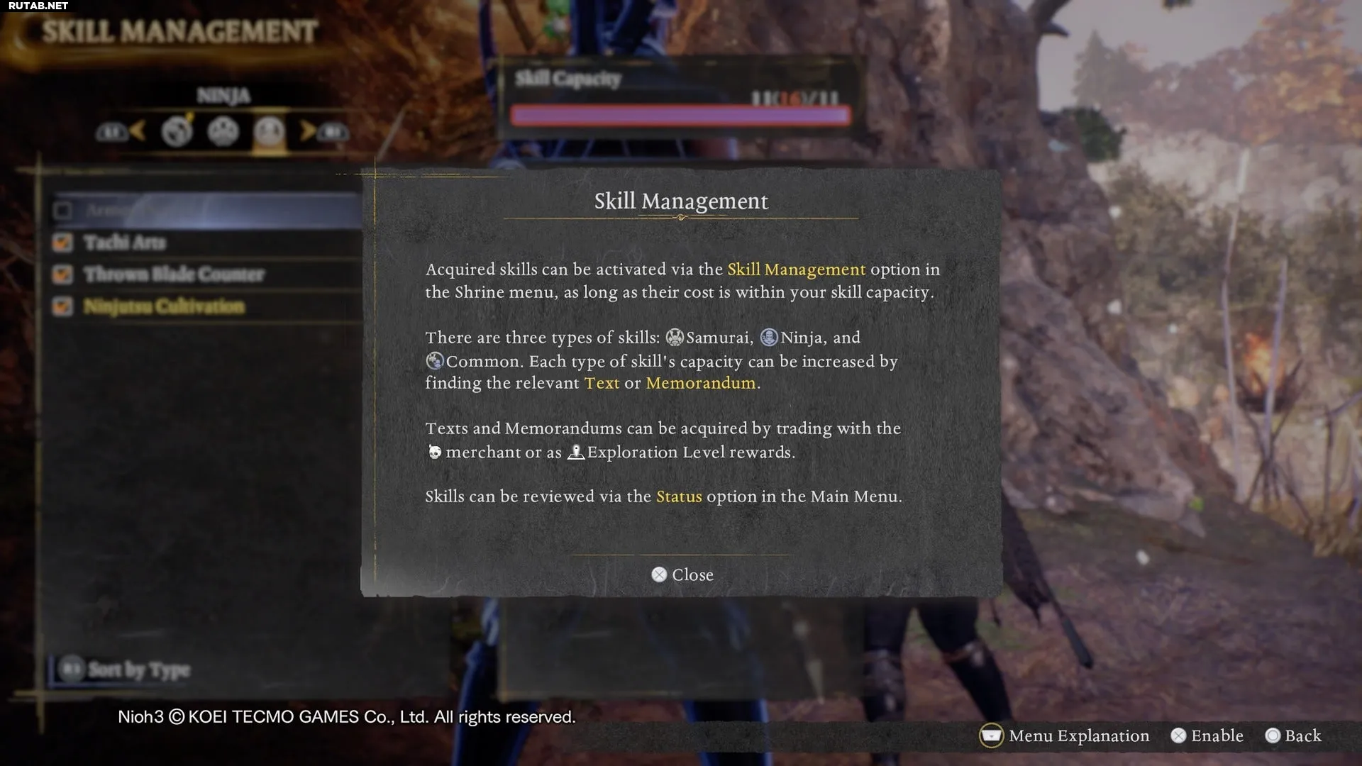 Умения можно экипировать в меню «Управление умениями» у алтаря. Они предоставляют самые разные полезные усиления. Умения ниндзя могут повышать атаку, восстанавливать Ки или позволять метать кунаи после удара. Умения самурая, в свою очередь, улучшают защиту, снижают получаемый во время атаки урон и так далее. Некоторые умения доступны для обоих стилей: они позволяют получать больше Амриты за бои или даже создать сборку, основанную на ударах голыми кулаками без оружия. В игре есть множество интересных умений, поэтому не забывайте регулярно их проверять!