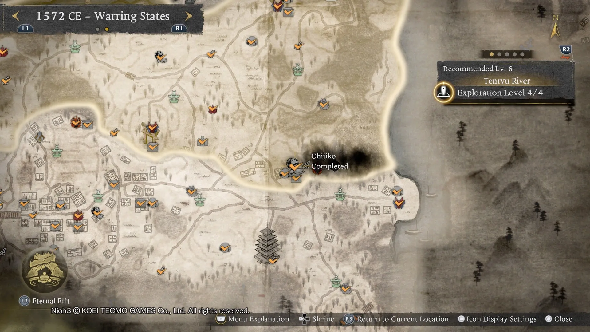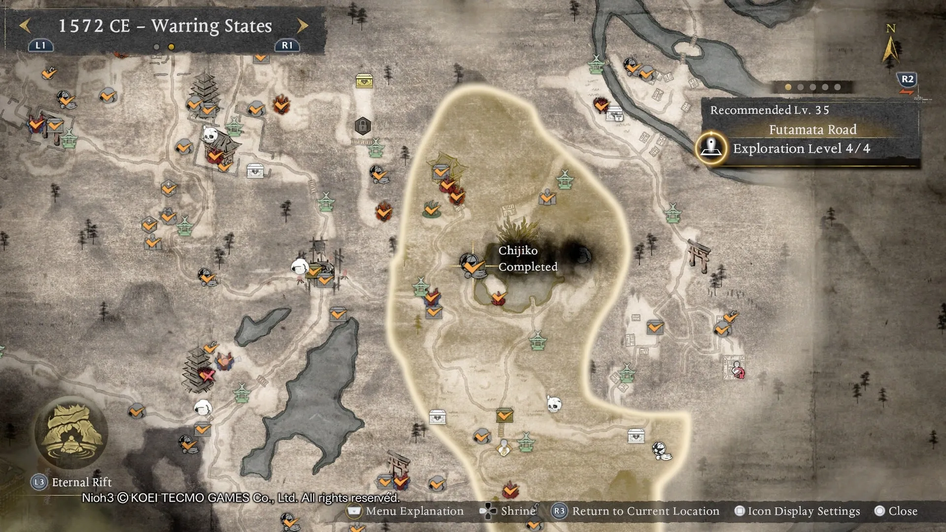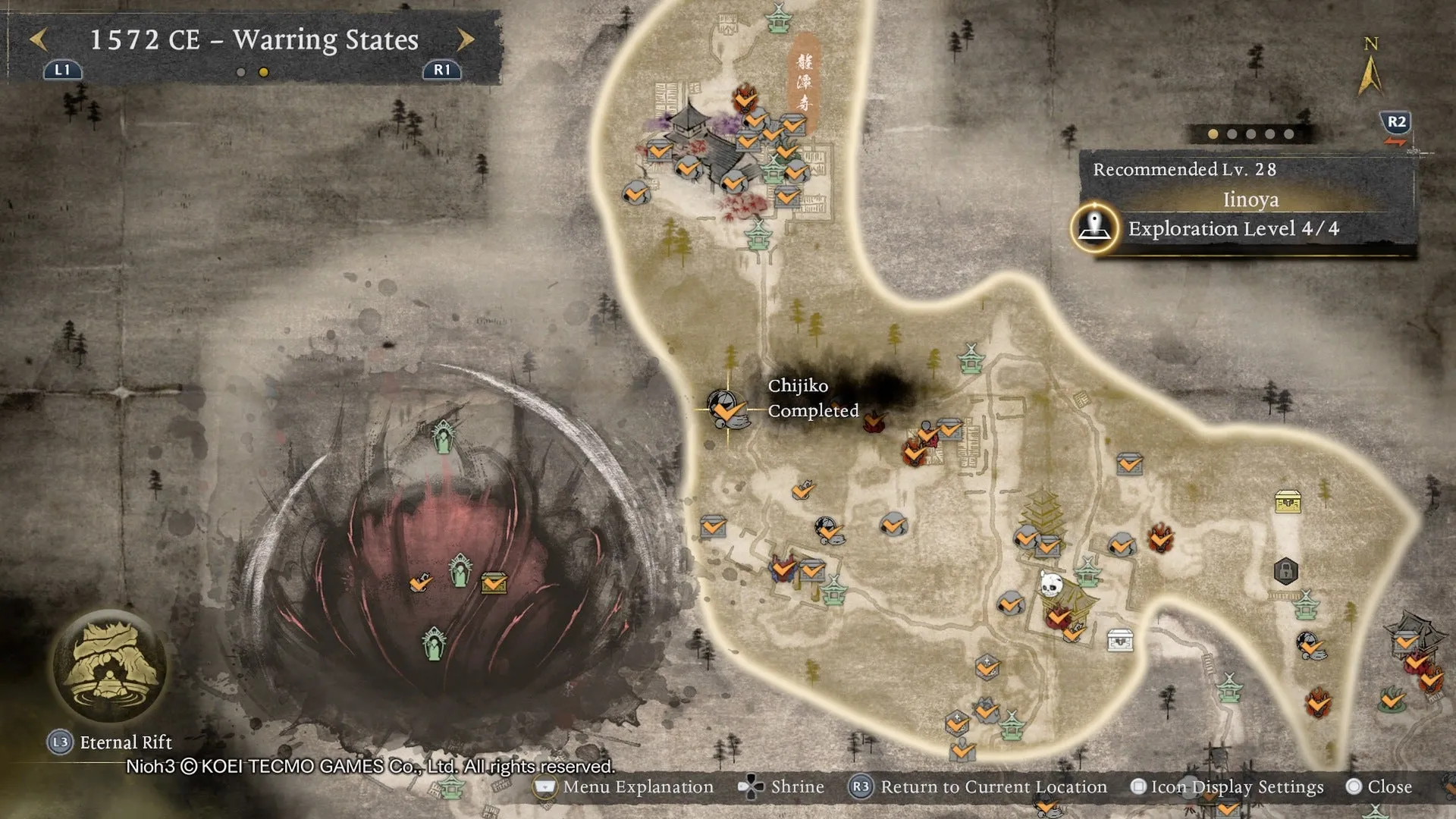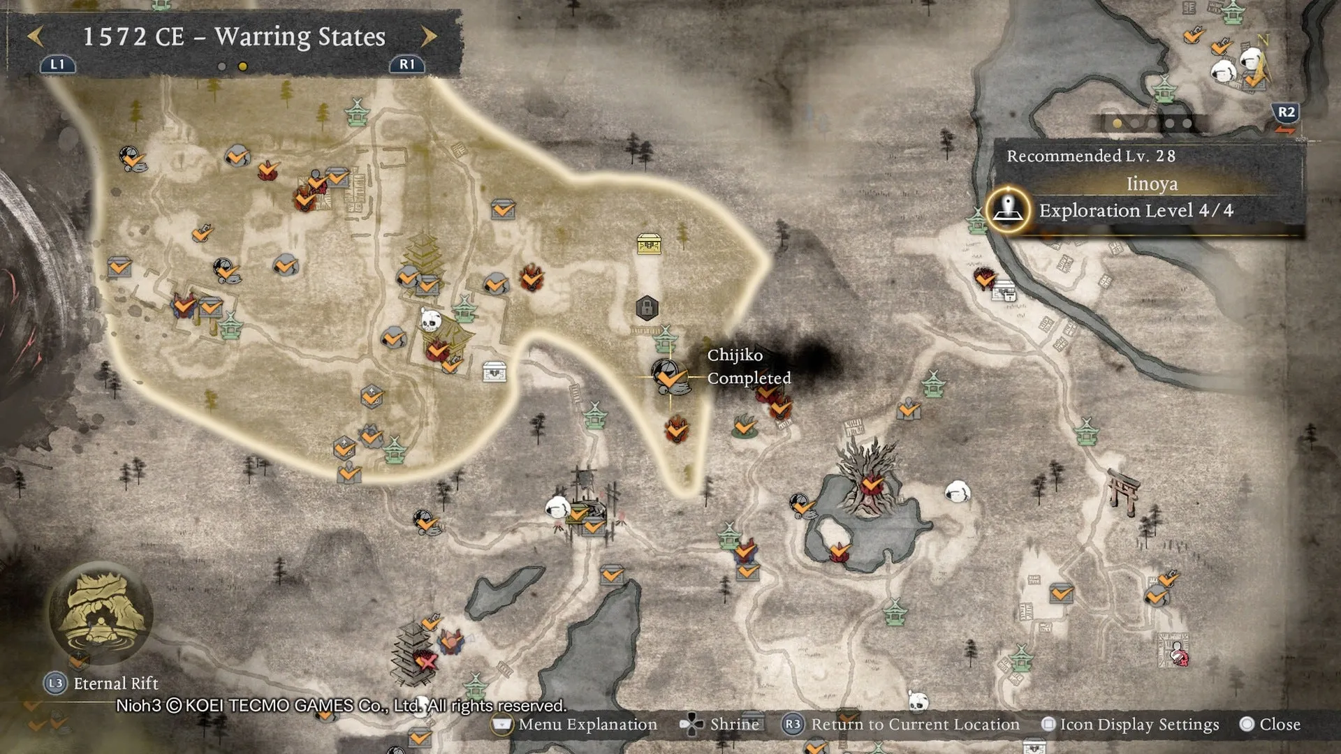| «Воюющие государства», Ииноя: Находится в области к югу от святилища Главные Врата храма Рётан. От святилища развернитесь и идите обратно по тропе, пока не попадете на открытую площадку; здесь и находится Чидзико. |