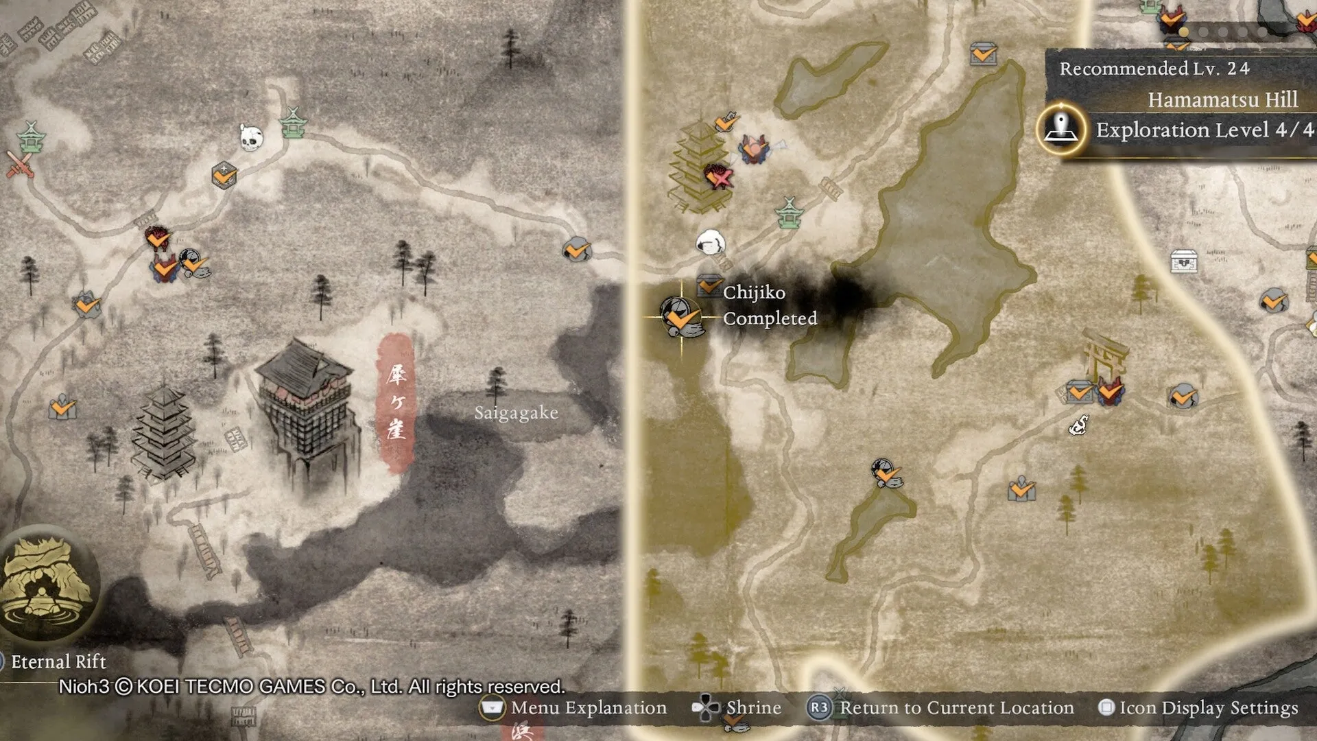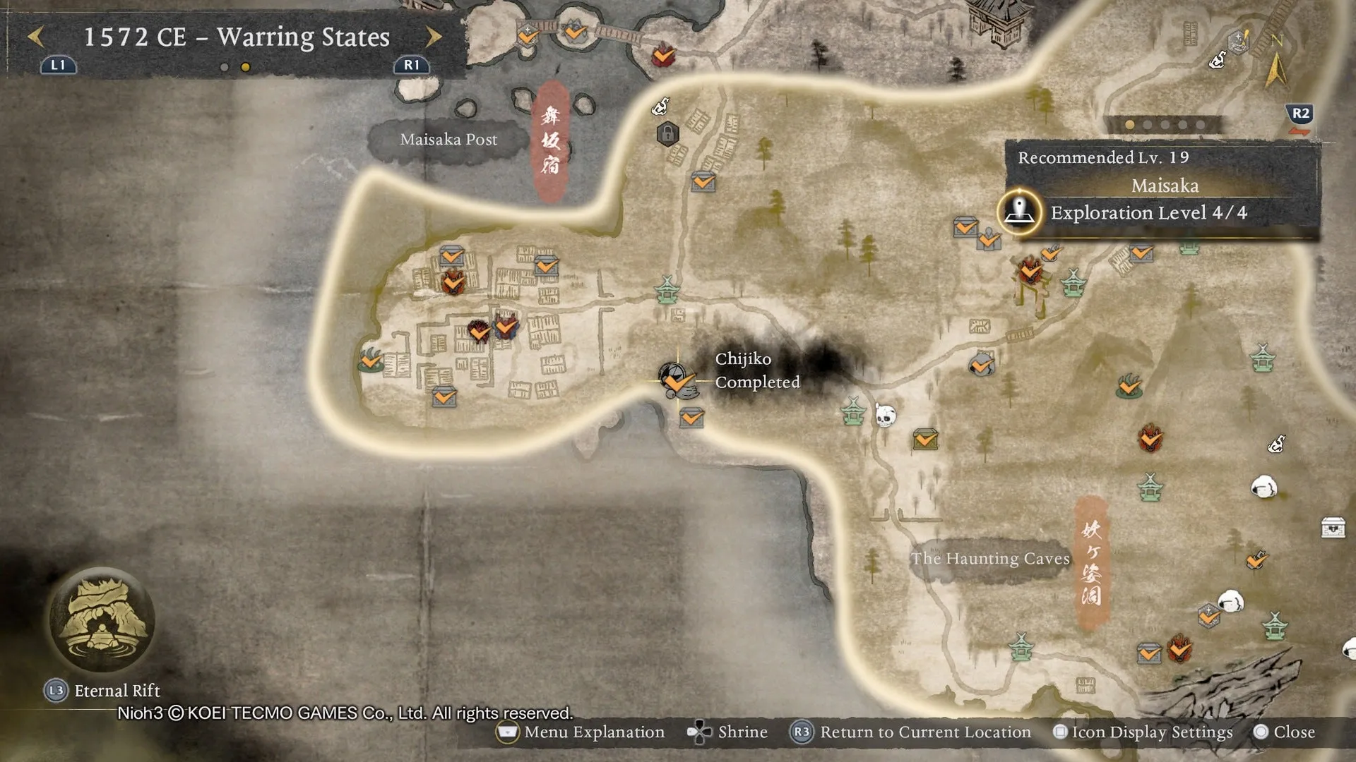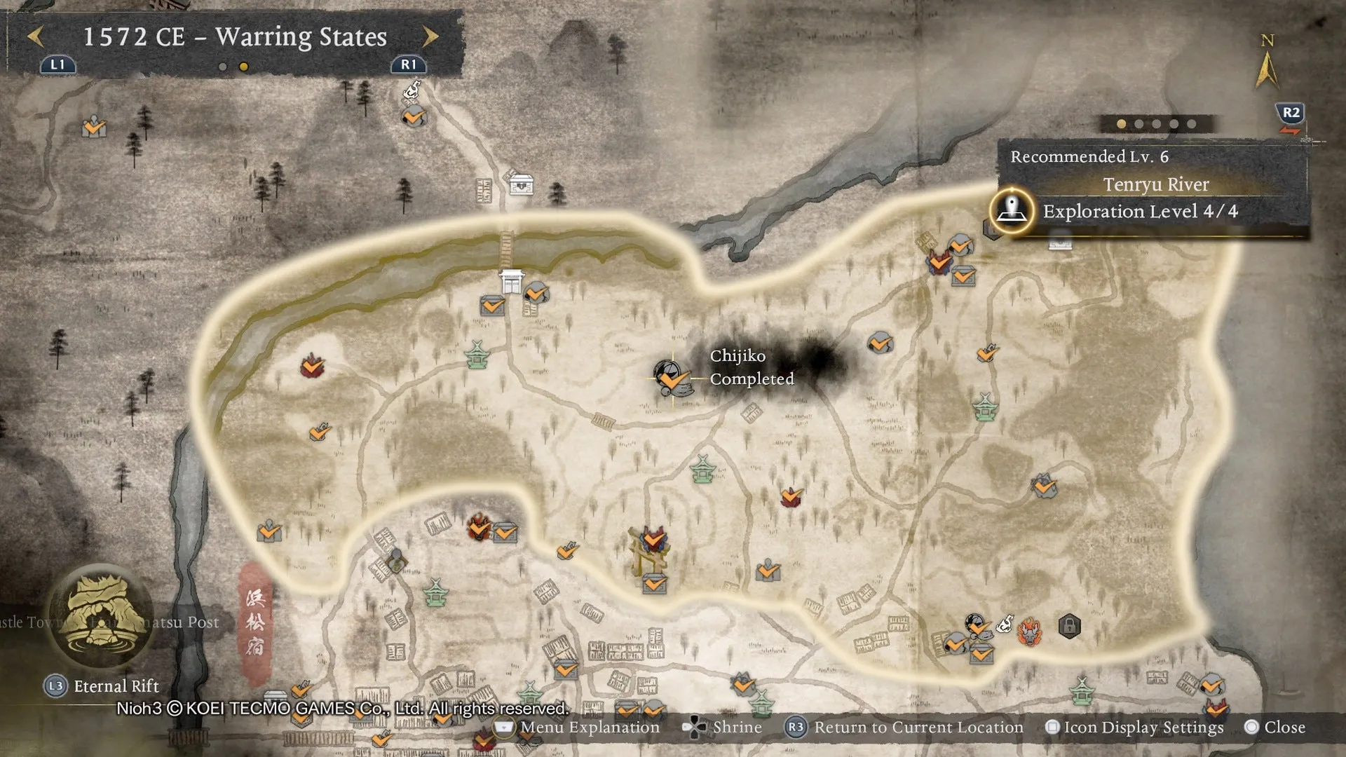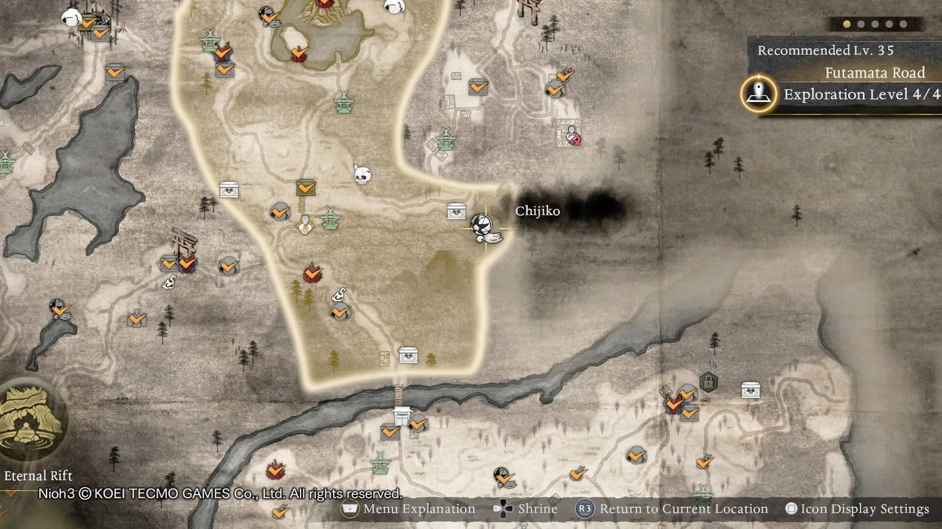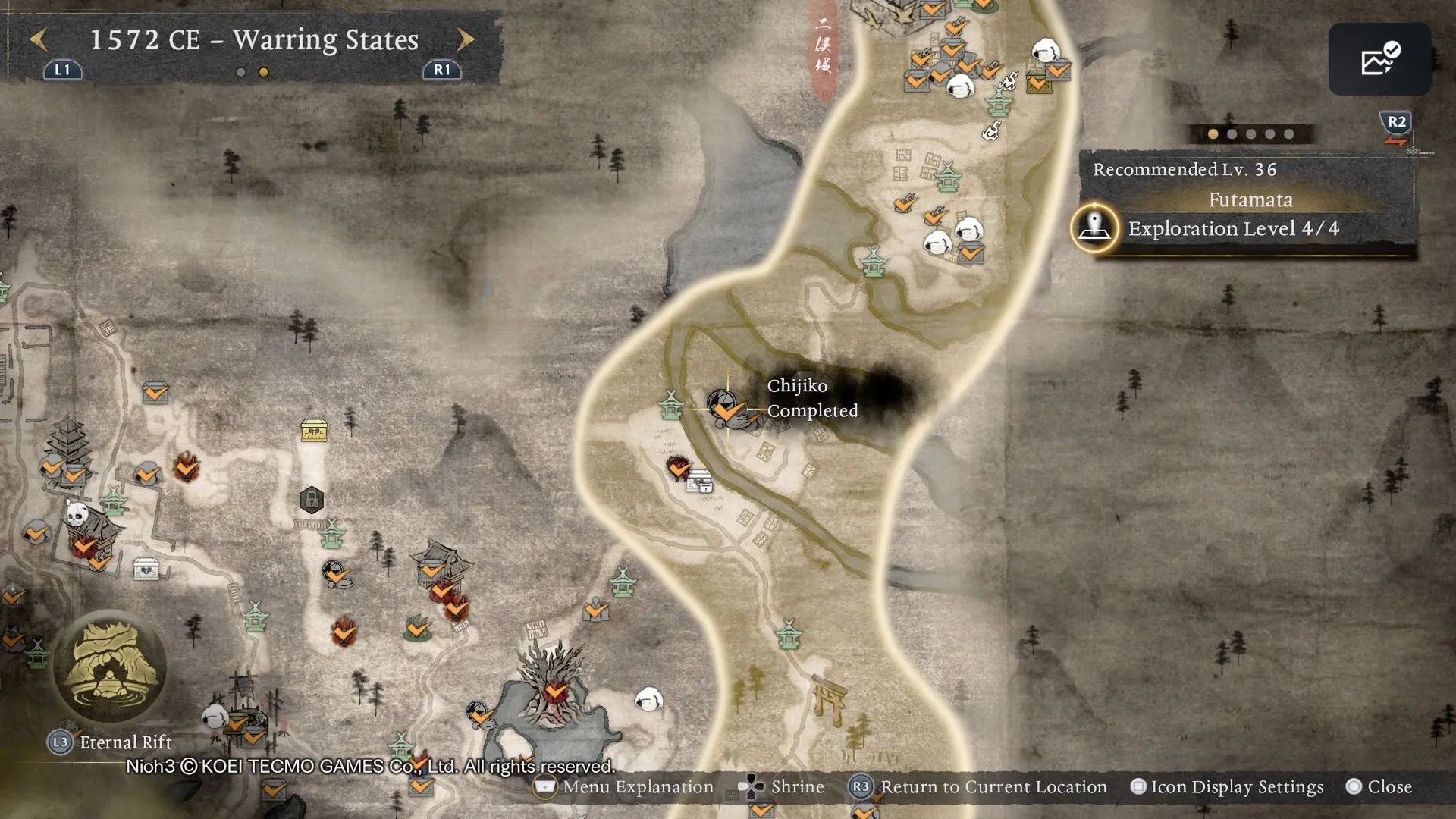 | «Воюющие государства», Ииноя: Находится в области к югу от святилища Главные Врата храма Рётан. От святилища развернитесь и идите обратно по тропе, пока не попадете на открытую площадку; здесь и находится Чидзико. |