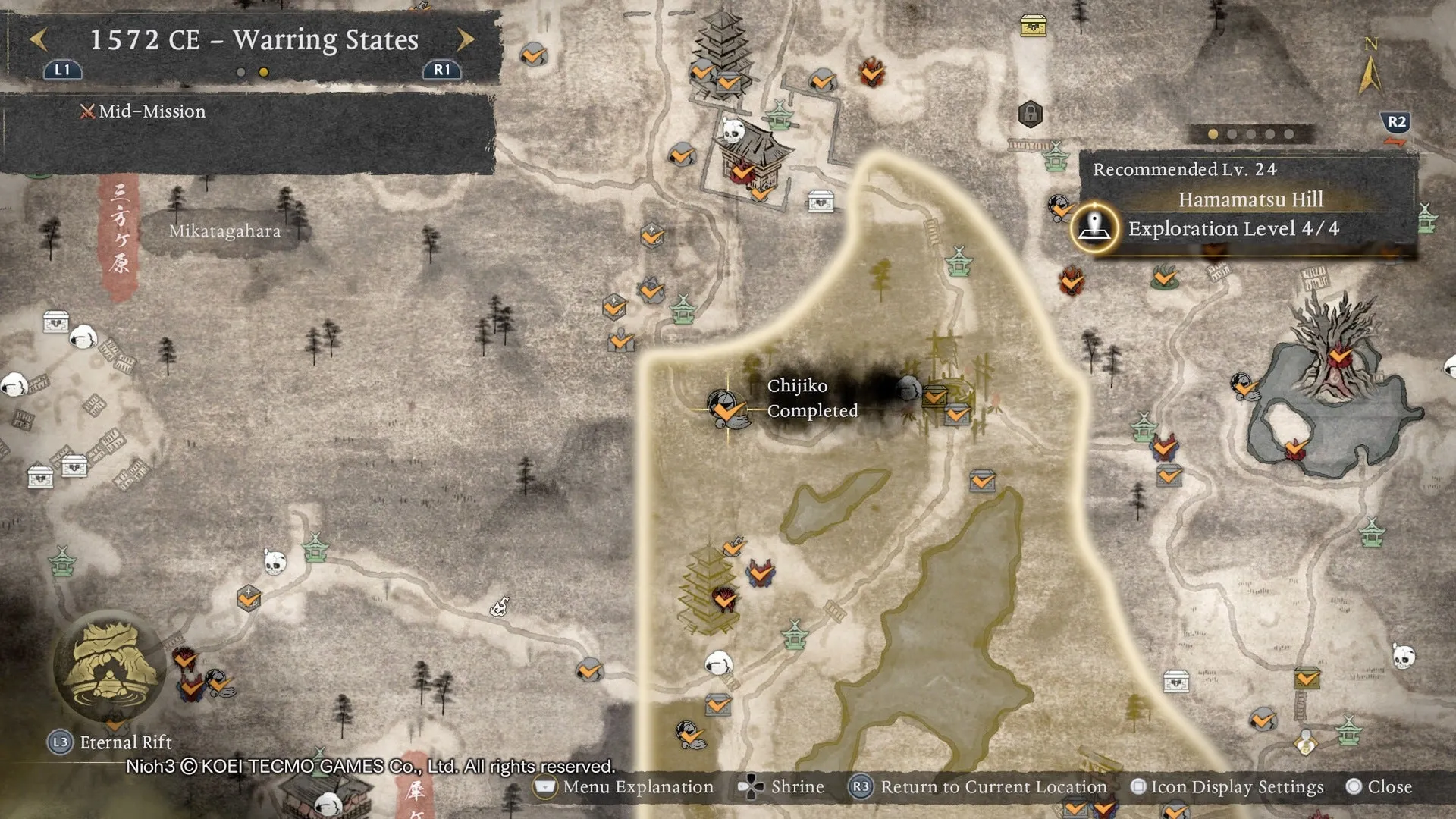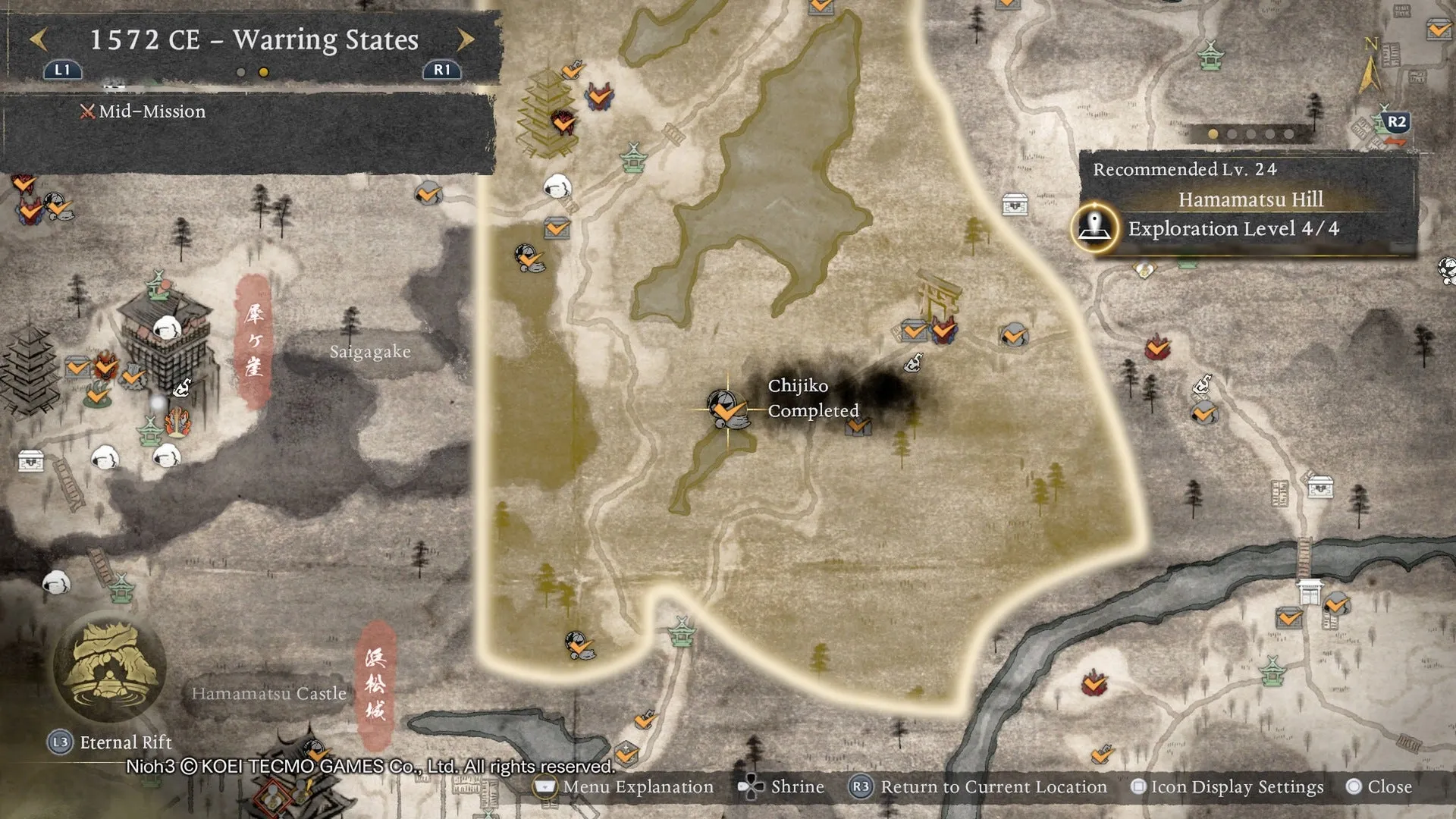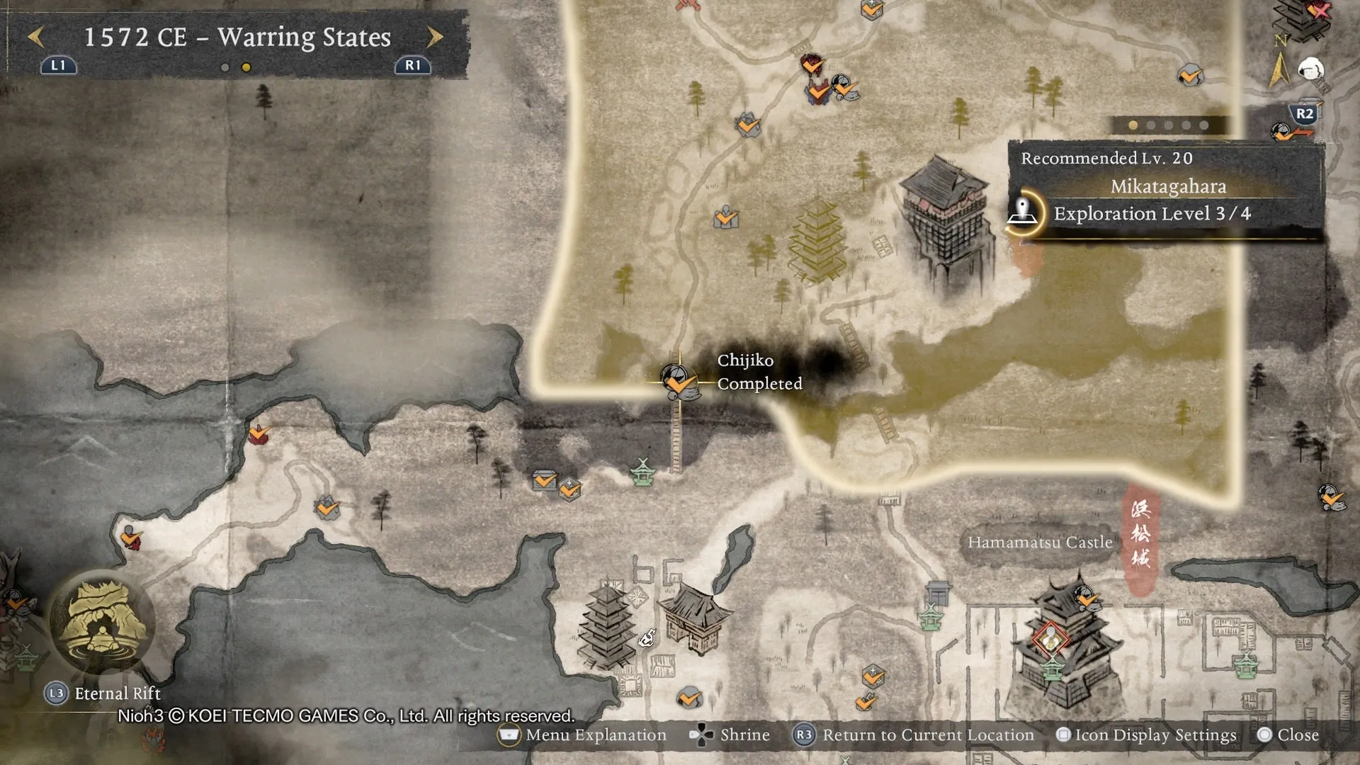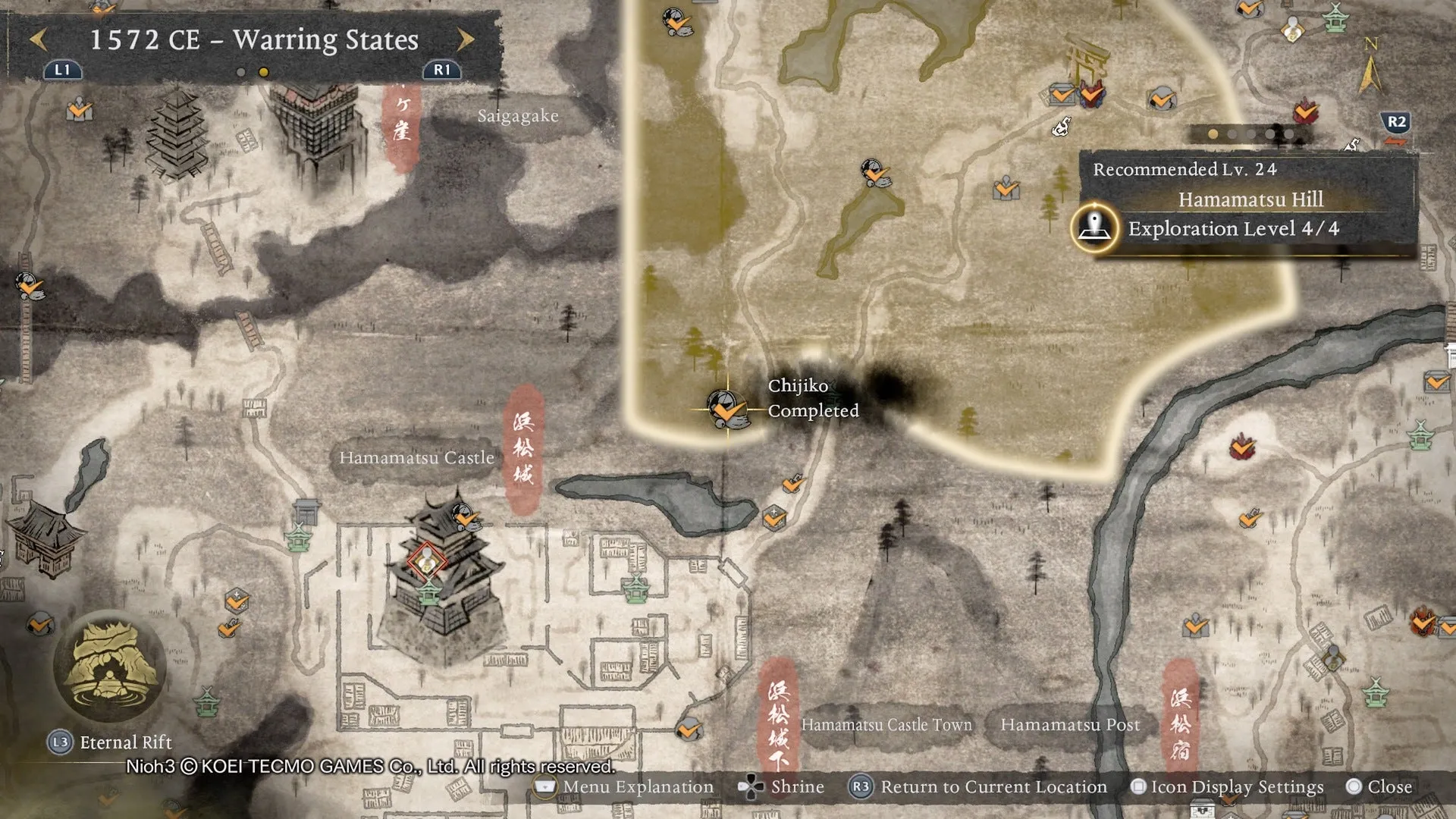 | «Воюющие государства», холм Хамамацу: Парит к юго-западу от Развилки Микатагахара, к югу от пагоды на карте. |