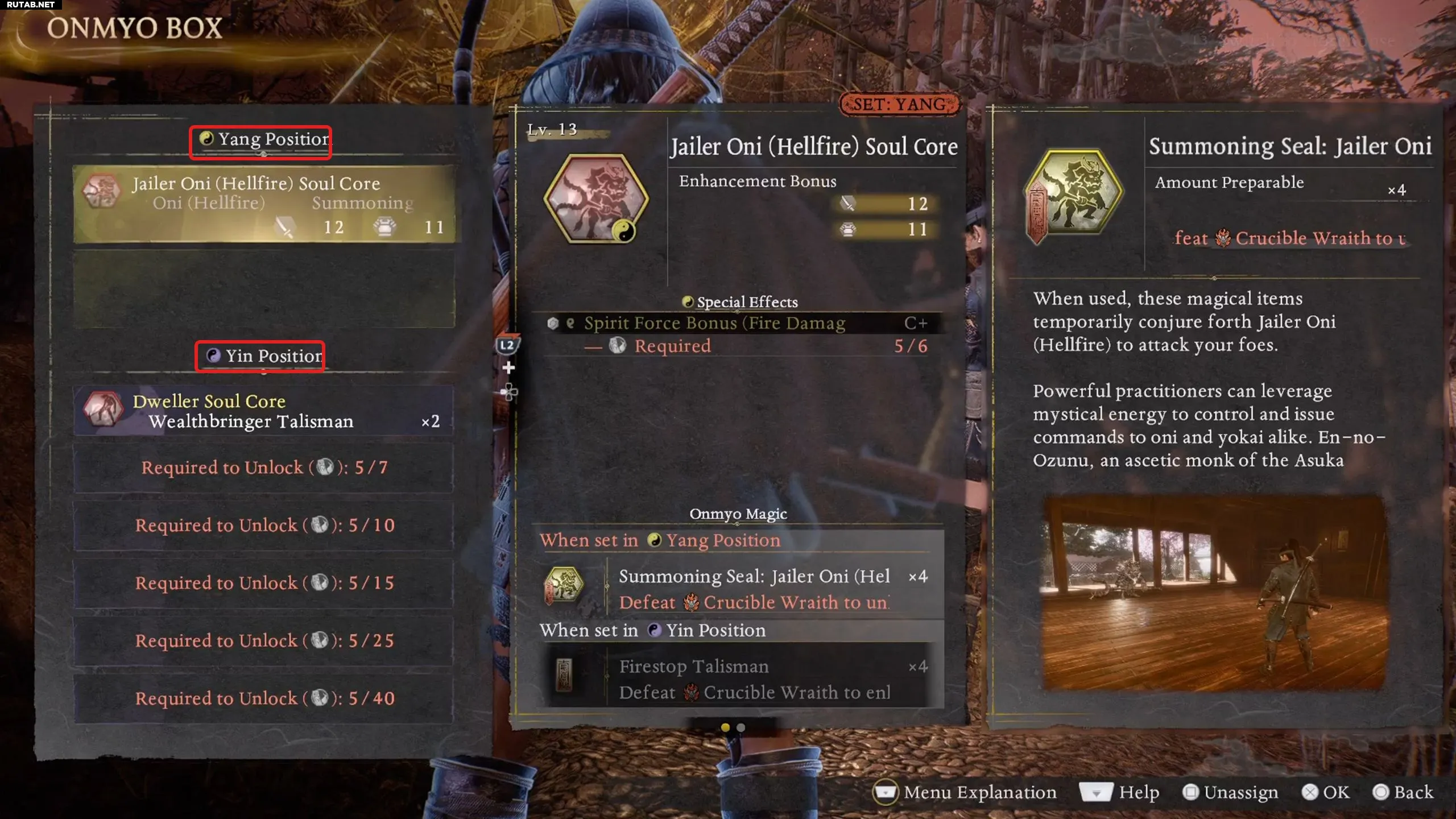 Существует позиция Ян и позиция Инь. Размещение ядра в позиции Ян позволяет призвать самого ёкая на несколько секунд для помощи в бою, используя Печать призыва. Установка ядра в позиции Инь даёт предмет магии Оммё, который может усилить вас или атаковать врагов. Одно ядро можно разместить только в одной позиции, если у вас нет его дубликата.