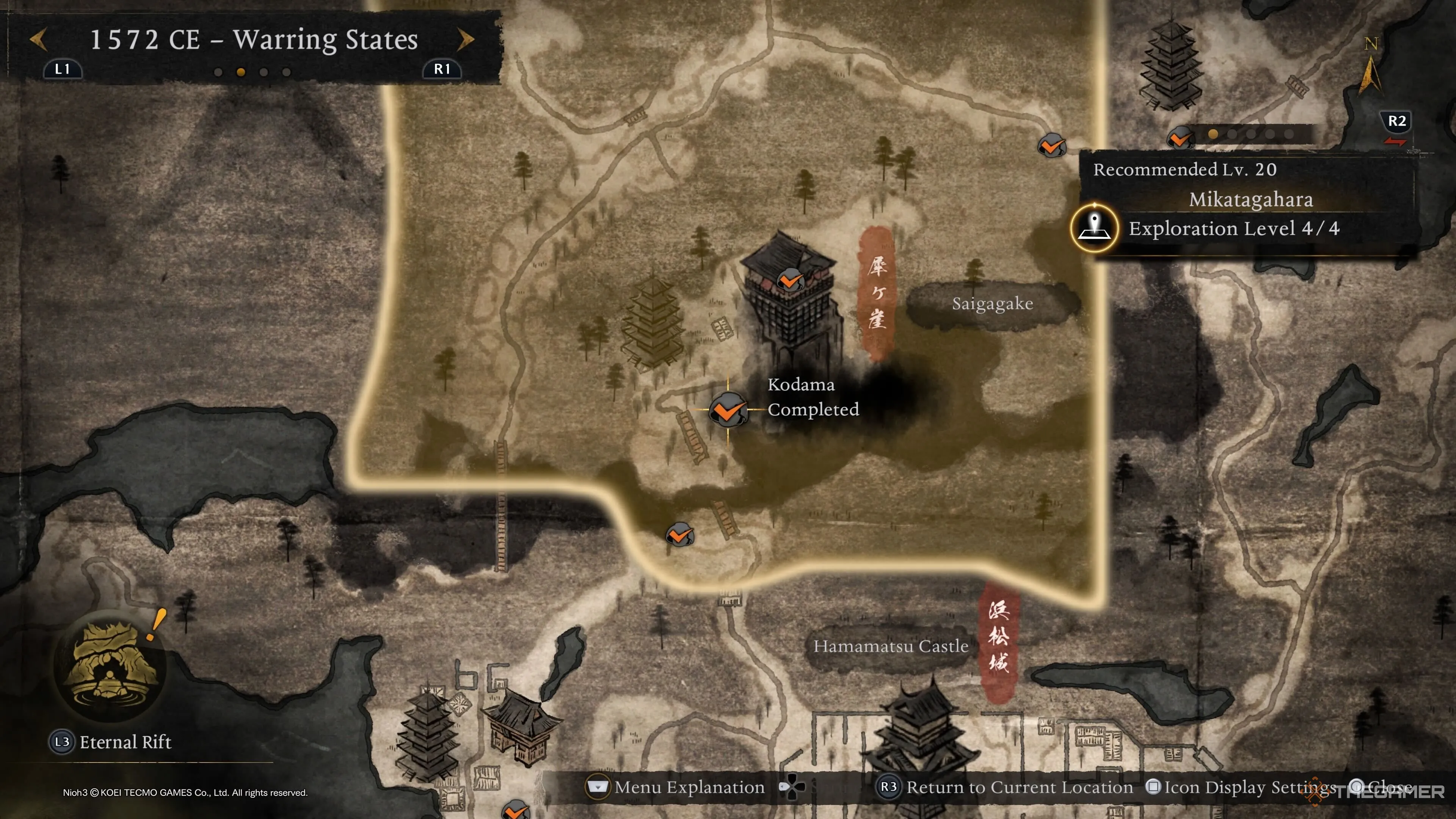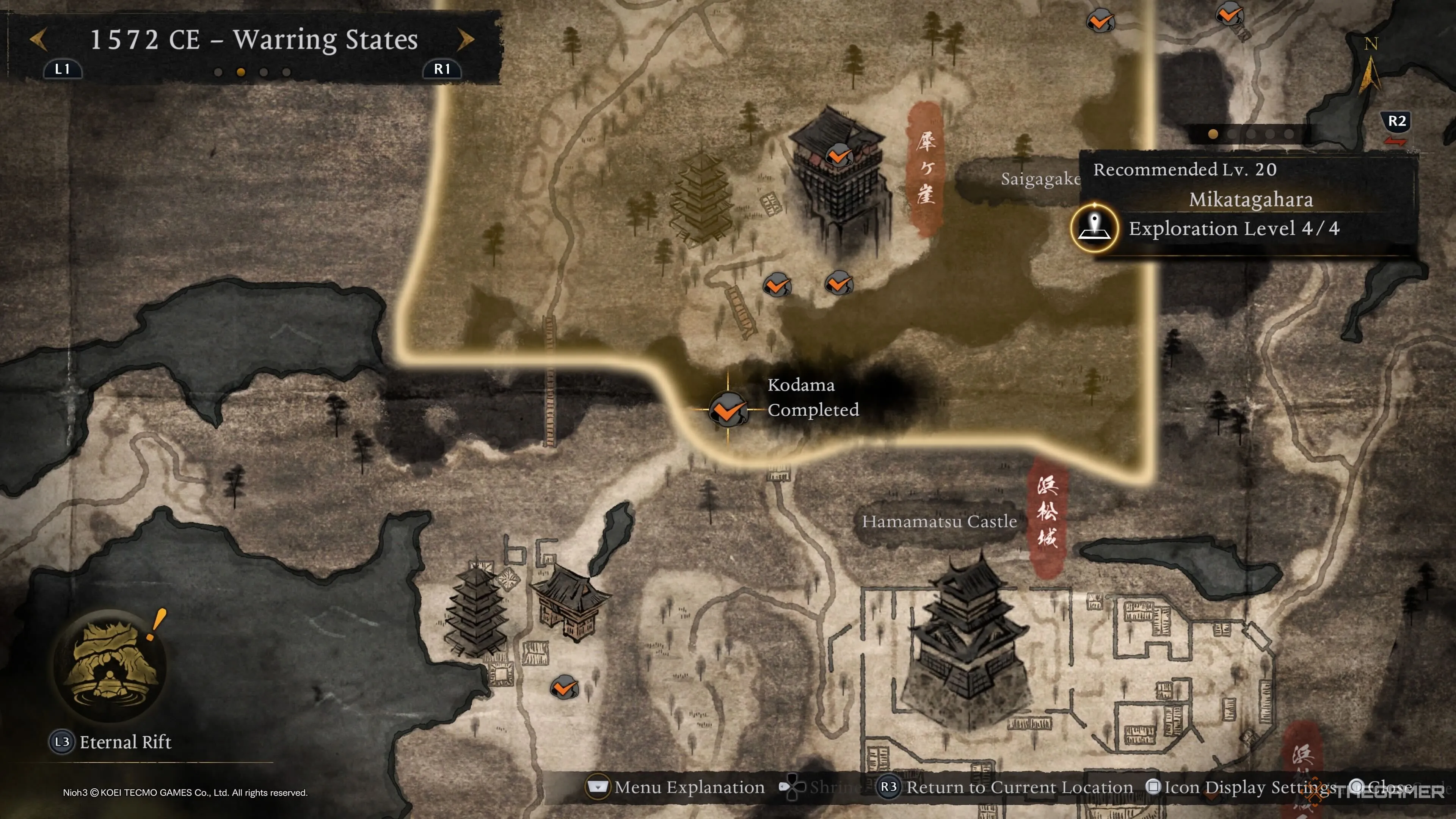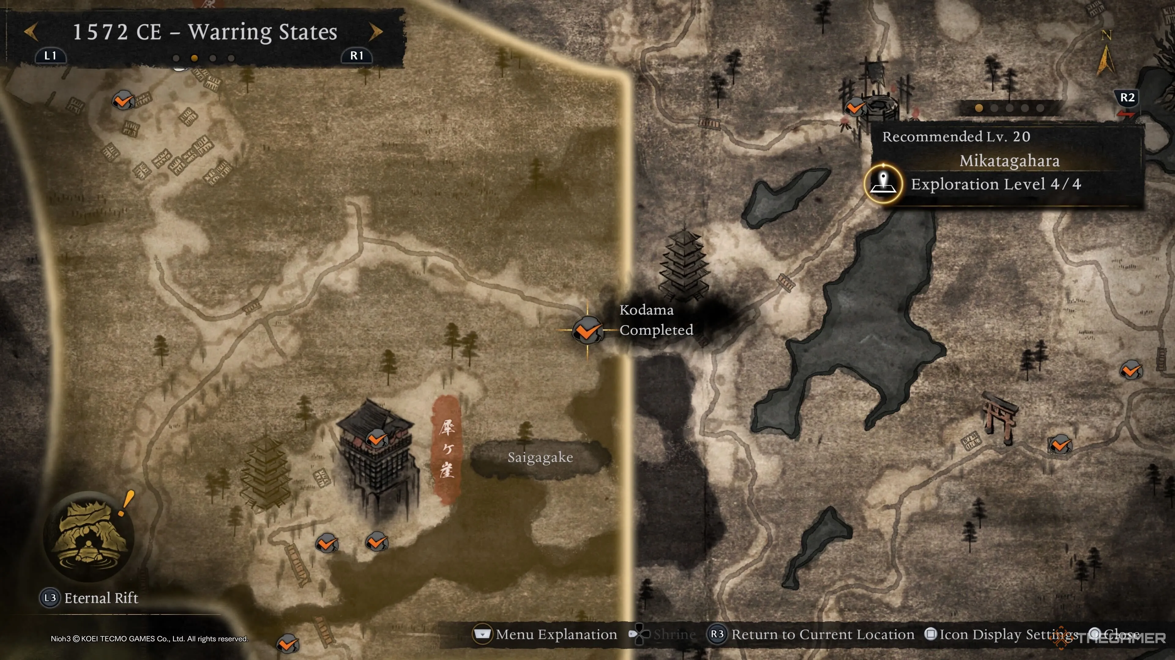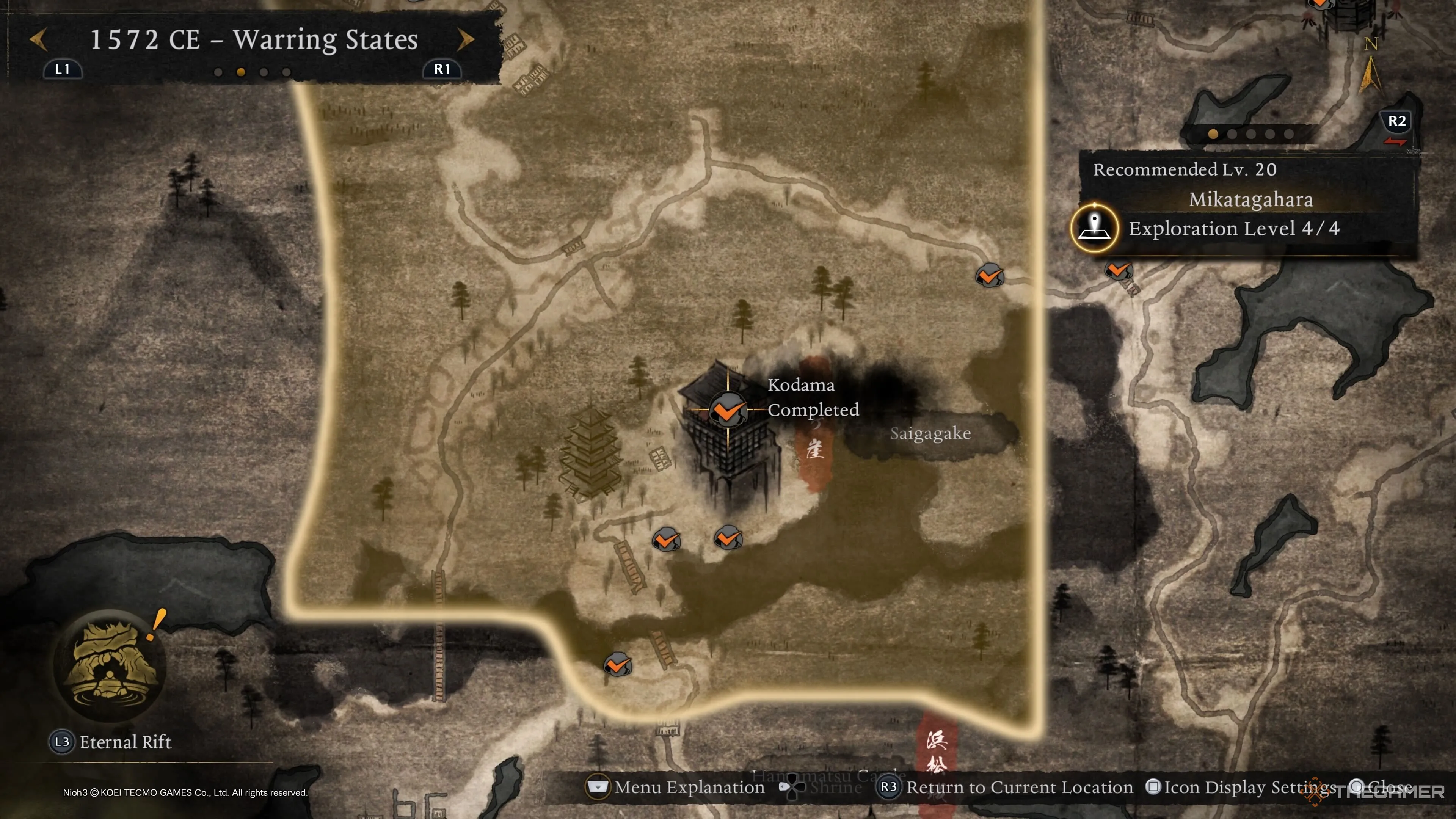 Первый Кодама в Микатагахаре находится прямо рядом со святилищем у моста Сайгагакэ. Оказавшись здесь, поверните налево и спрыгните на камни внизу, чтобы найти Кодаму.