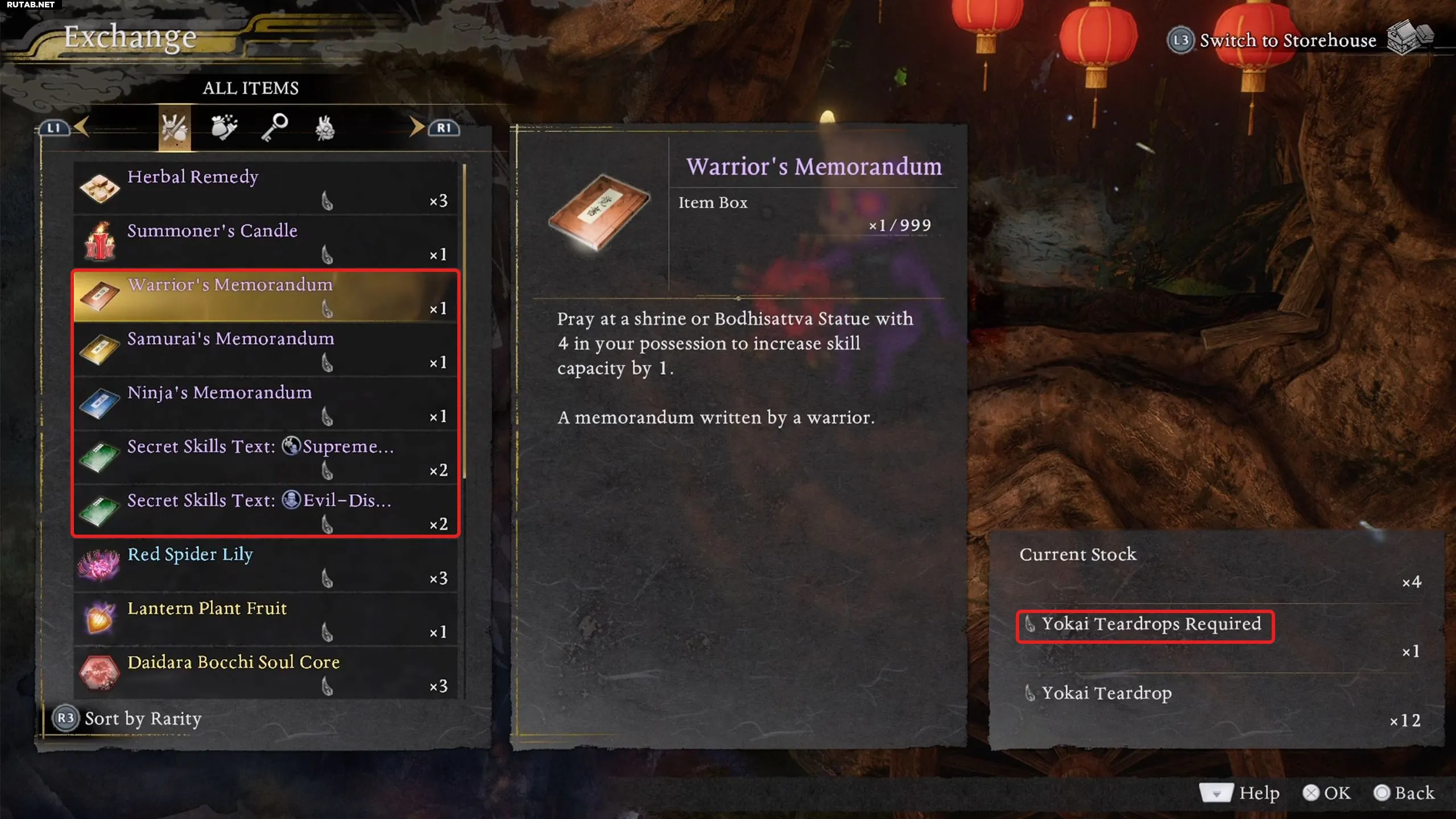 Более надежный способ получить «Манускрипт» — обменять «Слезы ёкая» у торговца. Каждые четыре «Манускрипта» увеличивают емкость навыков на один пункт. В то время как «Манускрипты Самурая» и «Ниндзя» увеличивают емкость своих категорий навыков, «Манускрипт Воина» увеличивает емкость Общих навыков.