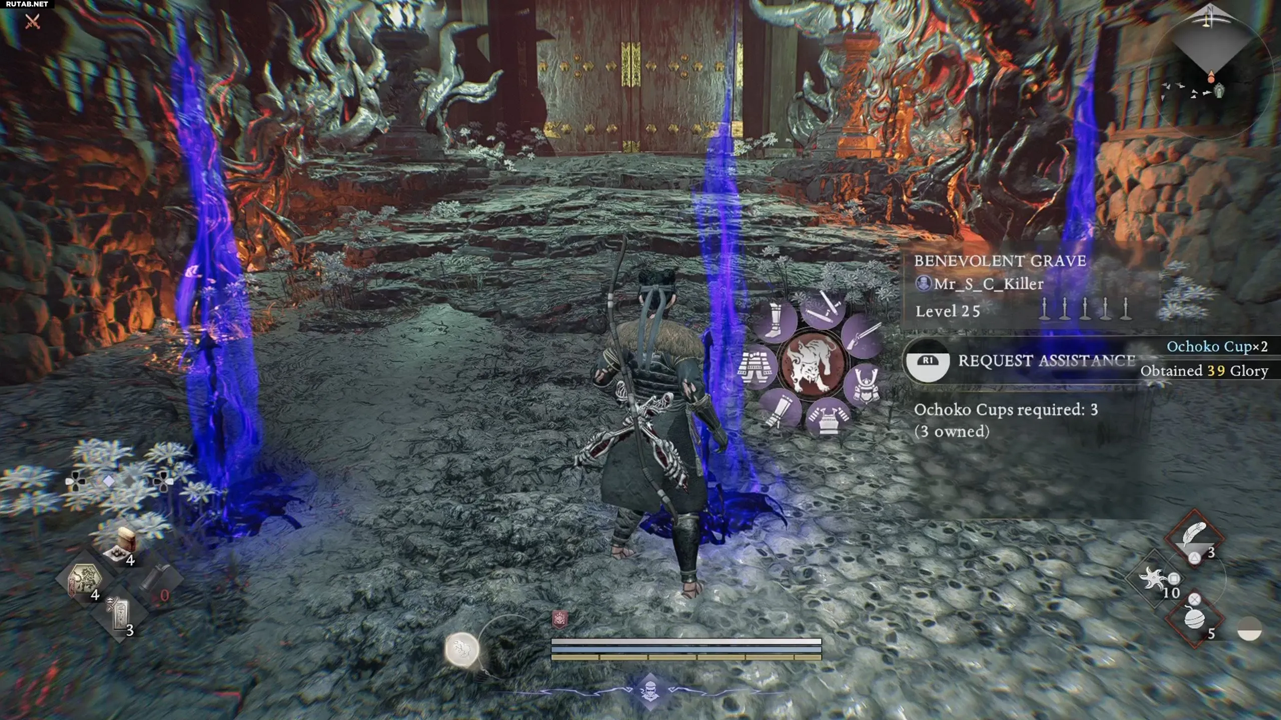 Увидев на земле синюю Благожелательную Могилу, вы можете предложить ей необходимое количество Очоко Чаш, чтобы призвать NPC-помощника. Обычно такие могилы часто встречаются возле логовищ боссов или входов в Царство Тьмы.