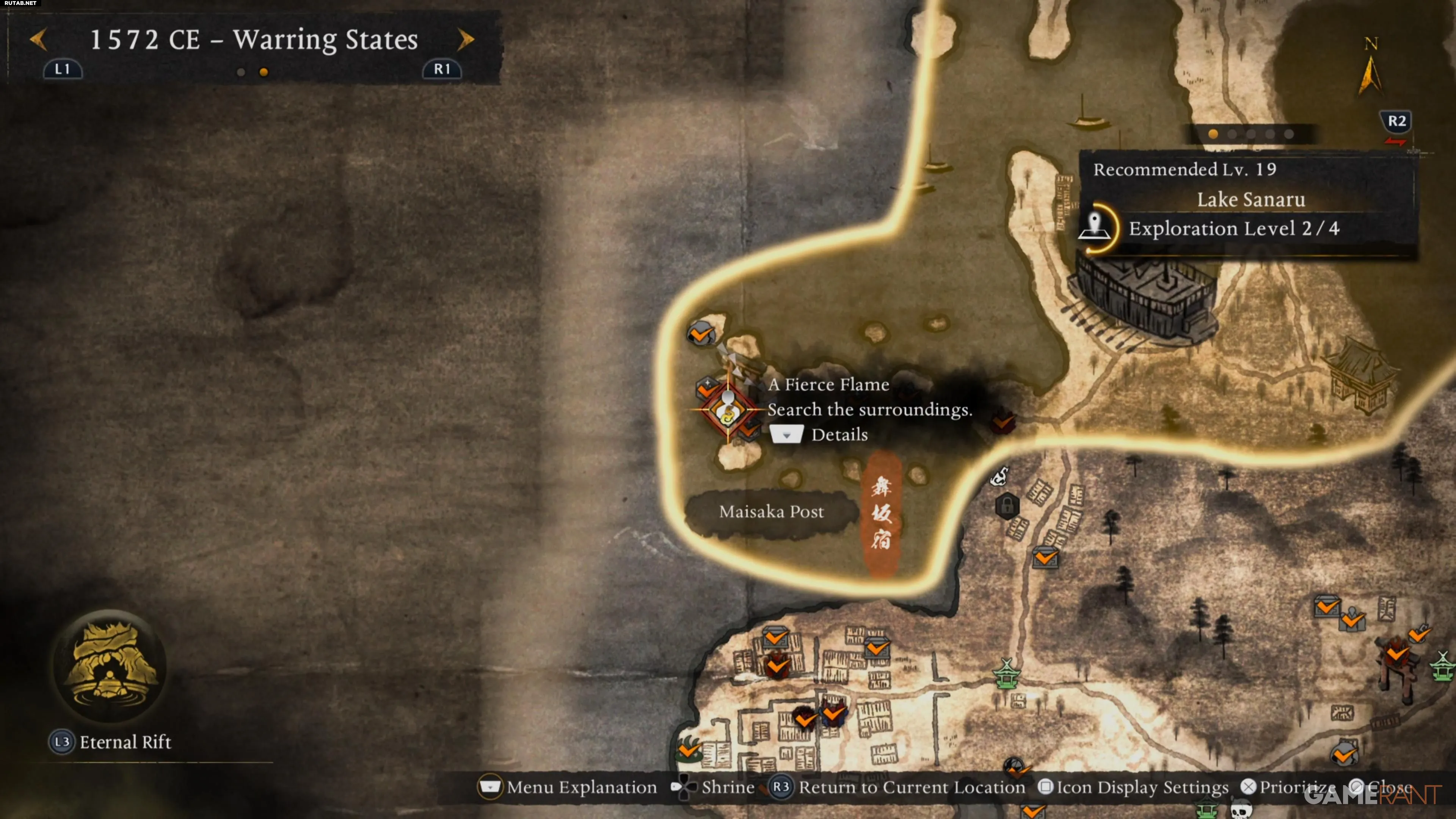 После завершения сюжетного отрезка в Временной Расщелине поговорите с Кузнецом снова. Она попросит вас проверить святилище у озера Санару, что запустит миф «Неистовое пламя». Чтобы добраться до озера Санару, спуститесь в Майсаку, а затем двигайтесь по дороге на север.
