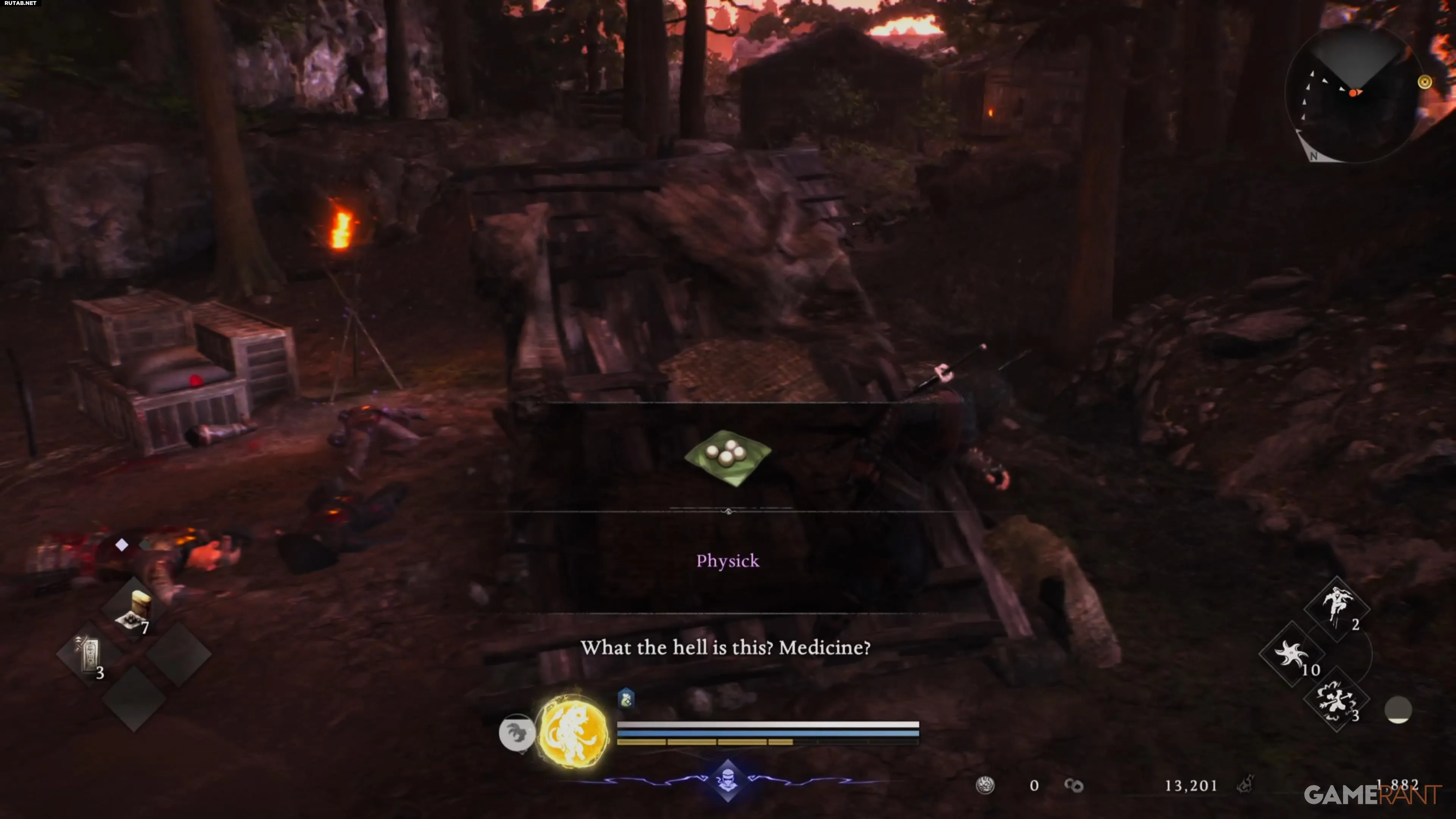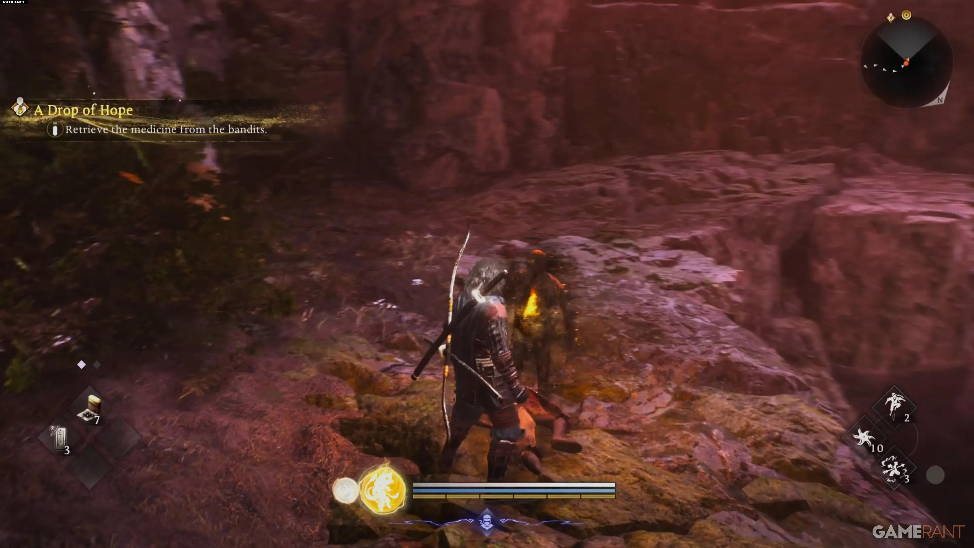 Исследуя локацию «Река Тэнрю», отправляйтесь в её северо-западную часть. Там вы встретите призрак мужчины. Он расскажет, что погиб от рук бандитов и потерял лекарство для своей семьи. После разговора с ним двигайтесь на юг в отмеченную на карте область.