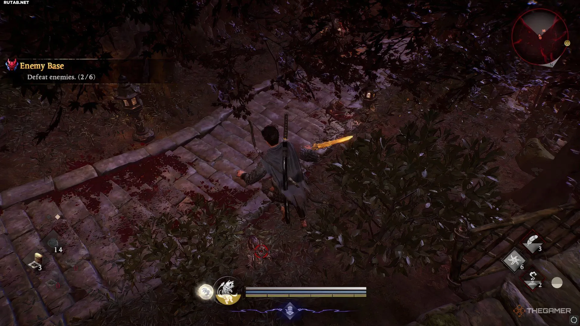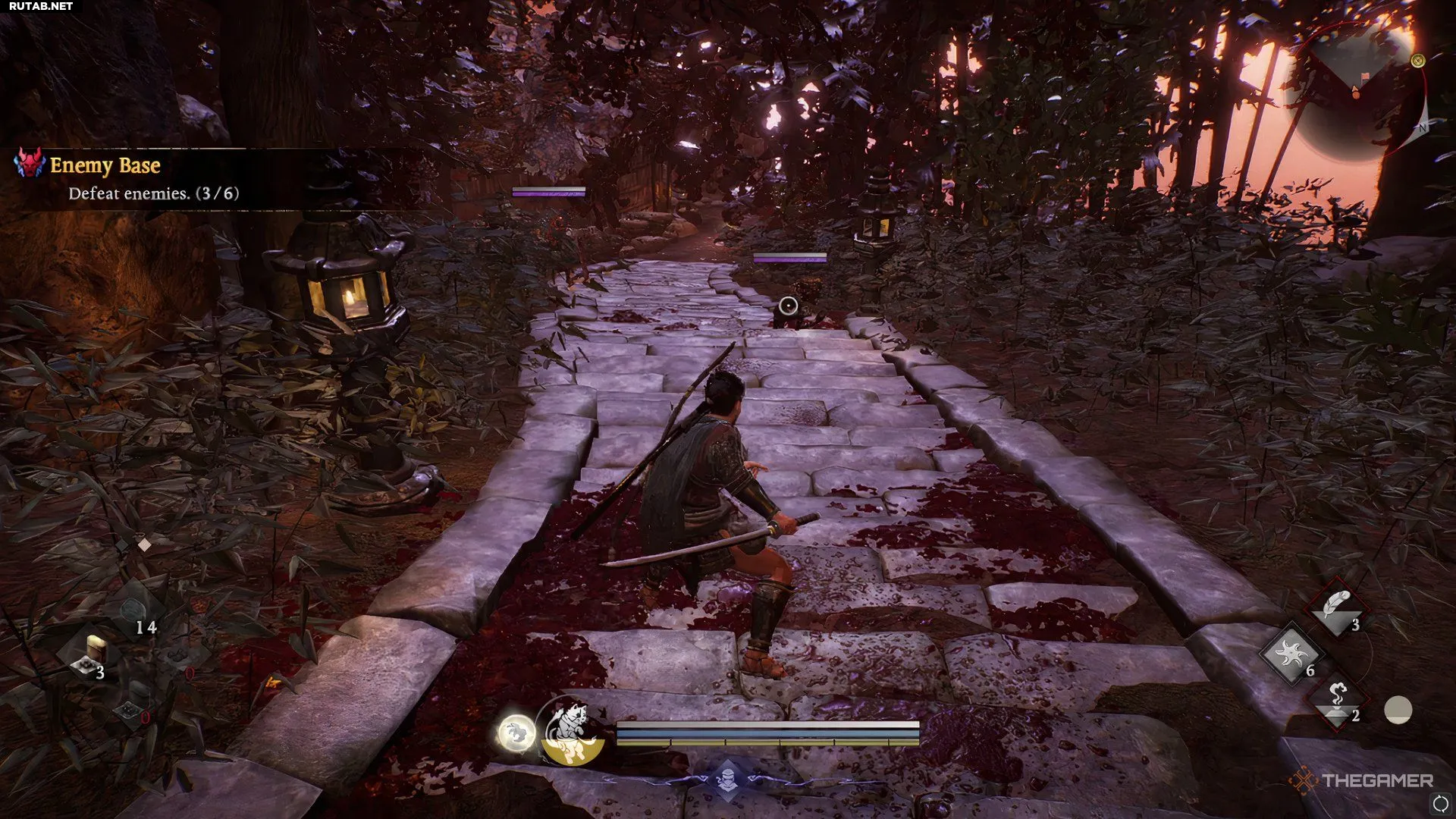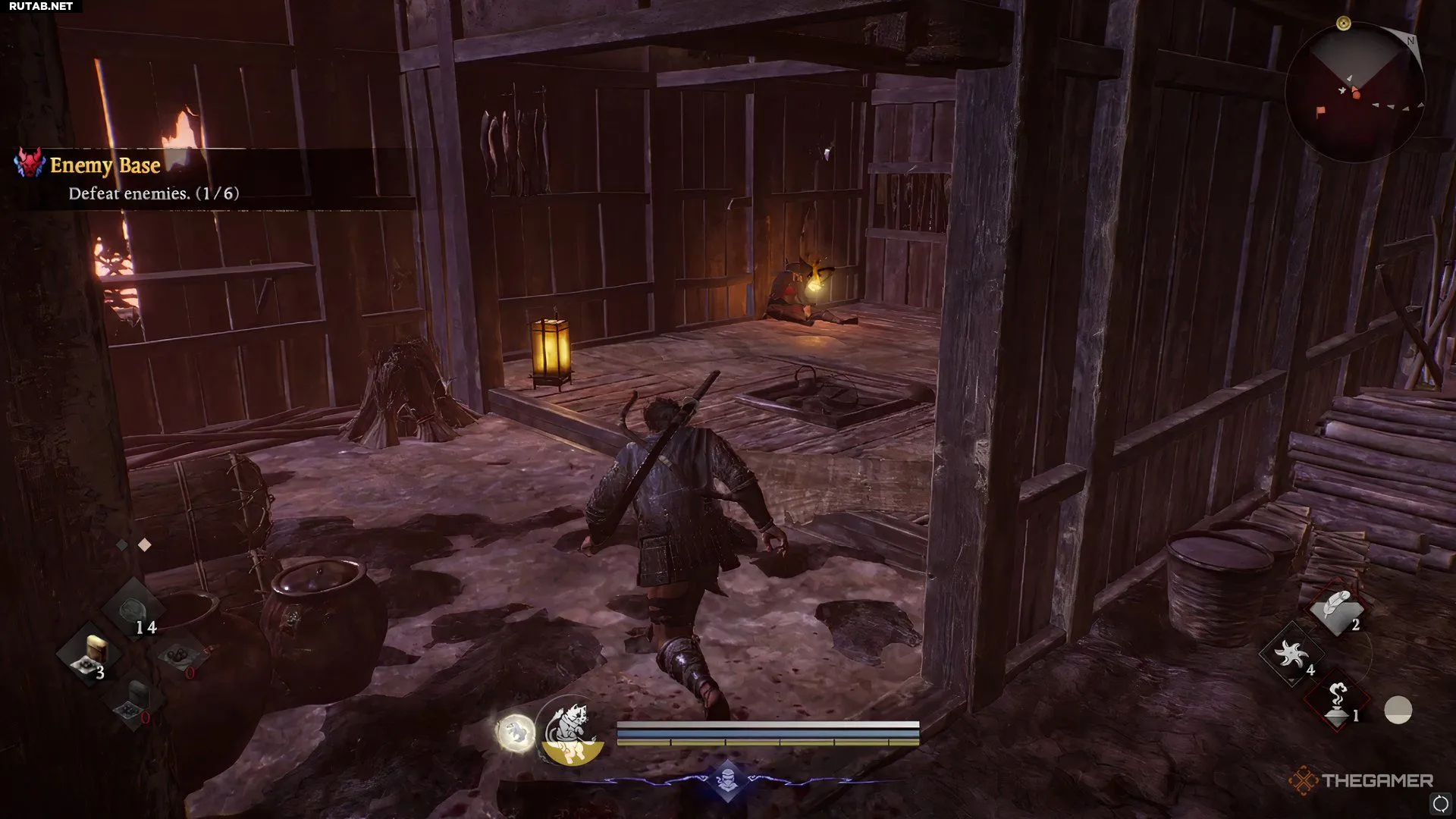 На вершине лестницы следующий противник скрывается в хижине позади того места, откуда появился первый. Подойдите к мёртвому телу в дальнем углу, и второй ёкай спрыгнет с потолка.
