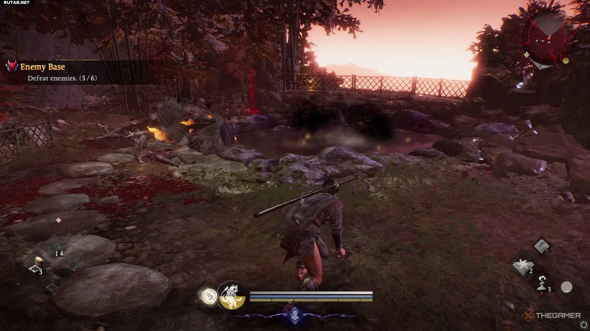 От тела, с которого начался квест, пробегите прямо в пещеру впереди. Вы окажетесь у входа в горячий источник, помеченный как вражеская база. Ваша задача — найти и убить шестерых ёкаев.