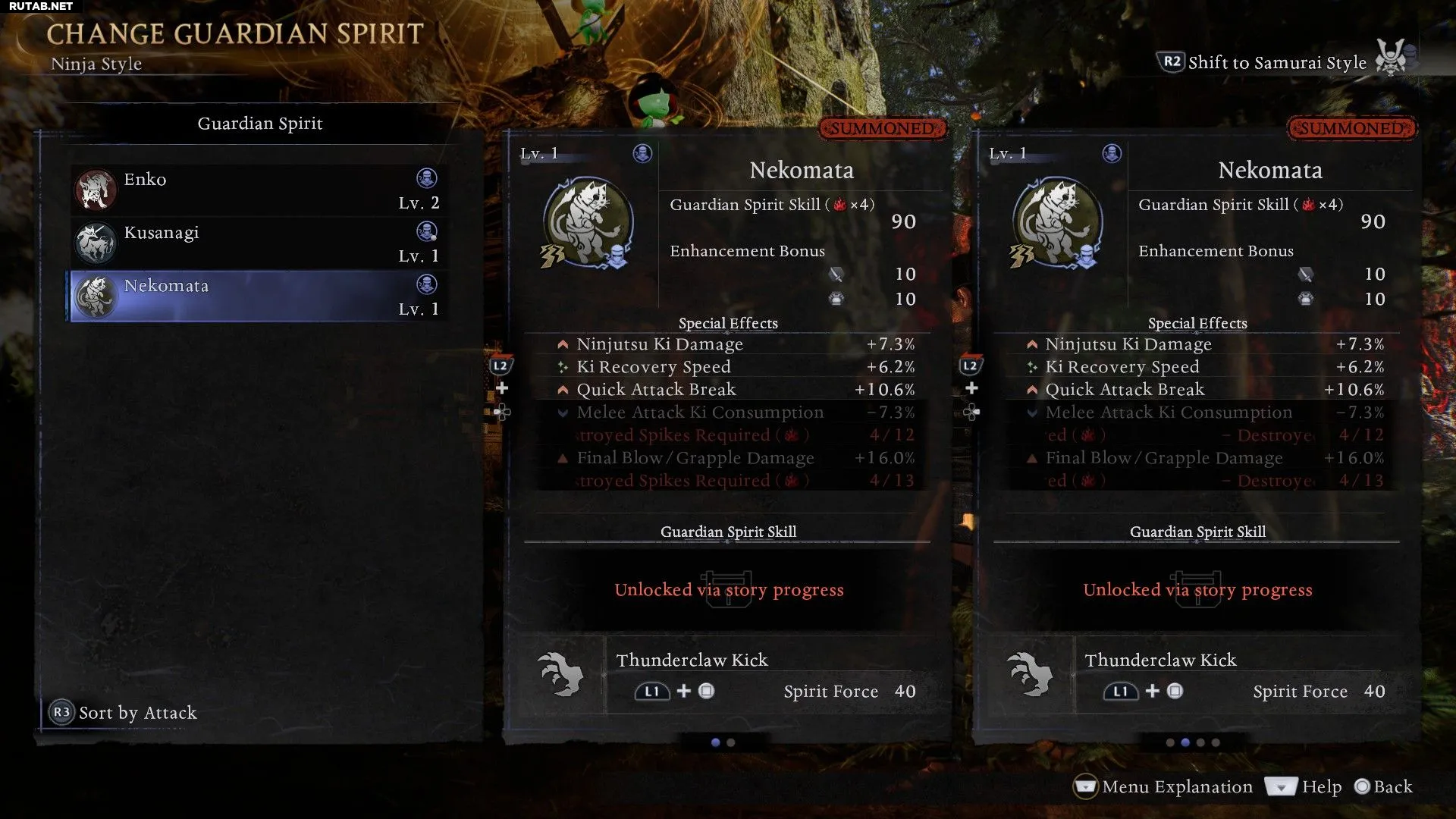 Некомата — один из духов-хранителей, которых вы получите во время обучающей миссии. Его можно экипировать только для стиля Ниндзя, и помимо повышения связанных с ниндзя характеристик, он даёт вам доступ к навыку «Удар грома». Этот навык хорош по трём причинам: