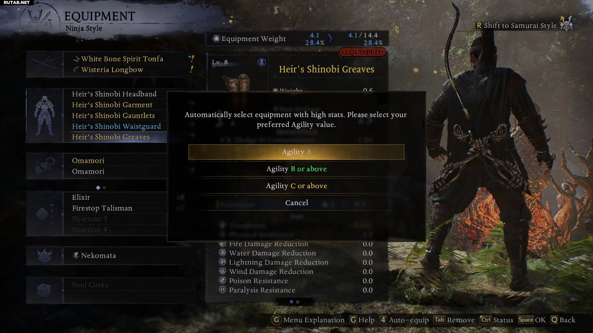 Нажав R3 на геймпаде (или 4 на клавиатуре) в меню экипировки, вы можете автоматически надеть лучшее оружие и броню из вашего инвентаря. Игра даже позволит вам выбрать желаемый уровень Проворства (то есть весовую категорию).