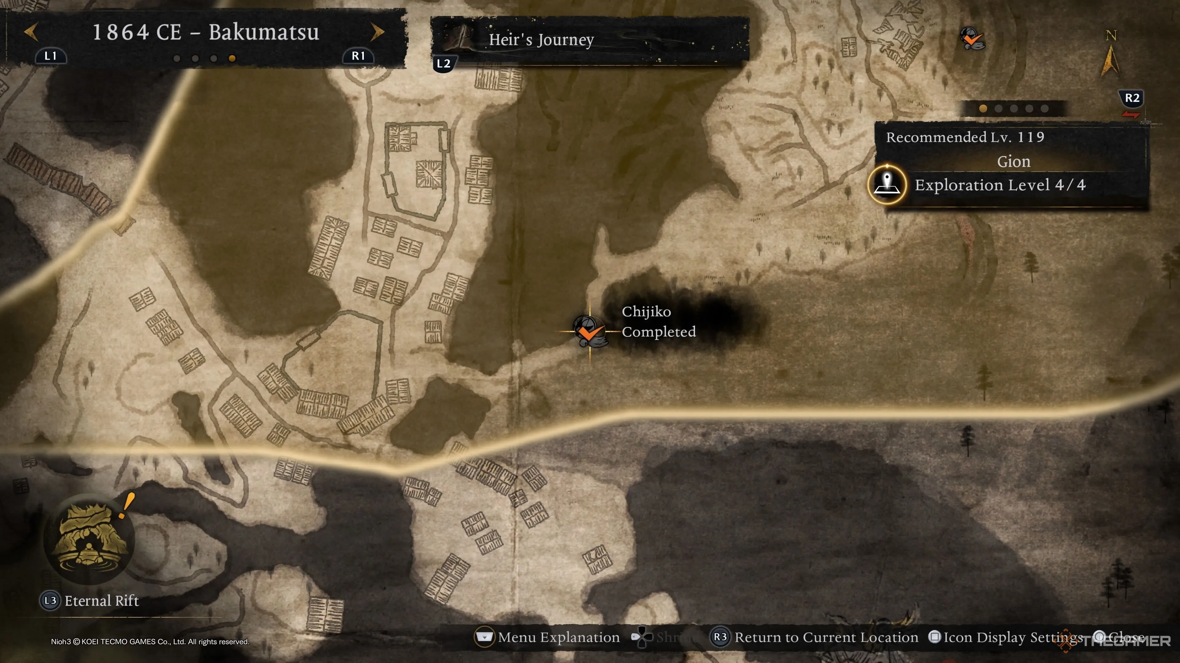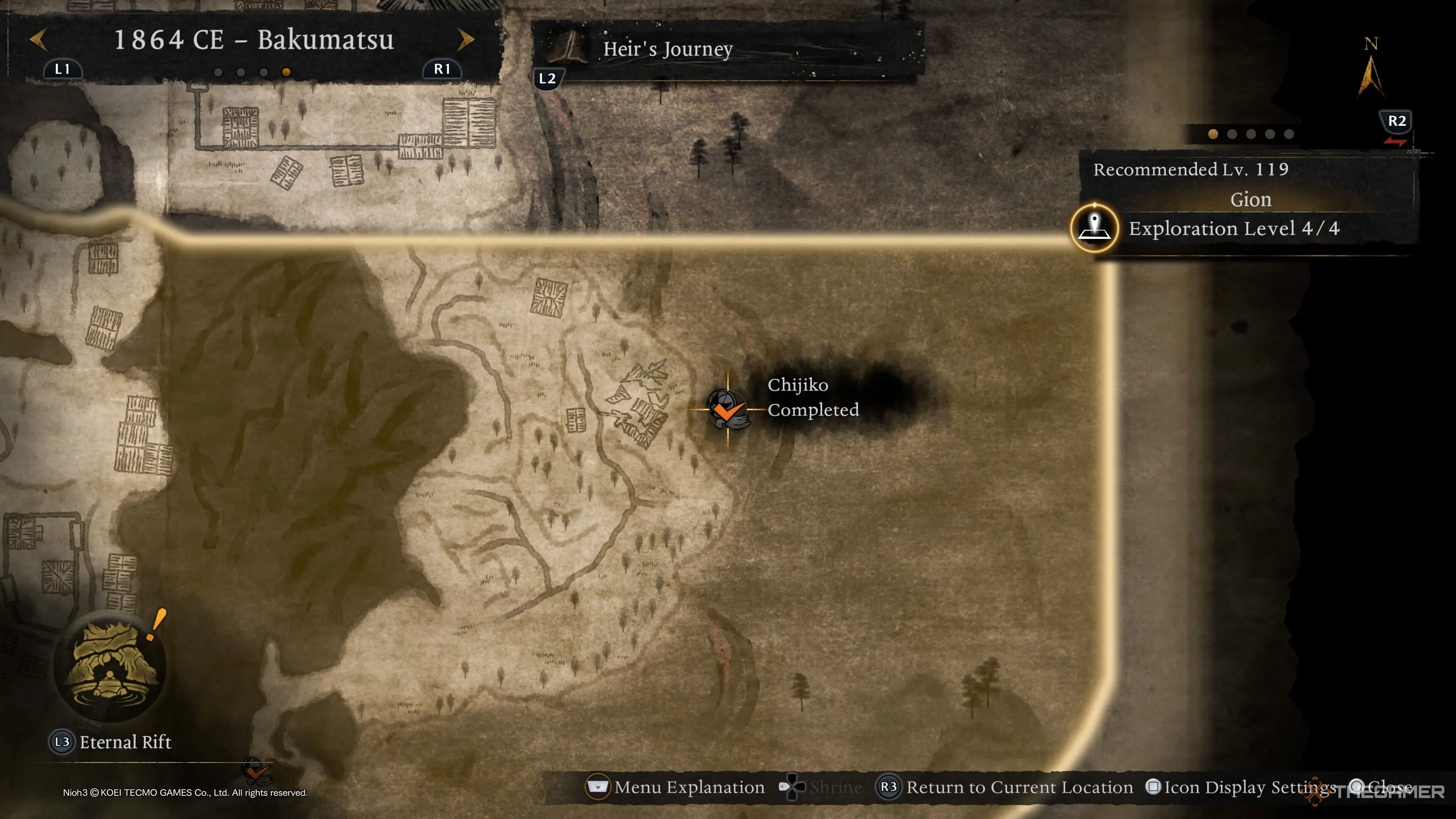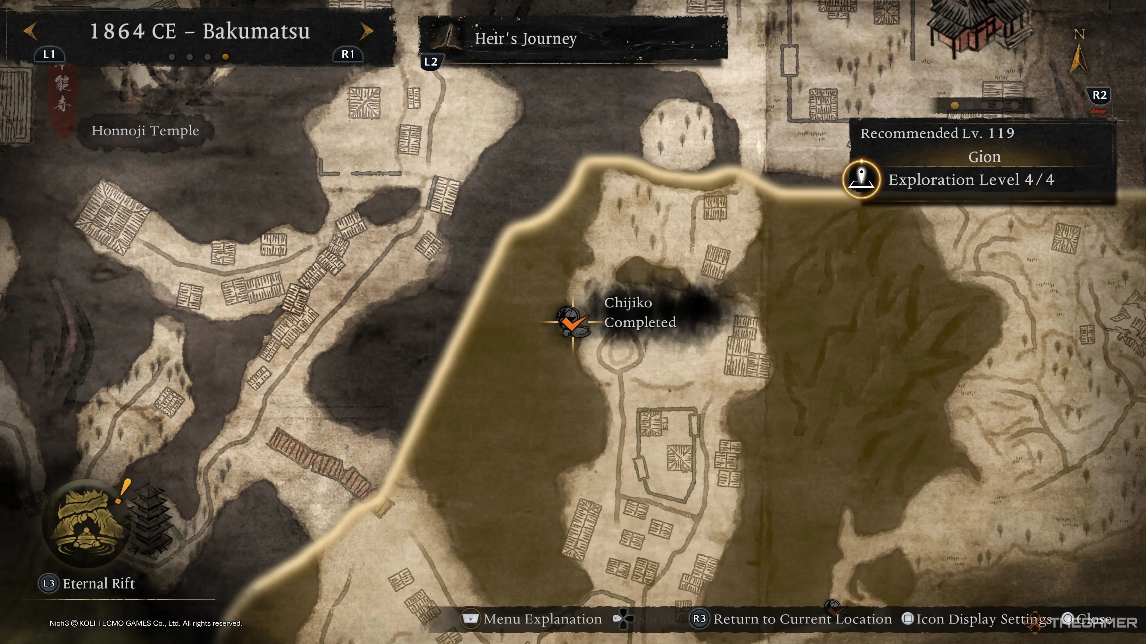 Второго Чидзико в Гионе можно найти на тропе, ведущей направо вверх по демоническим скалам после лестницы Отовы. В начале этого пути вы увидите святилище Киёмидзу на утёсе. Чидзико летает ниже него, так что спрыгните со скал на нижнюю платформу. Это также откроет доступ к святилищу на утёсе, так как внизу есть Источник Духа, по которому можно до него добраться.
