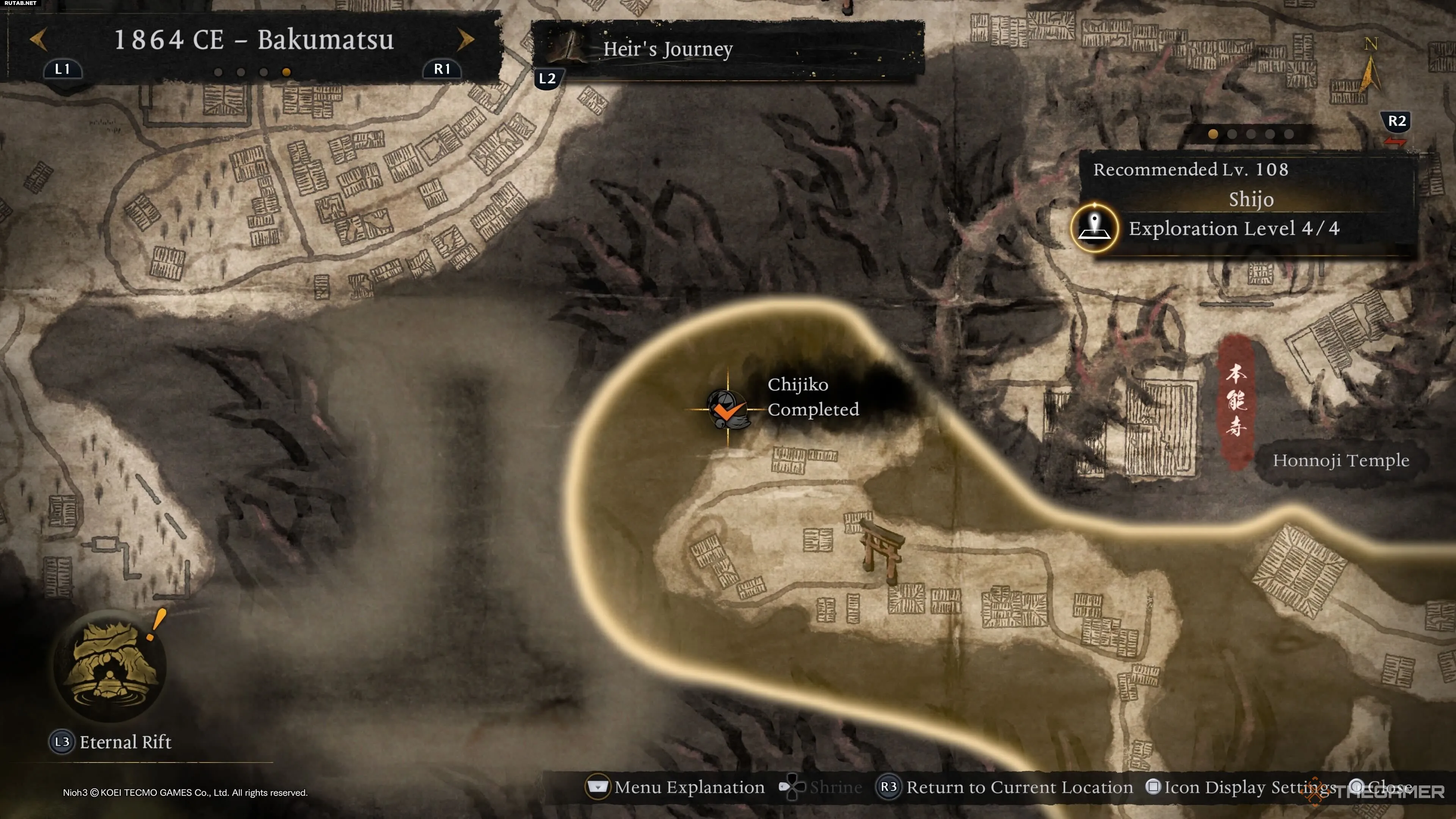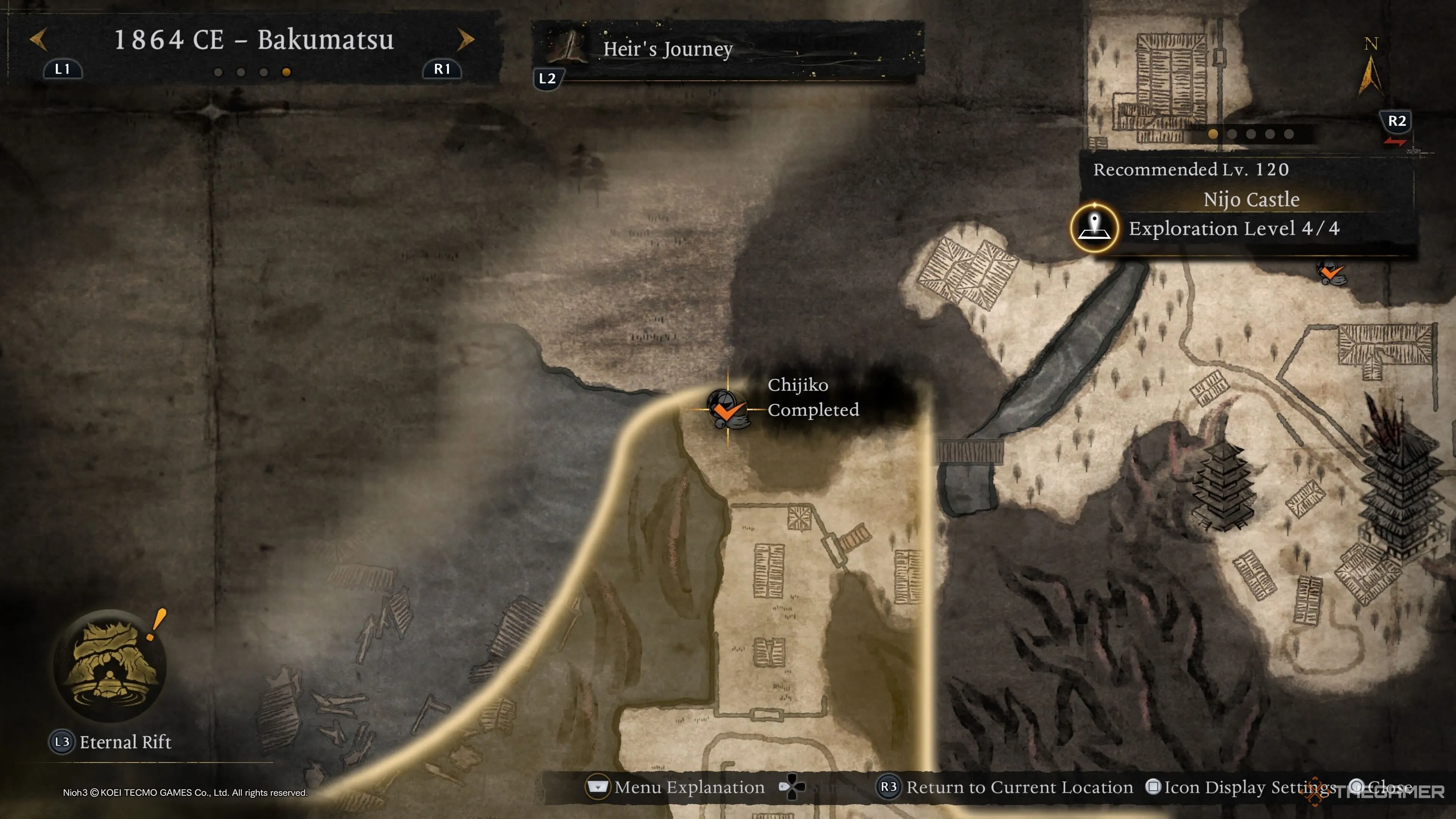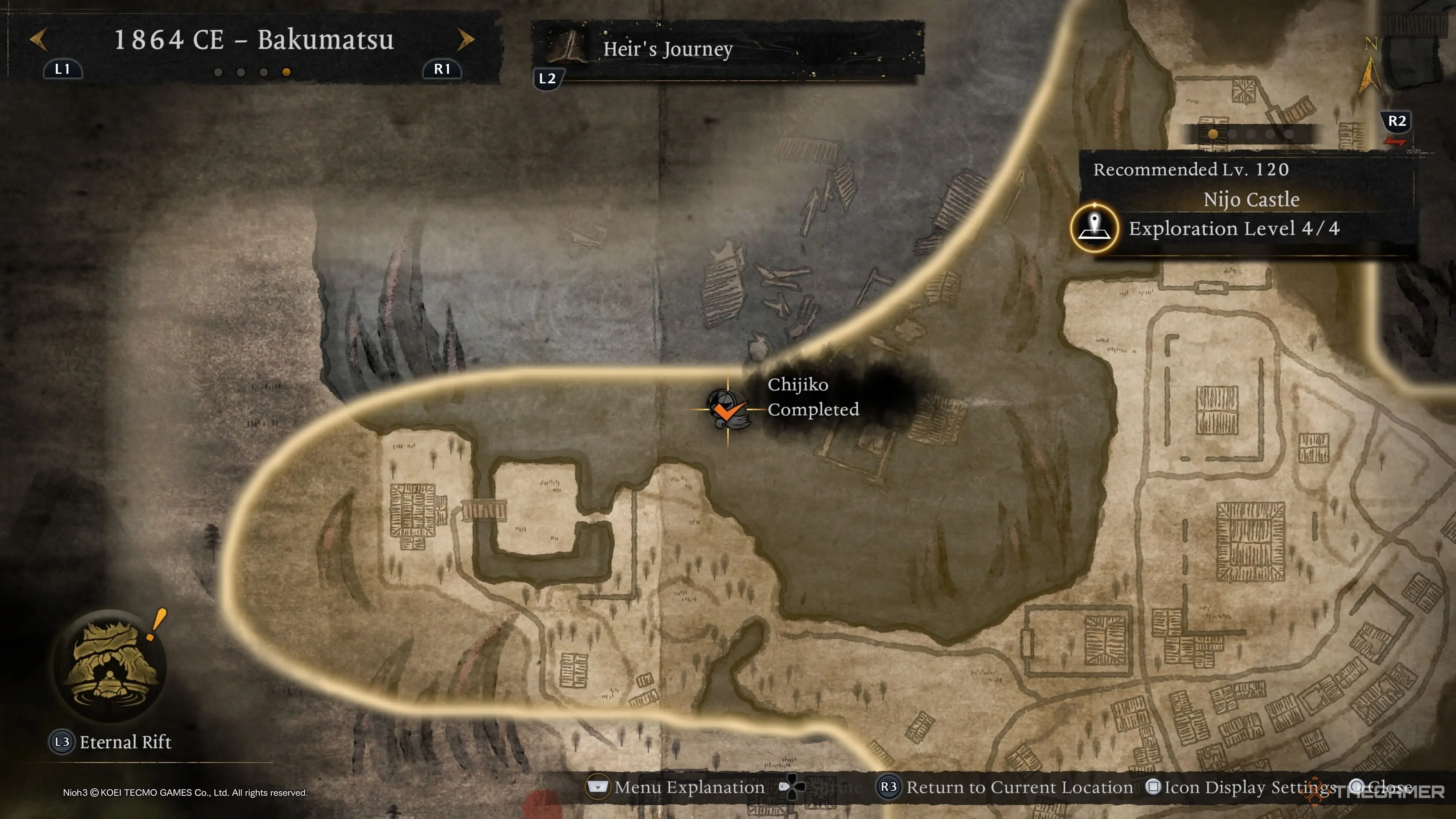Первого Чидзико в Замке Нидзё можно найти на севере локации, недалеко от святилища Озеро Руин Замка Нидзё. Отсюда развернитесь и используйте Источник Духа, чтобы подняться на крышу храма, откуда будет удобно сбить Чидзико.