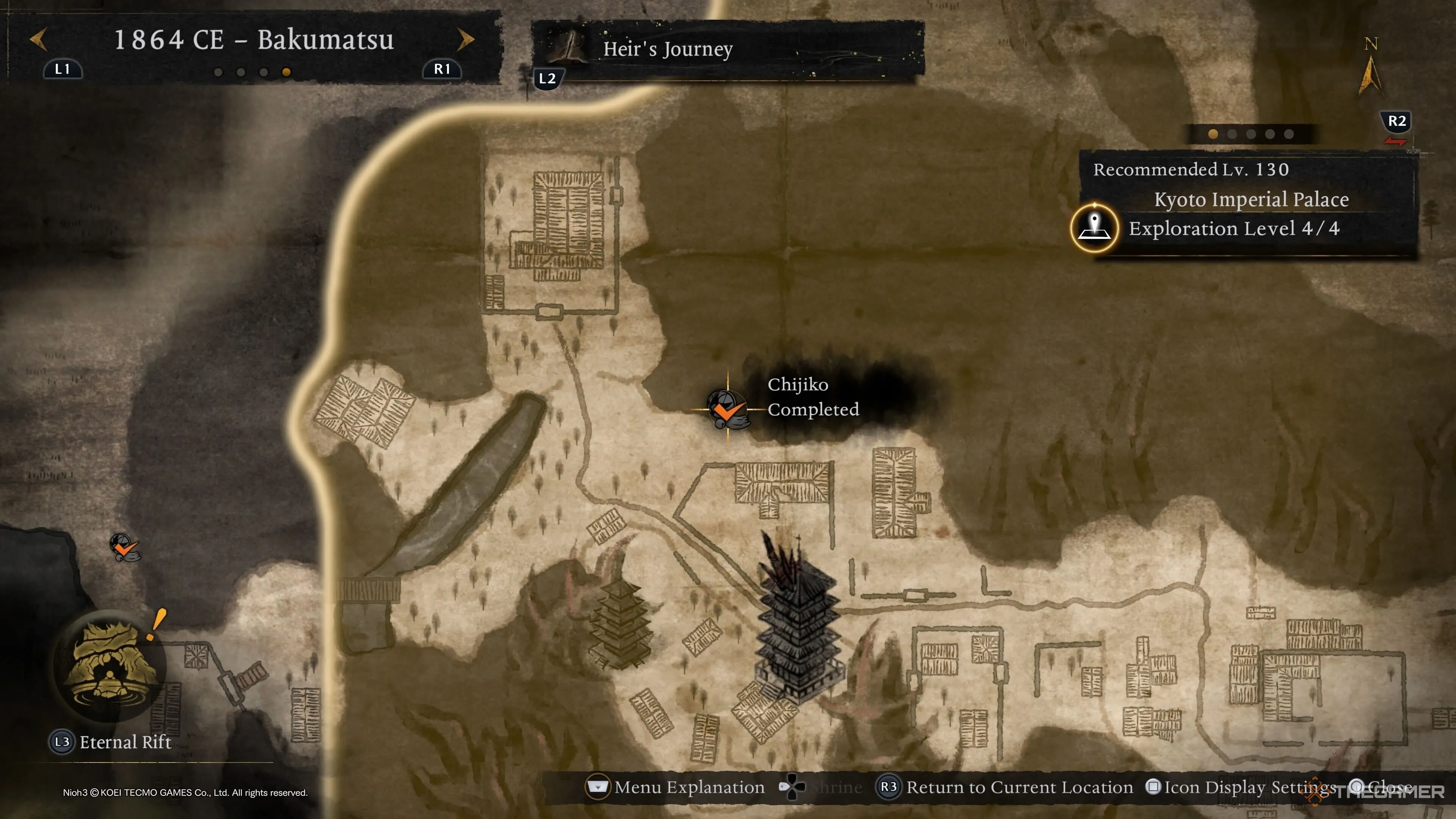 Последнего Чидзико во всей Nioh 3 можно найти рядом со святилищем Императорского дворца, с правой стороны Императорского дворца Киото. Пройдите до самого запертых ворот у восточного края, а затем прицельтесь в небо. Чидзико будет далеко, но до него всё ещё можно добраться метким выстрелом. Если вы собрали всех Чидзико по порядку, вы получите трофей «Орлиный глаз» за свои труды!