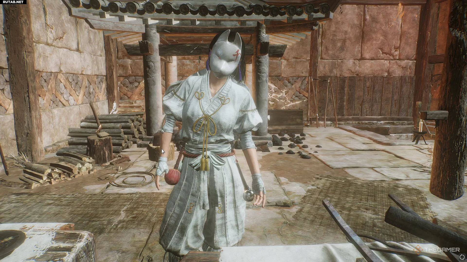 Внутри здания вы найдёте Кузнеца в маске лисы. Она поприветствует вас как редкого гостя и с этого момента позволит вам пользоваться её услугами.
