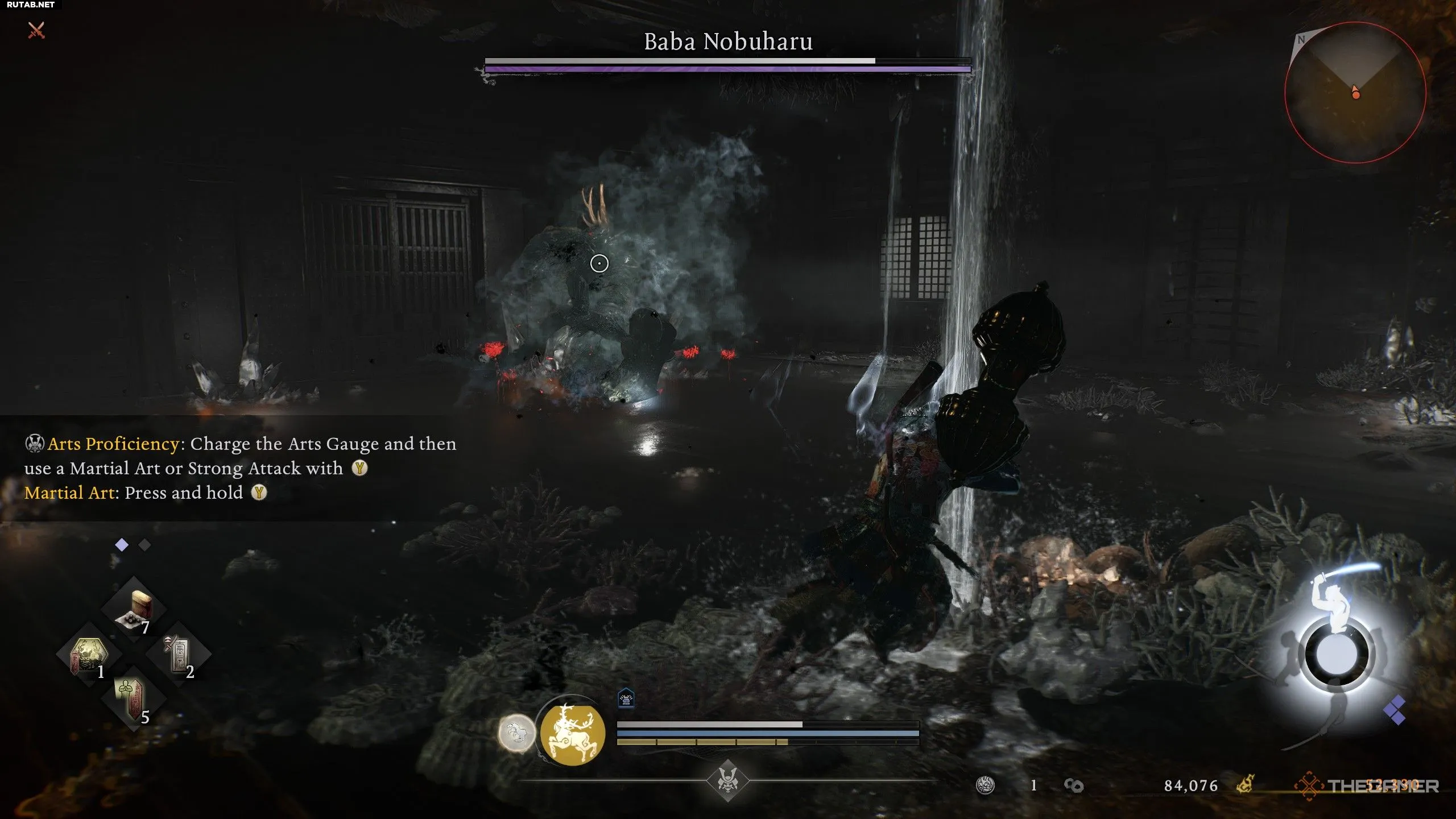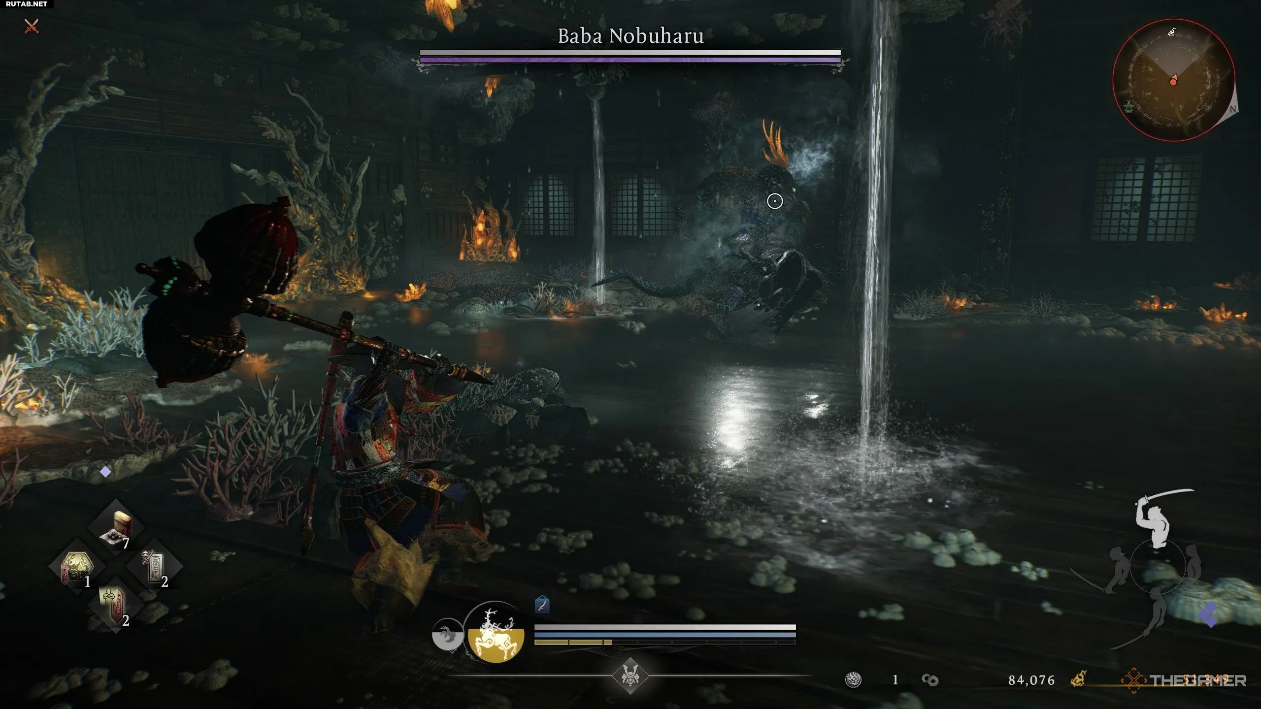 Раздражает то, что Баба Нобухару начинает комбинировать несколько мираж-атак подряд. Это сложно выдержать, так как попытка заблокировать их все почти наверняка опустошит ваш запас ки. Лучший выход, каким бы страшным он ни казался, — это совершить перекат сквозь атаку и оказаться позади Бабы Нобухару. Он не может развернуться на месте, поэтому ему трудно попасть по вам последующими ударами. Это также оставляет босса открытым для атаки — особенно если вы используете форму ниндзя, специализирующуюся на быстрых ударах и уклонениях.
