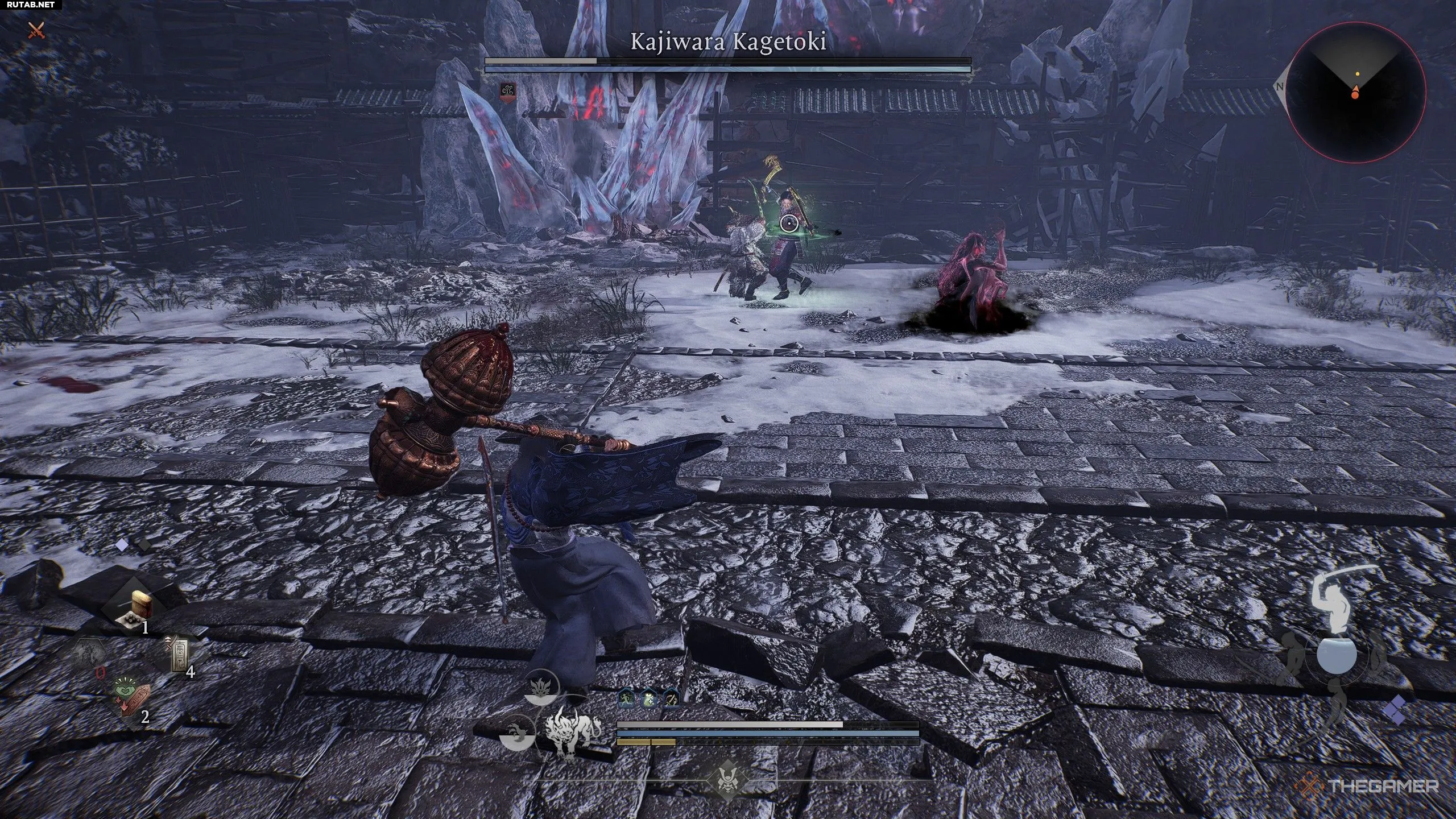 Бой с Кагэтоки — это скорее испытание на выносливость и терпение, чем на настоящее мастерство. Большинство его атак топориками легко увернуться, так как они сводятся к броску и быстрому отступлению. Ограничьтесь одним-двумя ударами за подход, так как Кагэтоки обычно пытается контратаковать вас во время вашего натиска. Лучше не жадничать и просто наказывать его за постоянные броски оружия в вас!