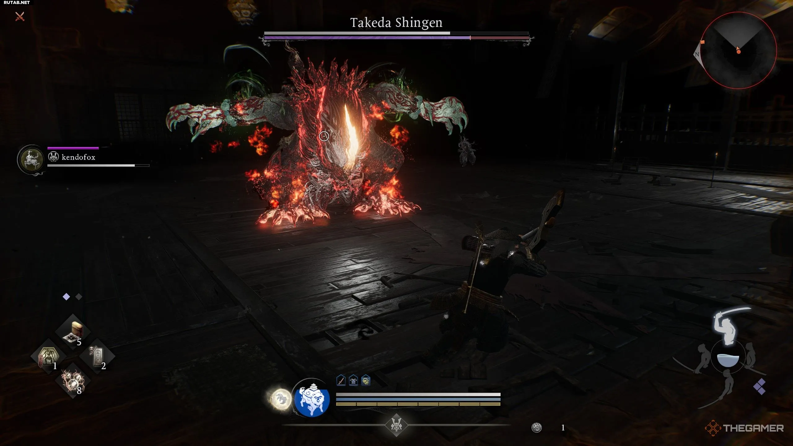 Теперь Такэда Сингэн — это огромный четырёхрукий ёкай, который использует дополнительные конечности для нанесения серии быстрых ударов. Несмотря на размер, он очень проворен. Впрочем, у него не так много приёмов, способных мгновенно опустошить шкалу здоровья. Однако некоторые его атаки насыщены уроном от стихий ветра и огня. Рекомендуется надеть доспехи или использовать талисманы, дающие сопротивление хотя бы к одному из этих элементов.