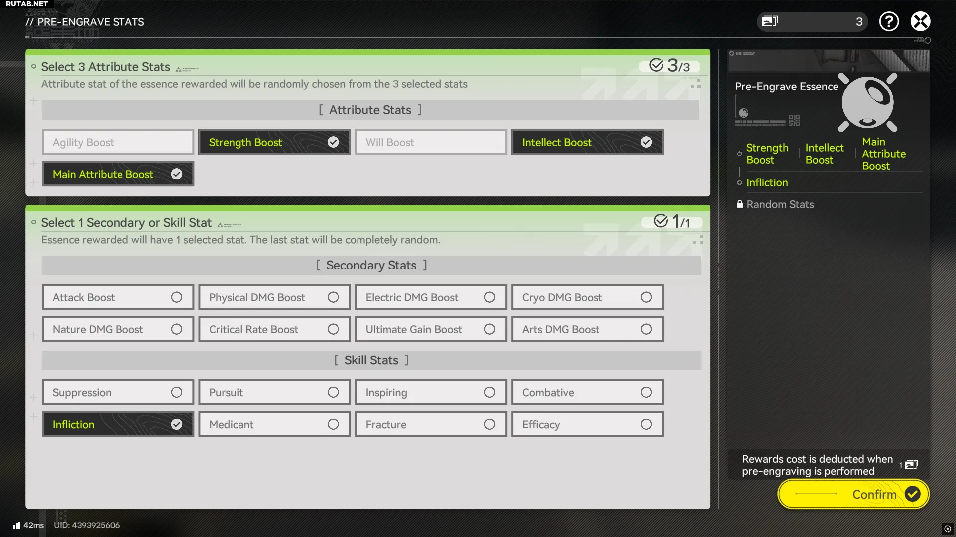 Откроется окно, где вам нужно выбрать три различных атрибута и один вторичный или навыковый перк. Любая эссенция, полученная после прохождения зоны, гарантированно будет иметь один из трёх выбранных атрибутов, выбранный вторичный перк или перк навыка, а также один полностью случайный перк.