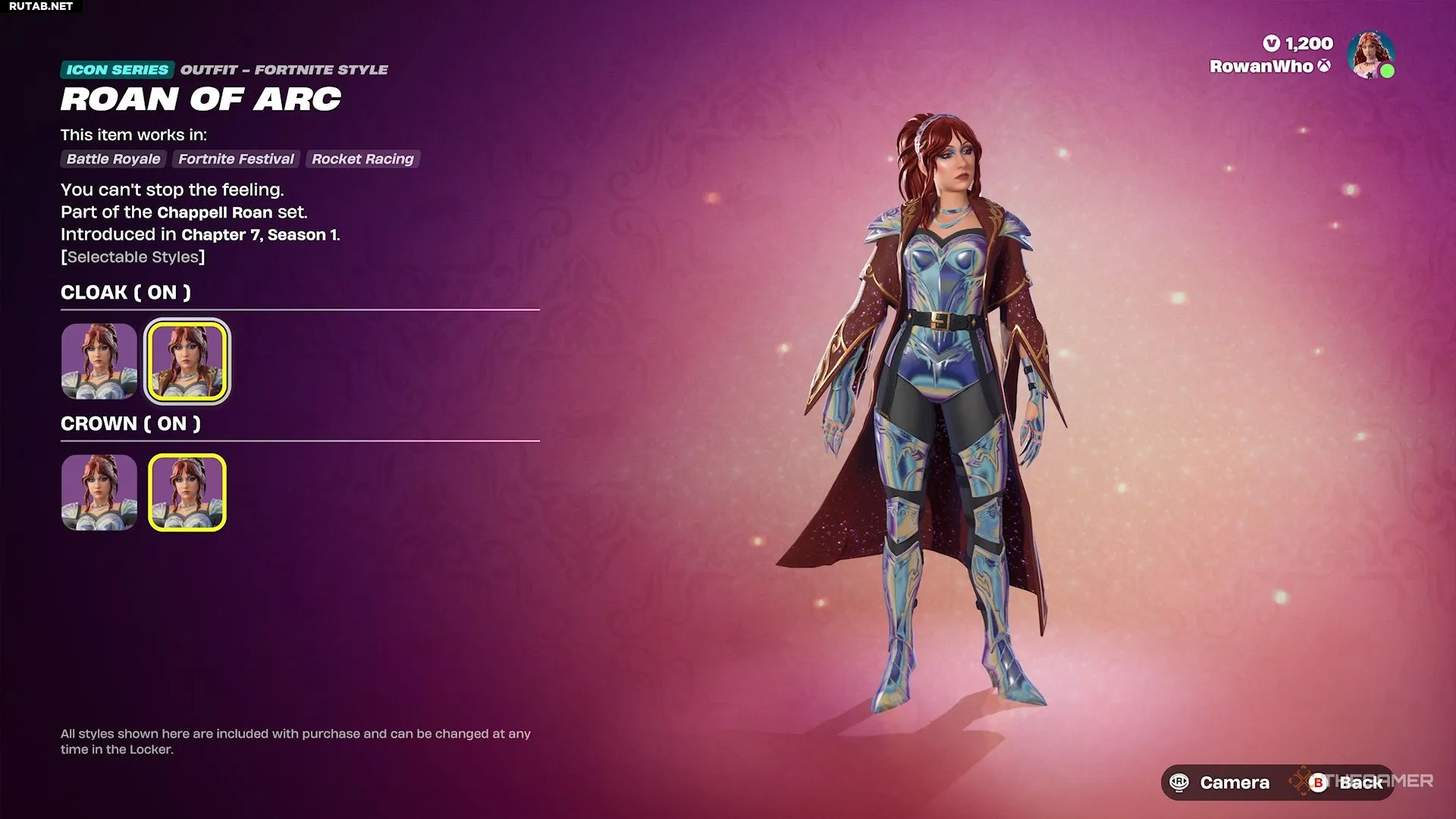 В Fortnite, глава 7, сезон 1, сейчас доступны два костюма Шаппелл Роан: её классический розовый корсет с альтернативным красным стилем и её рыцарский наряд «Роан из Арка» со съёмной накидкой и короной.