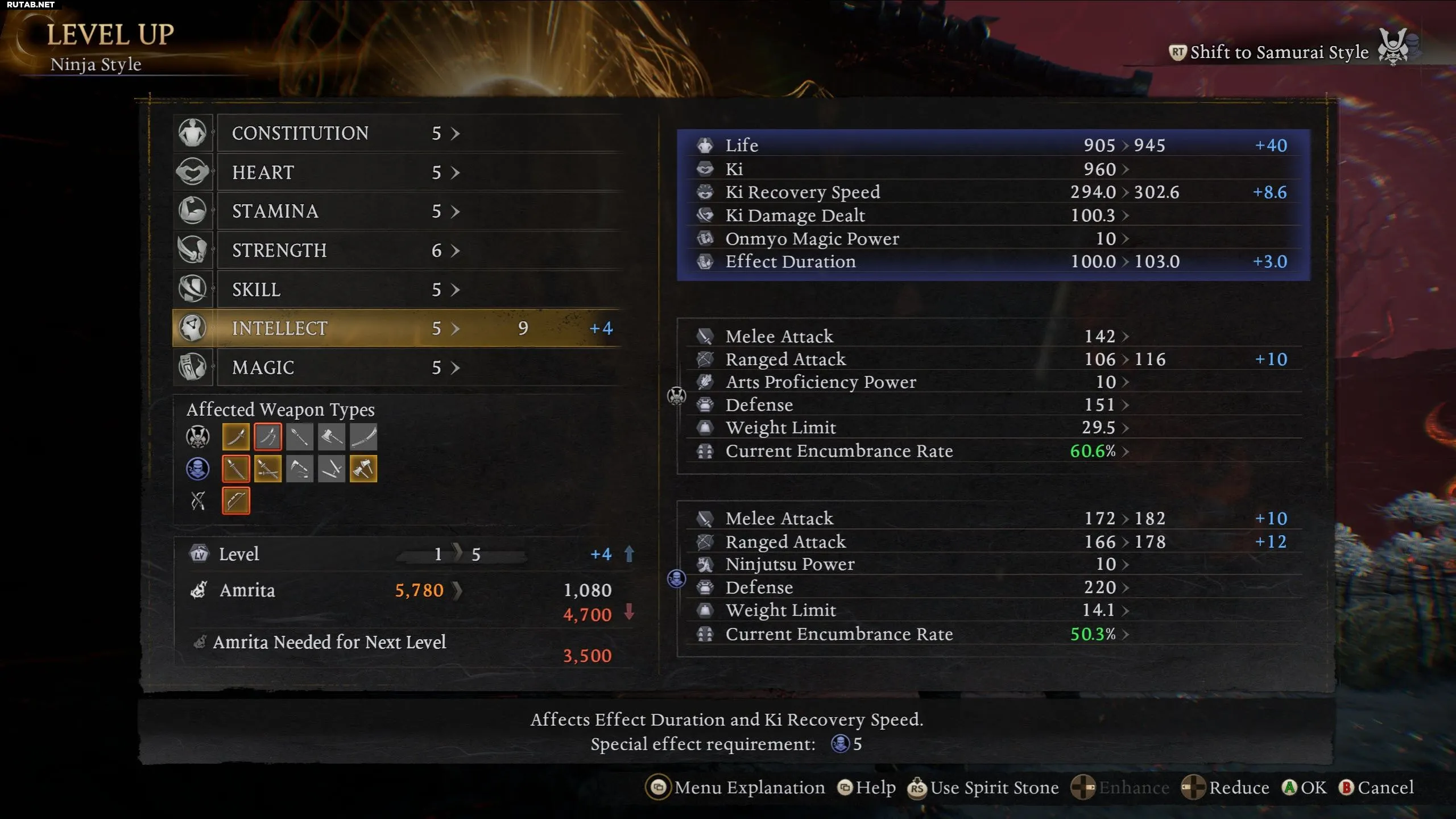 Основной метод — вкладывать очки в характеристику Интеллект. За прохождение сюжета и победу над врагами вы получаете Амриту, которую можно тратить на прокачку. Интеллект повышает не только скорость восстановления Ки, но и здоровье, длительность эффектов, урон от дальнобойных атак самурая, а также ближнего и дальнего боя ниндзя.