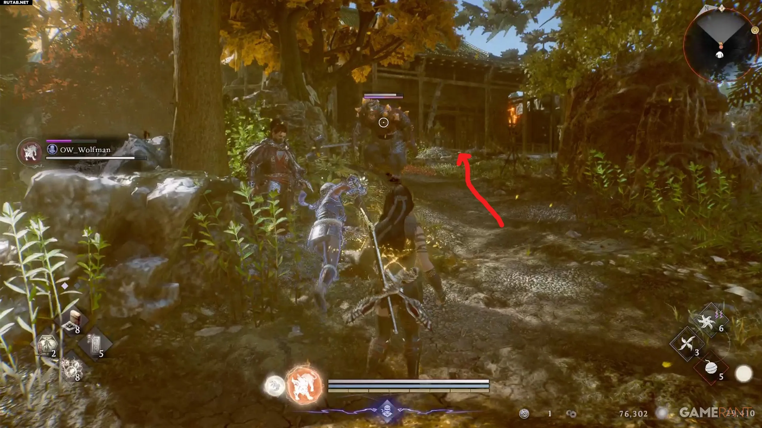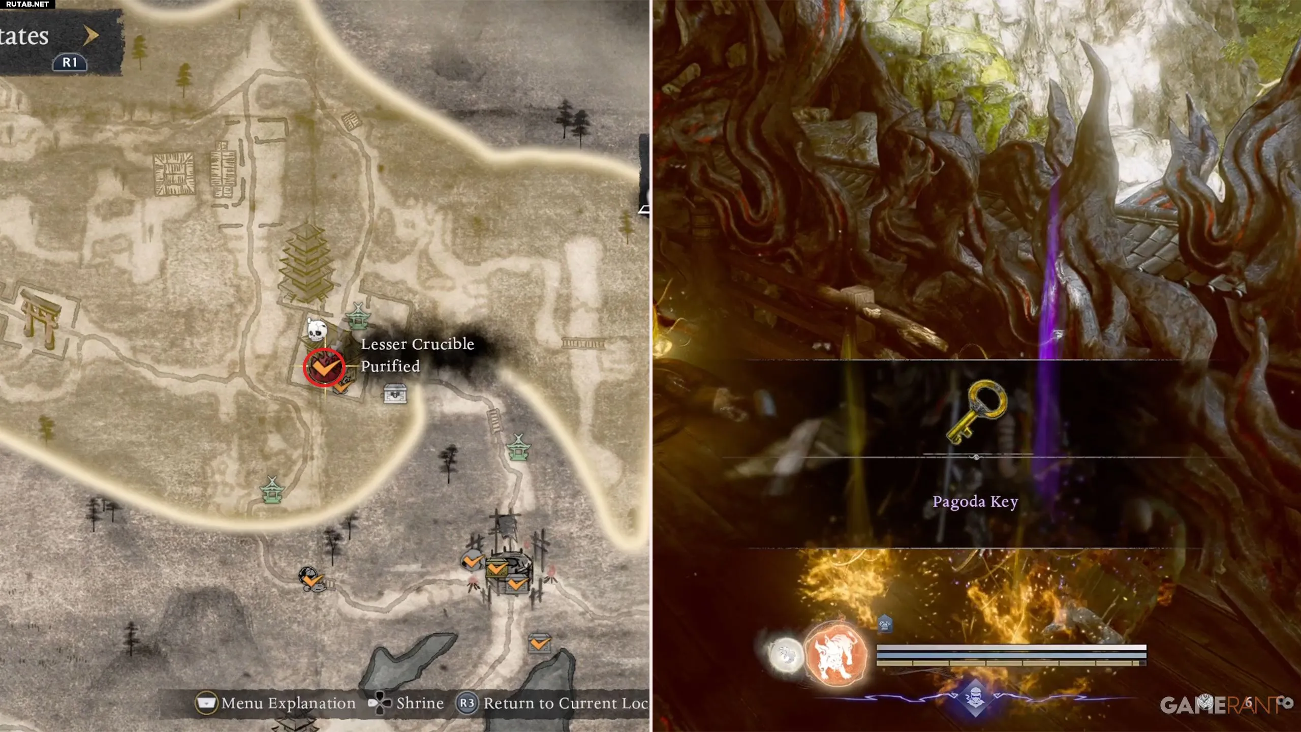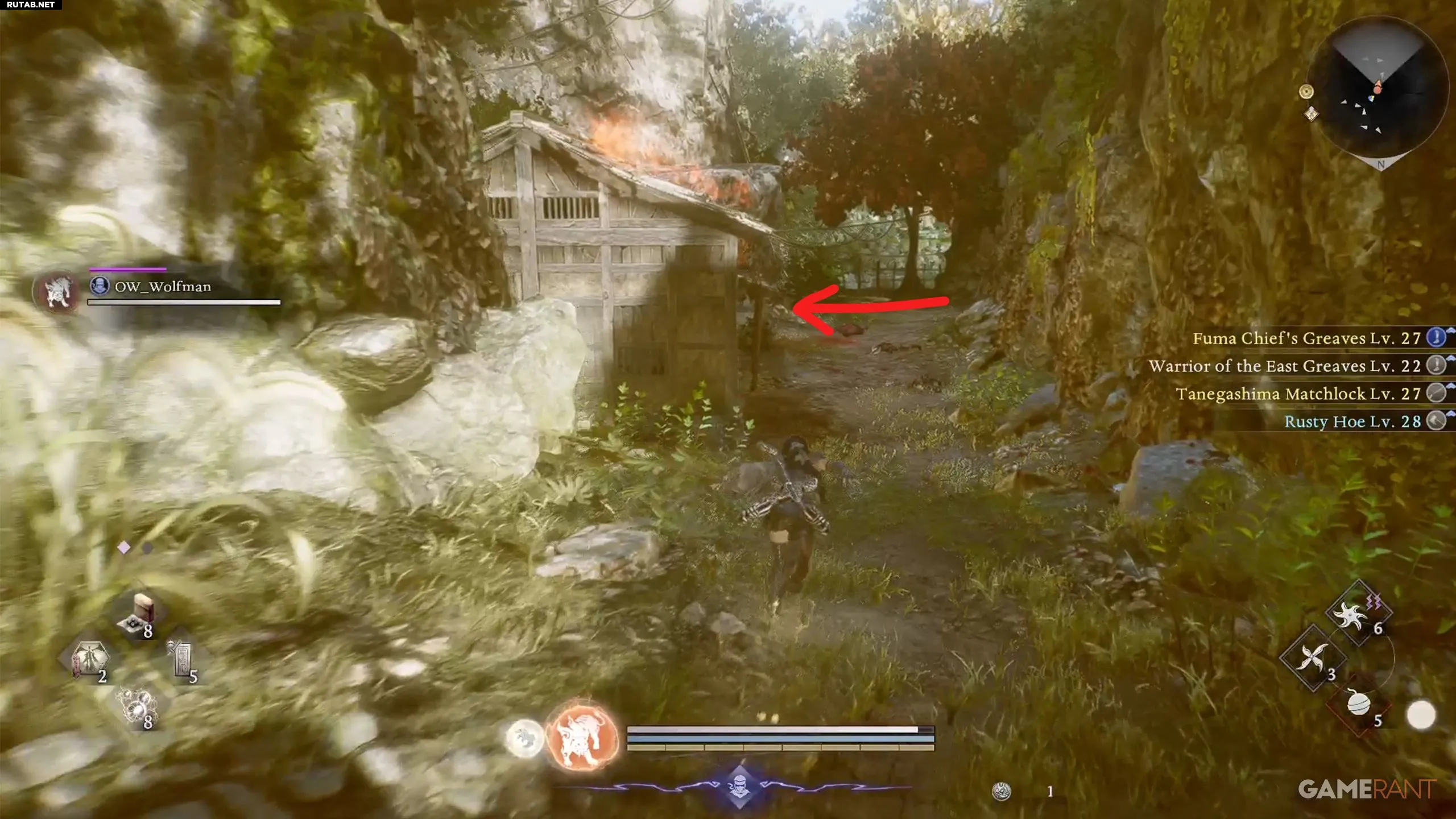 При желании спрячьтесь в высокой траве и устраните ещё одного ёкая со спины. Поднимитесь по склону, победите больше демонов и направляйтесь к зданию наверху. Прежде чем войти, обойдите здание слева и откройте короткий путь, ведущий к Горнильному шипу возле святилища «Перекресток Омомодзи».