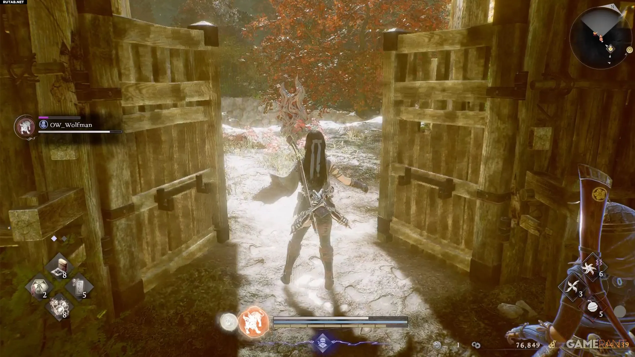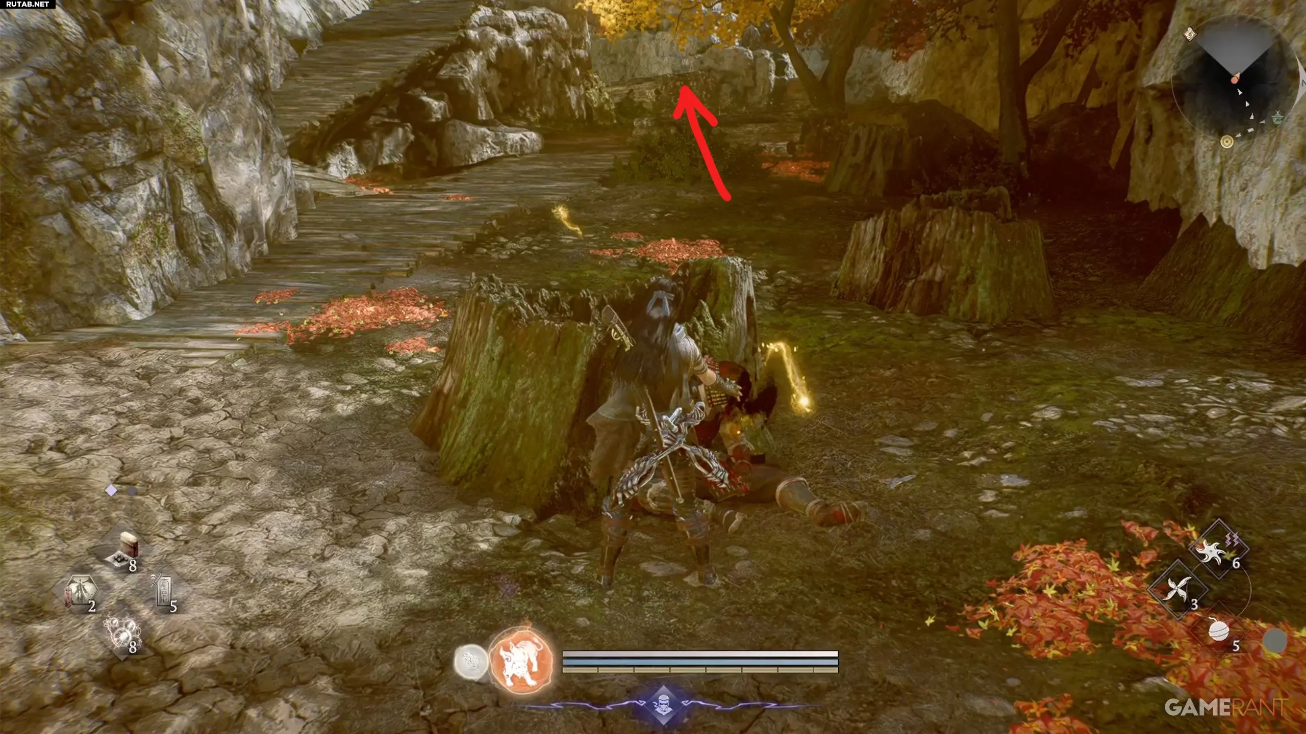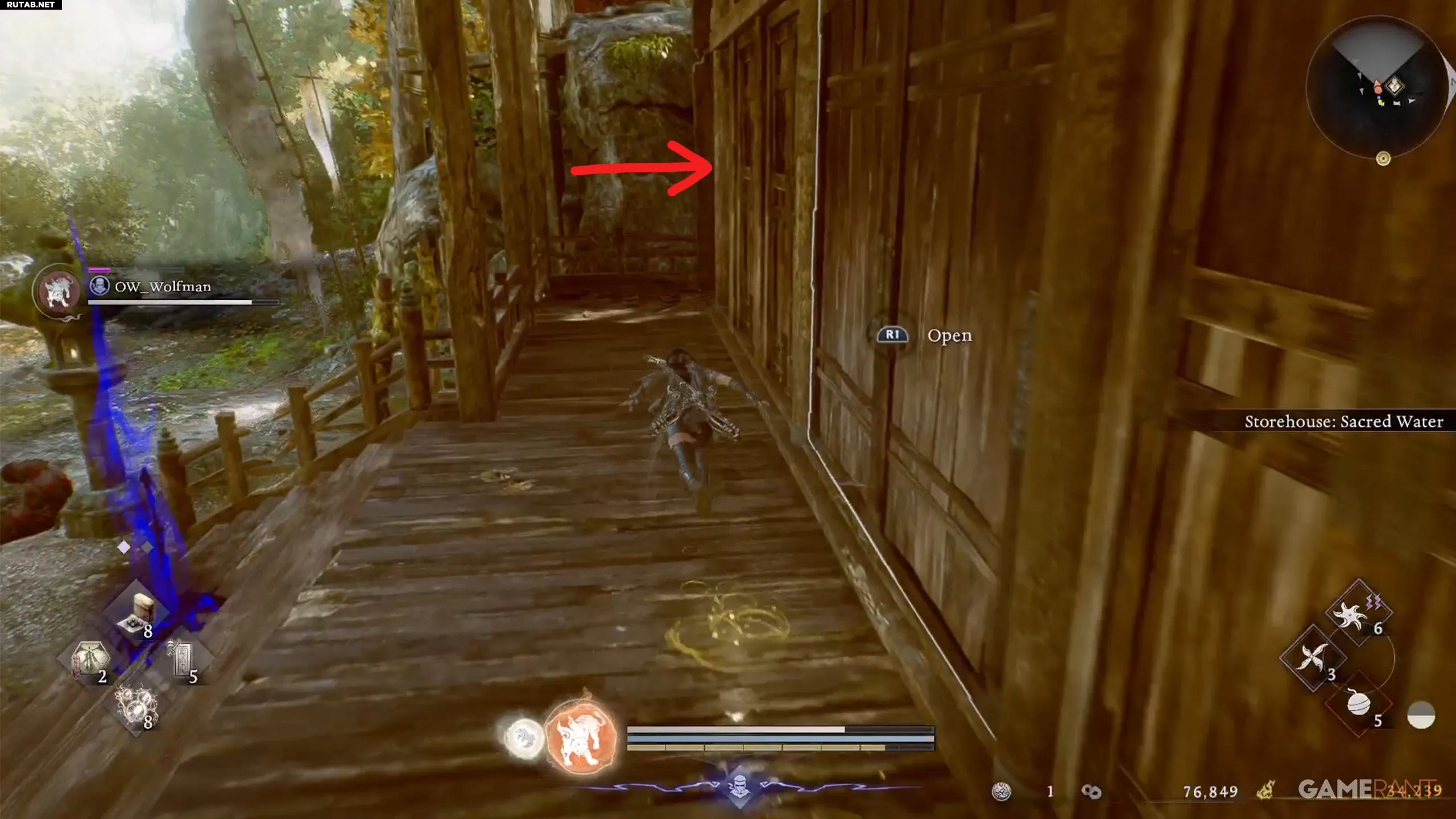При желании спрячьтесь в высокой траве и устраните ещё одного ёкая со спины. Поднимитесь по склону, победите больше демонов и направляйтесь к зданию наверху. Прежде чем войти, обойдите здание слева и откройте короткий путь, ведущий к Горнильному шипу возле святилища «Перекресток Омомодзи».