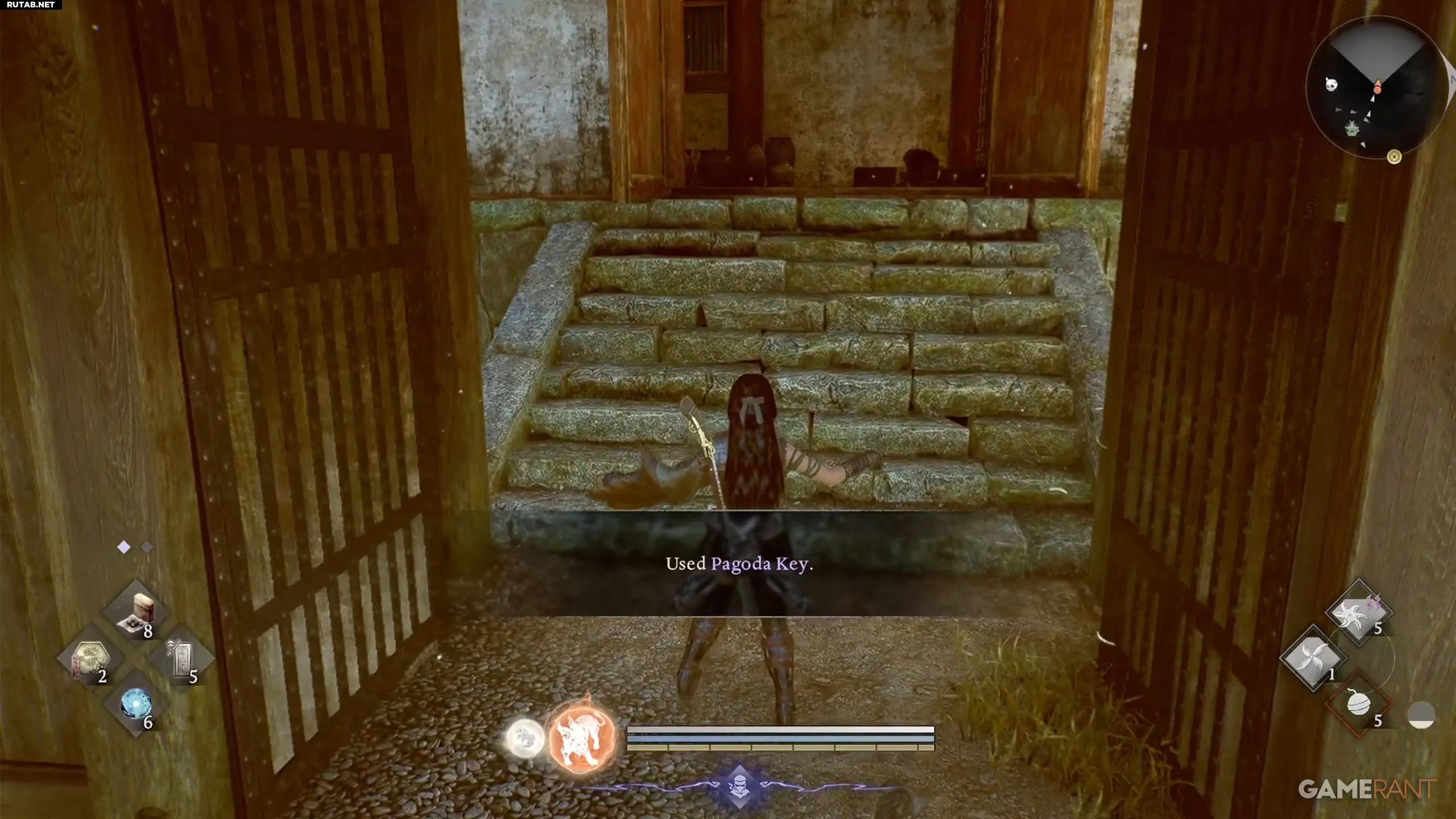 Следуйте за меткой задания и телепортируйтесь к ближайшему святилищу. Чтобы открыть дверь в заброшенный храм, найдите Ключ от пагоды в соседнем здании, предварительно победив Малого Горнильного демона. После победы над всеми врагами разбейте сундук и заберите ключ с трупа. Подойдите к двери и откройте её.
