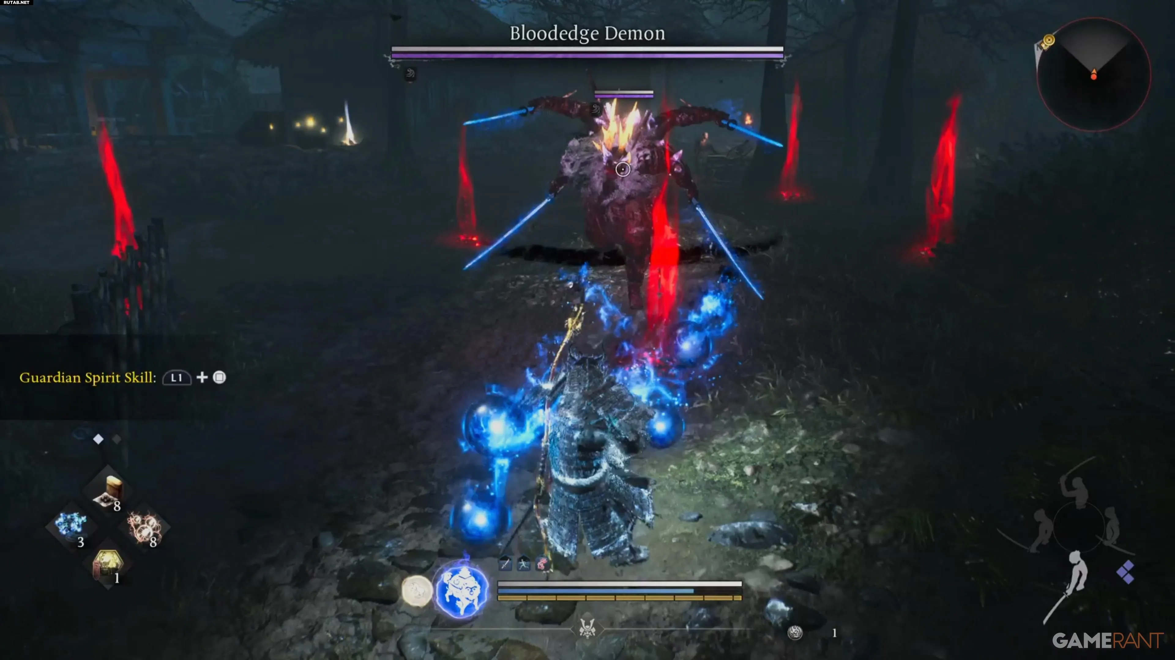 Этот бой считается одним из самых сложных в начале игры. Главную опасность представляет атака с размаху, когда демон откидывается назад и всеми руками наносит удар своими катанами. Этот удар может мгновенно убить даже высокоуровневого персонажа. Уворачиваться от него рискованно, поэтому лучше блокировать или парировать атаку в стиле самурая.