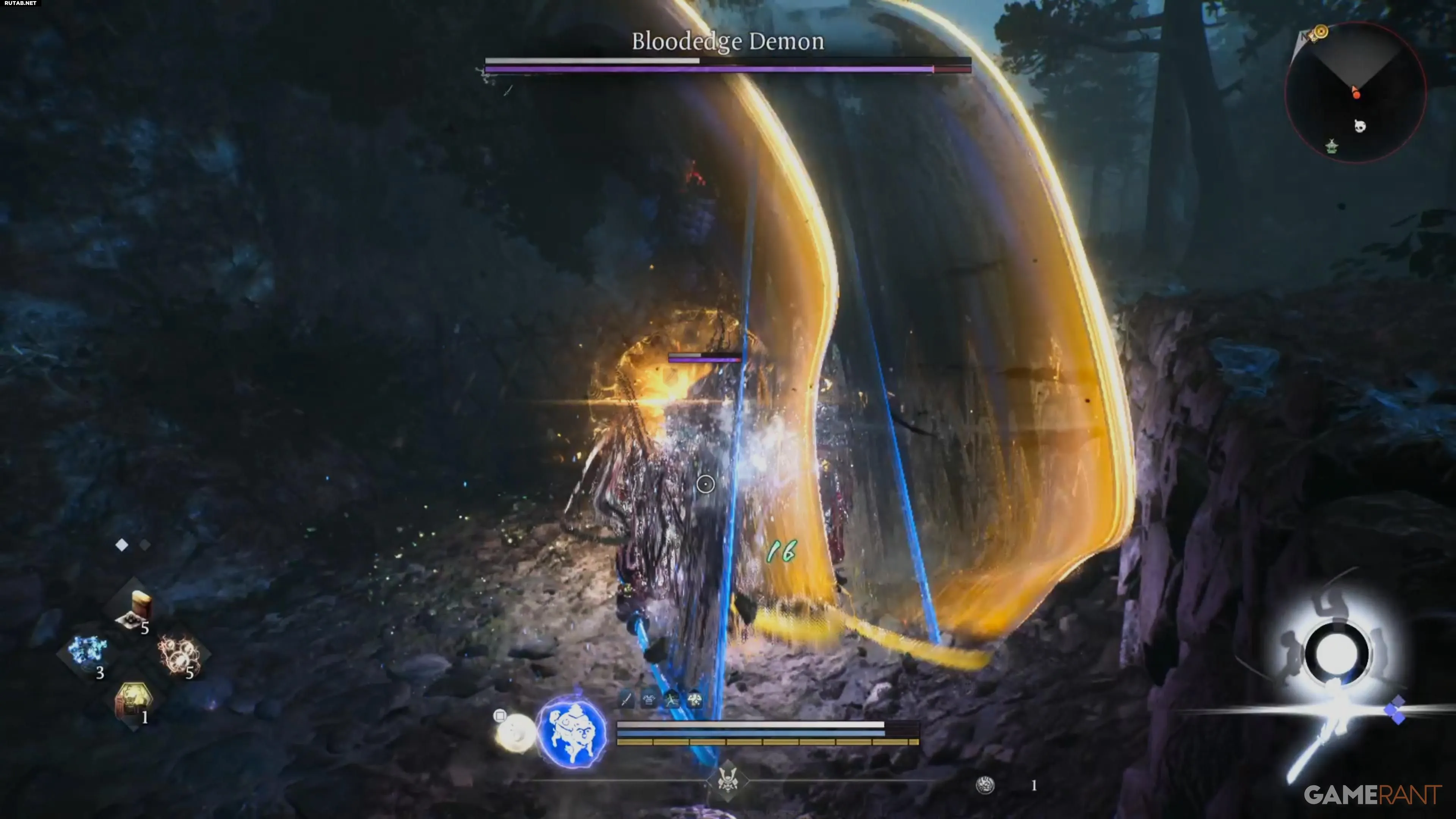 Кровавый демон использует катаны, насыщенные стихиями молнии и воды. Эти атаки могут накладывать негативные статусы, делая вас уязвимыми для последующих ударов. Старайтесь держаться на средней дистанции — это позволит вам вовремя реагировать на атаки и наносить свой урон.