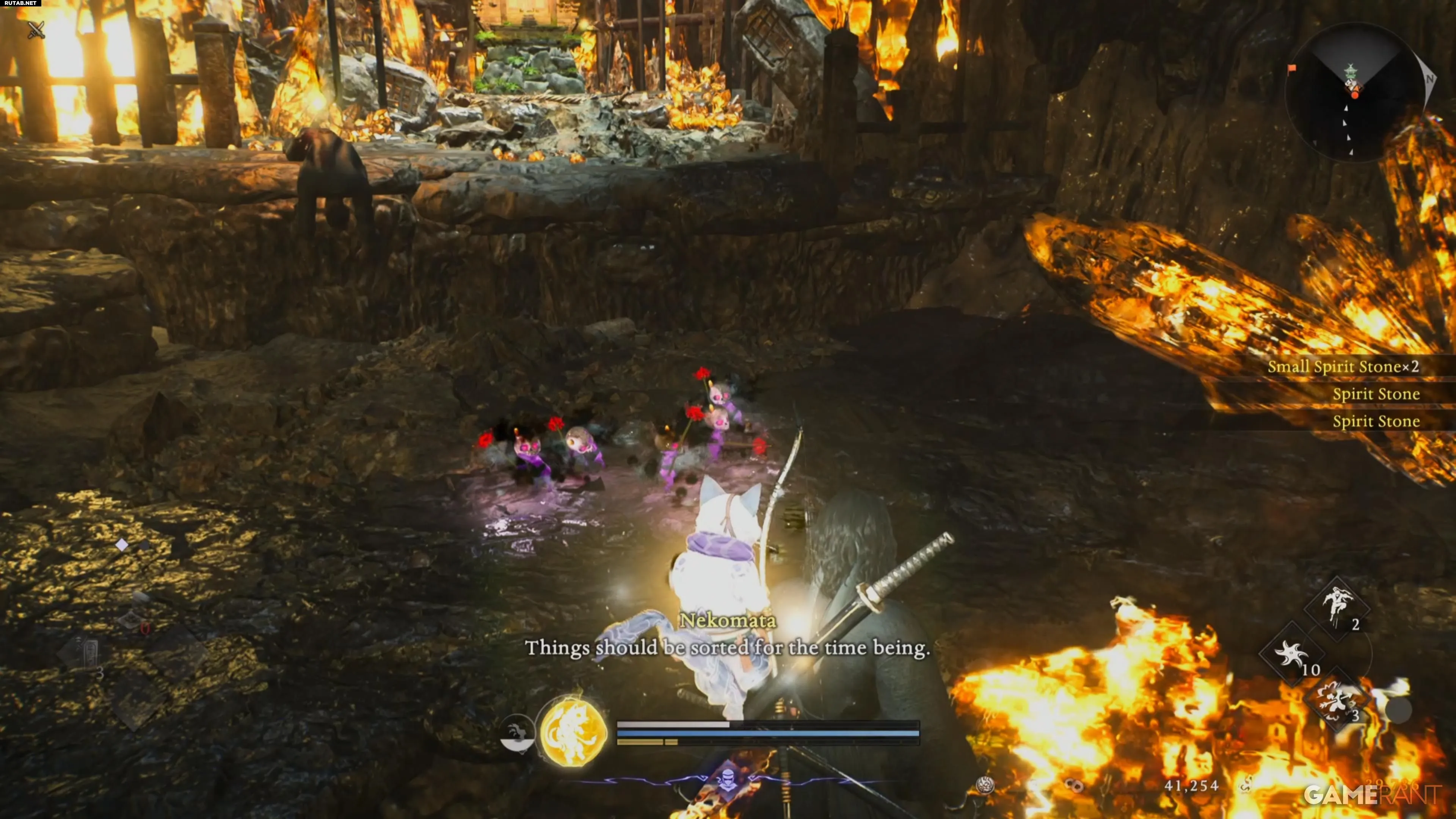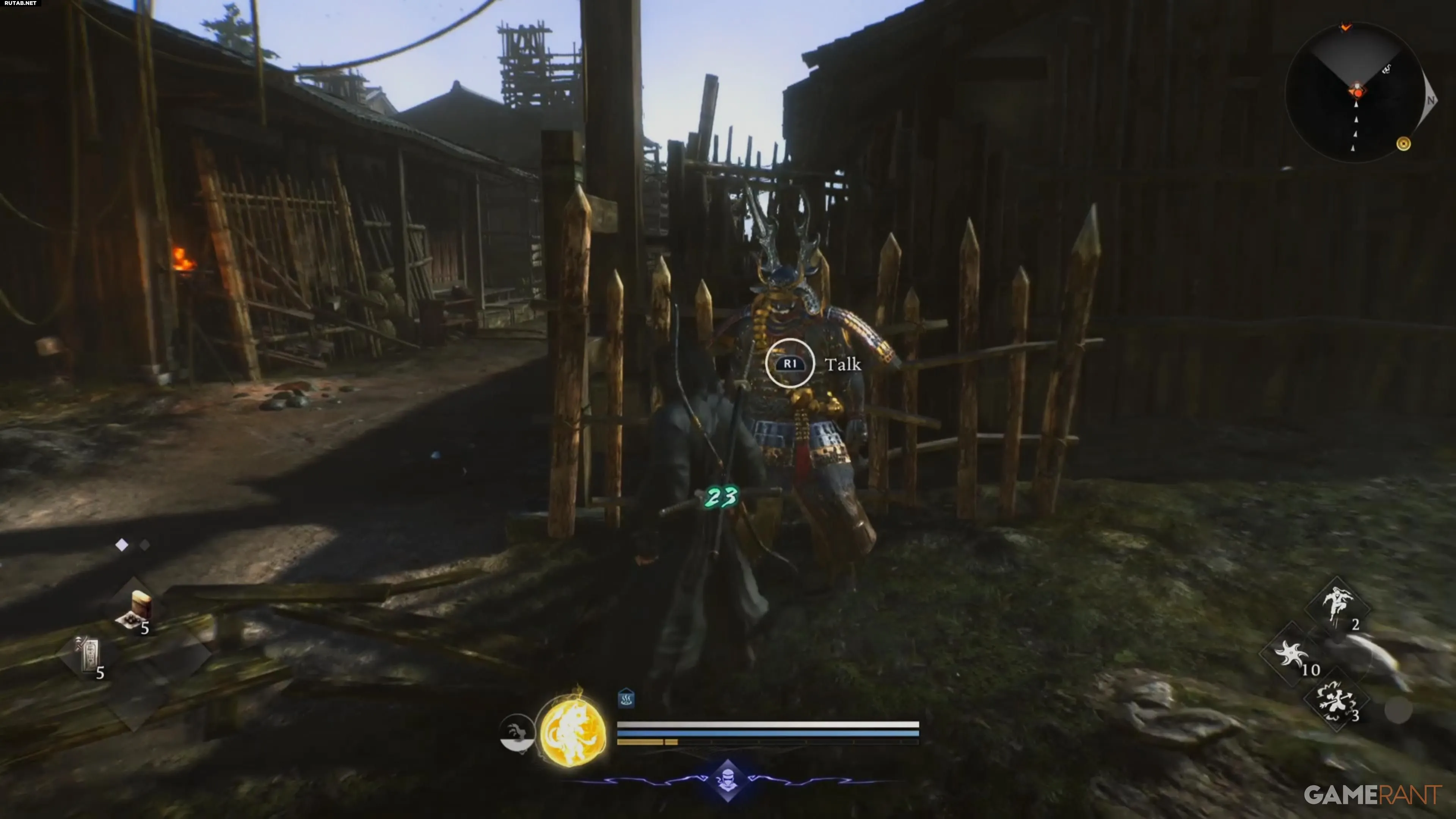 Ёкай в доме справа появится только после того, как вы разберетесь со всеми остальными противниками. Несколько врагов расположены на крышах домов — постарайтесь устранить их с помощью лука, чтобы избежать боя под обстрелом камнями. Когда все ёкаи будут побеждены и база зачищена, поговорите с Хондой. Он упомянет Проклятые пещеры.