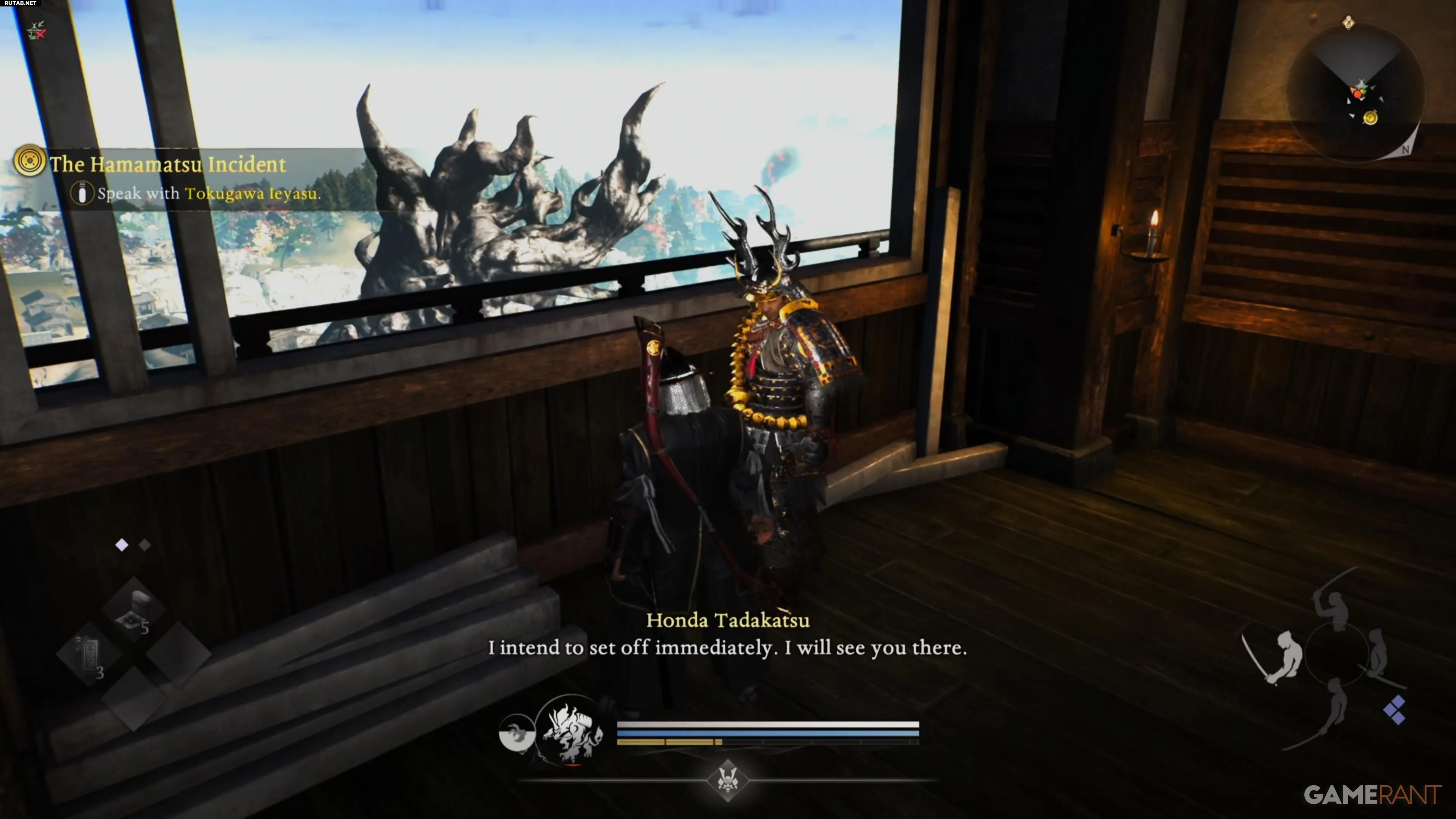 Чтобы добраться до заставы Майсака, нужно двигаться на юг от Хамамацу по дороге, ведущей прямо к цели. Следуйте по пути на запад, пока не увидите Хонду Тадакацу, ожидающего вас у входа. После разговора с ним войдите внутрь и очистите базу от всех ёкаев.