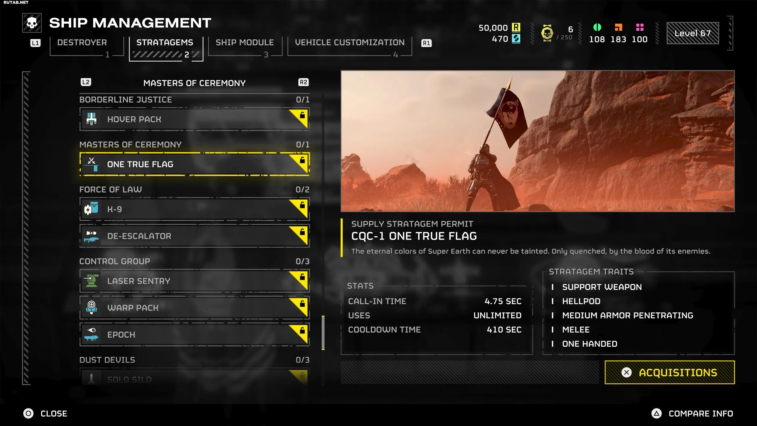 Единственное Истинное Знамя — это стратагема, которую можно купить в боевом пропуске «Мастера церемоний». После приобретения за 110 медалей на 3-й странице, вы сможете вызвать её в бою кодом: Вниз, Влево, Вправо, Вправо, Вверх. Однако знамя невозможно уничтожить обычными атаками.