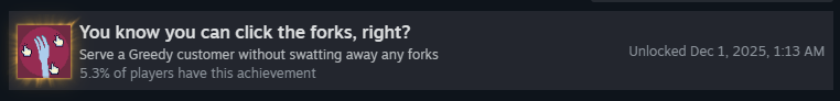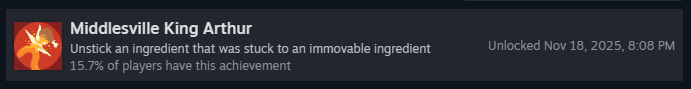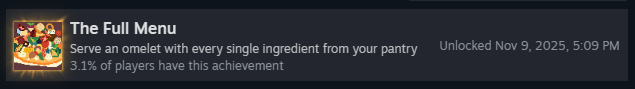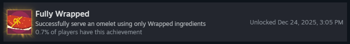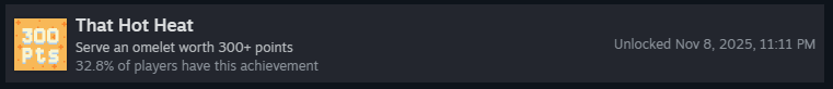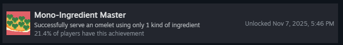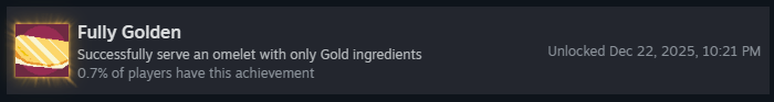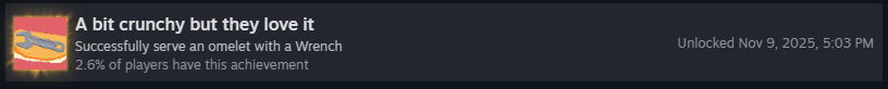 Успешно подайте омлет с гаечным ключом! Несмотря на редкость, это очень простое достижение! Вам просто нужно, чтобы ключ оказался на омлете, ему не обязательно приносить очки. Чтобы получить ключ, можно либо найти его в ящике с минералами, либо он может появиться у клиента «Сделай-это-Майк»!