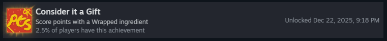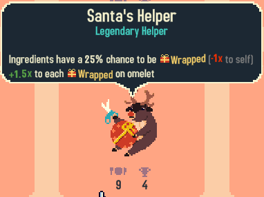 «Помощник Санты» применяет множитель x1.5 к любому завёрнутому ингредиенту на омлете! А также с вероятностью 30% накладывает эффект «Завёрнуто» на любой ингредиент! Сочетайте это с клиентом «Завёрнуто», и большинство ваших ингредиентов окажутся завёрнутыми!