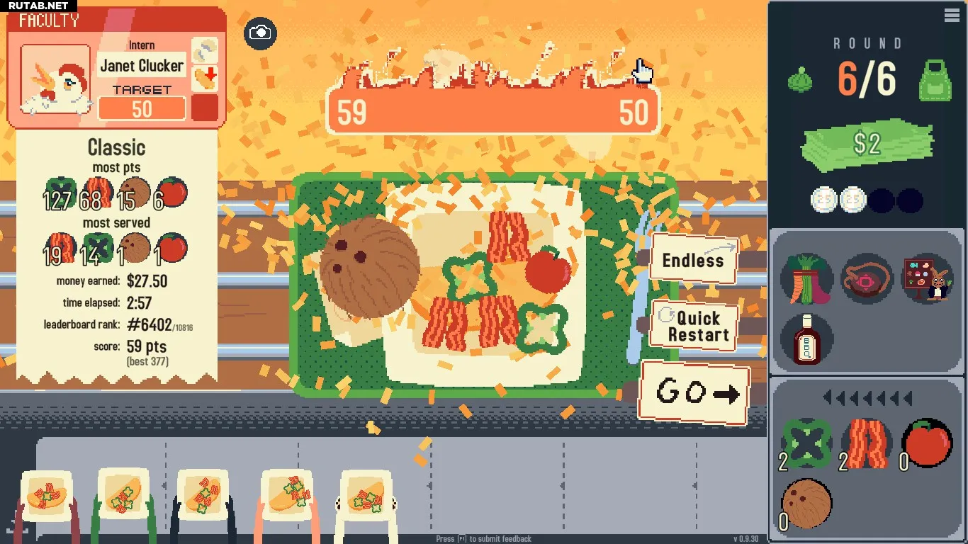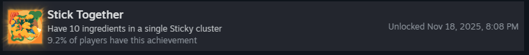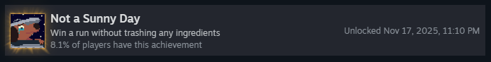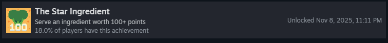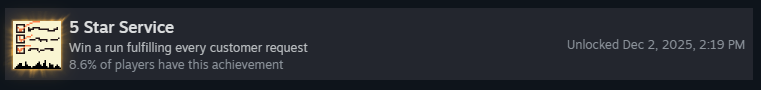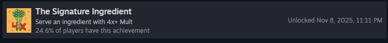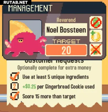 Выполните 40 запросов клиентов за все забеги. Запрос клиента — это галочки, которые появляются под клиентом во время раунда. Есть два вида запросов: галочки и счётчики, как я их называю. Правильное выполнение условий с галочками оставит отметку об успехе, а счётчики засчитаются, если у вас есть хотя бы один ингредиент, который они требуют!