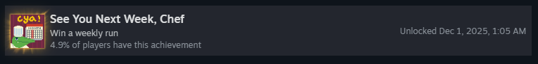 Победите в еженедельном забеге. Это не слишком сложно, сложность определяется фартуком на этой неделе. Гарантированно, что это всегда будет хаотичный режим, так что не расслабляйтесь! Возможно, потребуется несколько попыток, но в конце концов у вас всё получится! Если нужна конкретная помощь, смотрите мои описания сложностей.