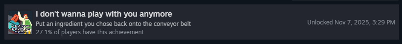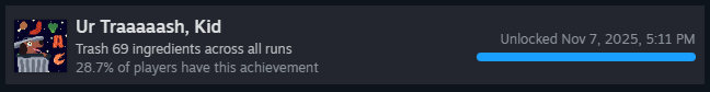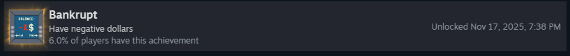 С обновлением, добавившим клиентов, получить это достижение стало намного проще! Когда вы видите, что в следующем раунде появится клиент-задира, потратьте в магазине как можно больше денег. Затем в раунде кладите ингредиенты, которые задира НЕ любит, пока у вас не останется -$1!
