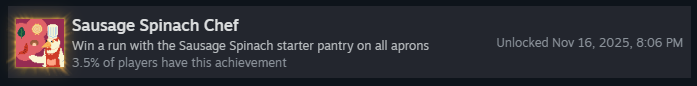 Пройдите забег на каждом уровне сложности со стартовым набором «Колбаса и шпинат»! Это включает: «Зелёный фартук», «Жёлтый фартук», «Синий фартук» и «Красный фартук». Как только вы победите на всех, вы получите достижение!
