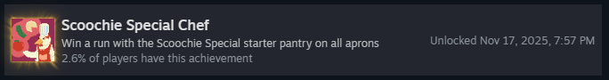 Пройдите забег на каждом уровне сложности со стартовым набором «Scoochie Special»! Это включает: «Зелёный фартук», «Жёлтый фартук», «Синий фартук» и «Красный фартук». Как только вы победите на всех, вы получите достижение!