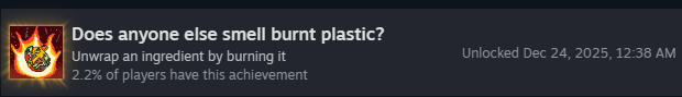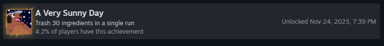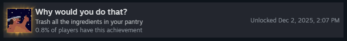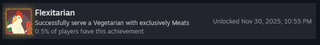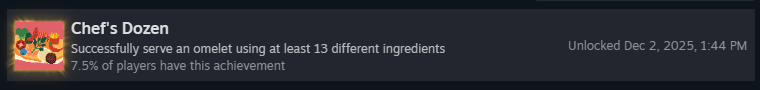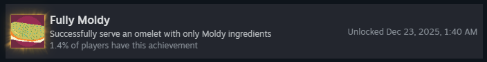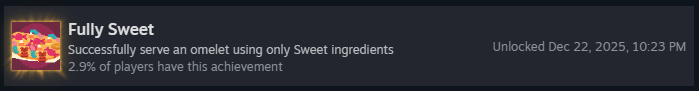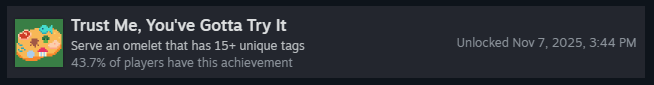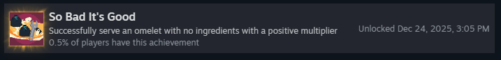 Чтобы получить это достижение, нужно успешно подать омлет, используя материалы с отрицательным базовым количеством очков, и чтобы они приносили положительные очки.