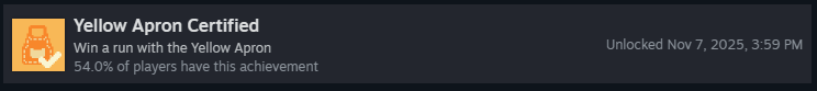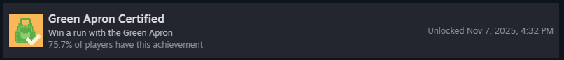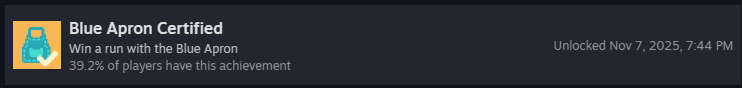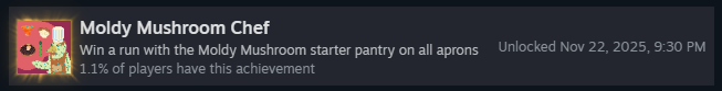 Пройдите забег на каждом уровне сложности со стартовым набором «Заплесневелый»! Это включает: «Зелёный фартук», «Жёлтый фартук», «Синий фартук» и «Красный фартук». Как только вы победите на всех, вы получите достижение!