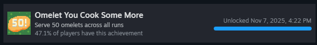 Подайте 50 омлетов за все свои забеги! Просто играйте в обычном режиме, и вы получите это достижение в мгновение ока!