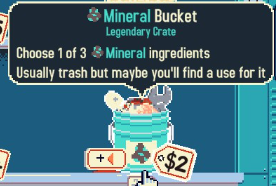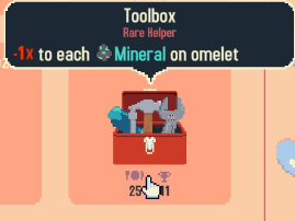 Другой способ — использовать минералы и получить помощника «Инструментарий». «Инструментарий» применяет множитель -1x к любому минералу, а эффект «Завёрнуто» применяет -1x к самому себе, что в сумме даёт -2x! Так что любой минерал с отрицательными очками станет положительным! Например, «Консервная банка» или «Гаечный ключ»!