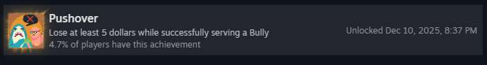 Успешно обслужите задиру после того, как он забрал у вас $5! В принципе, всё то же самое, что и для «Bankrupt», но вам нужно подать как минимум 5 ингредиентов, которые задира не любит, и при этом выиграть раунд.