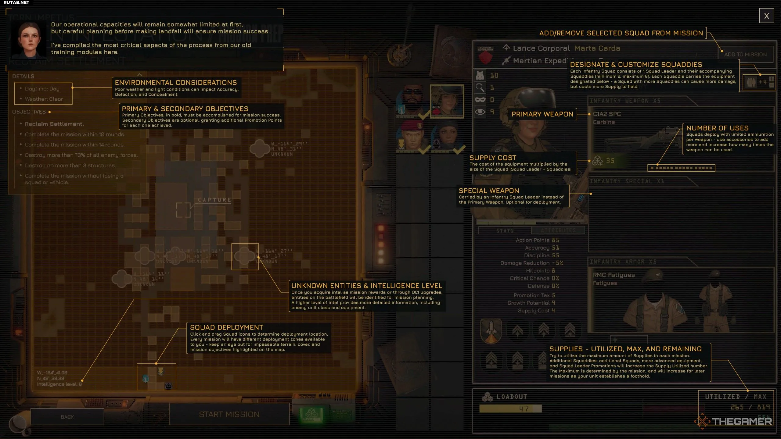 У каждой миссии есть лимит снаряжения, которое вы можете взять с собой. Каждый предмет экипировки занимает часть этого лимита, и чем больше повышений у лидера отряда, тем больше снаряжения он занимает по умолчанию. Бойцы, которых вы берёте с каждым лидером, также выступают в роли множителя лимита снаряжения для миссии.