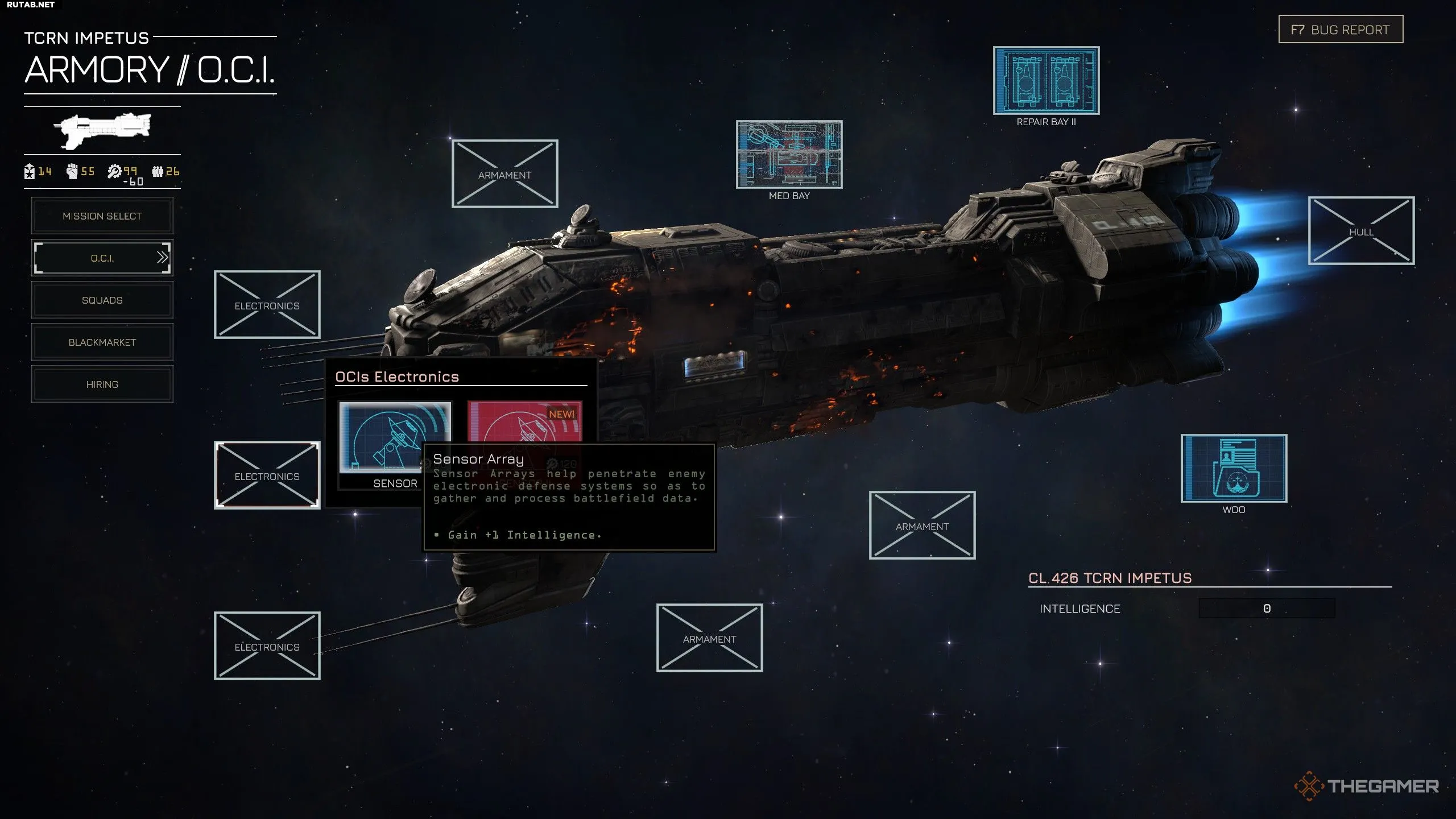 Разведданные — это информация о параметрах миссии. Хотя в некоторых операциях есть свои способы их получения, установка сенсоров на «Импетус» — ваш основной способ постоянно иметь данные о противнике. Сначала это может показаться нецелесообразным, но как только у вас появится достаточно снаряжения для планирования состава отрядов, это станет необходимым инструментом.