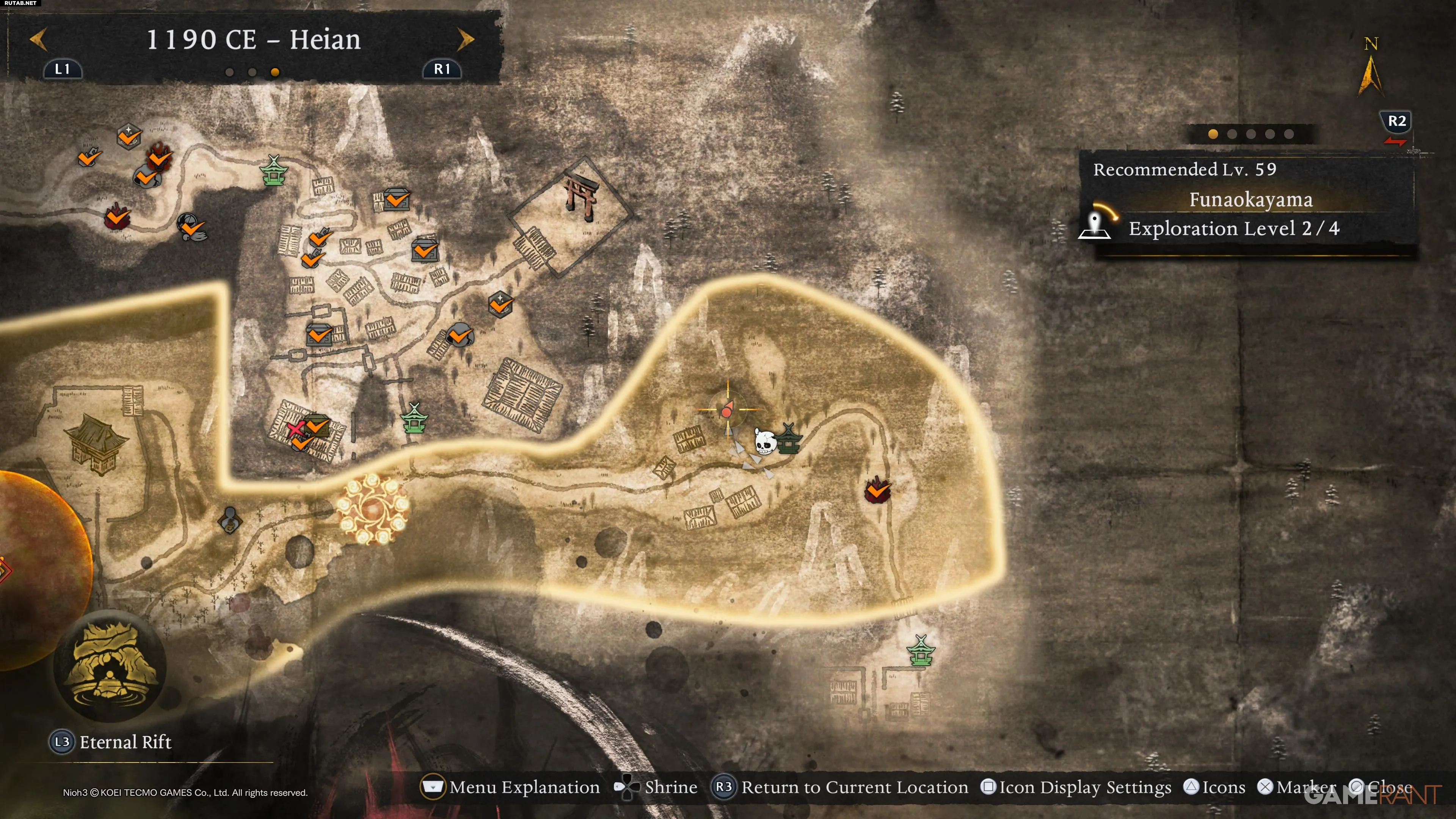 Святилища в Nioh 2 позволяют восполнить здоровье, повысить уровень и восстановить запасы эликсиров. Они также служат точками быстрого перемещения по карте, что значительно облегчает исследование. После попадания в эпоху Хэйан и прохождения сюжетного отрезка игроку поручат очистить три барьера. Двигаясь на юг, вы попадёте в регион Фунаокаяма, где на западе есть несколько мифов.