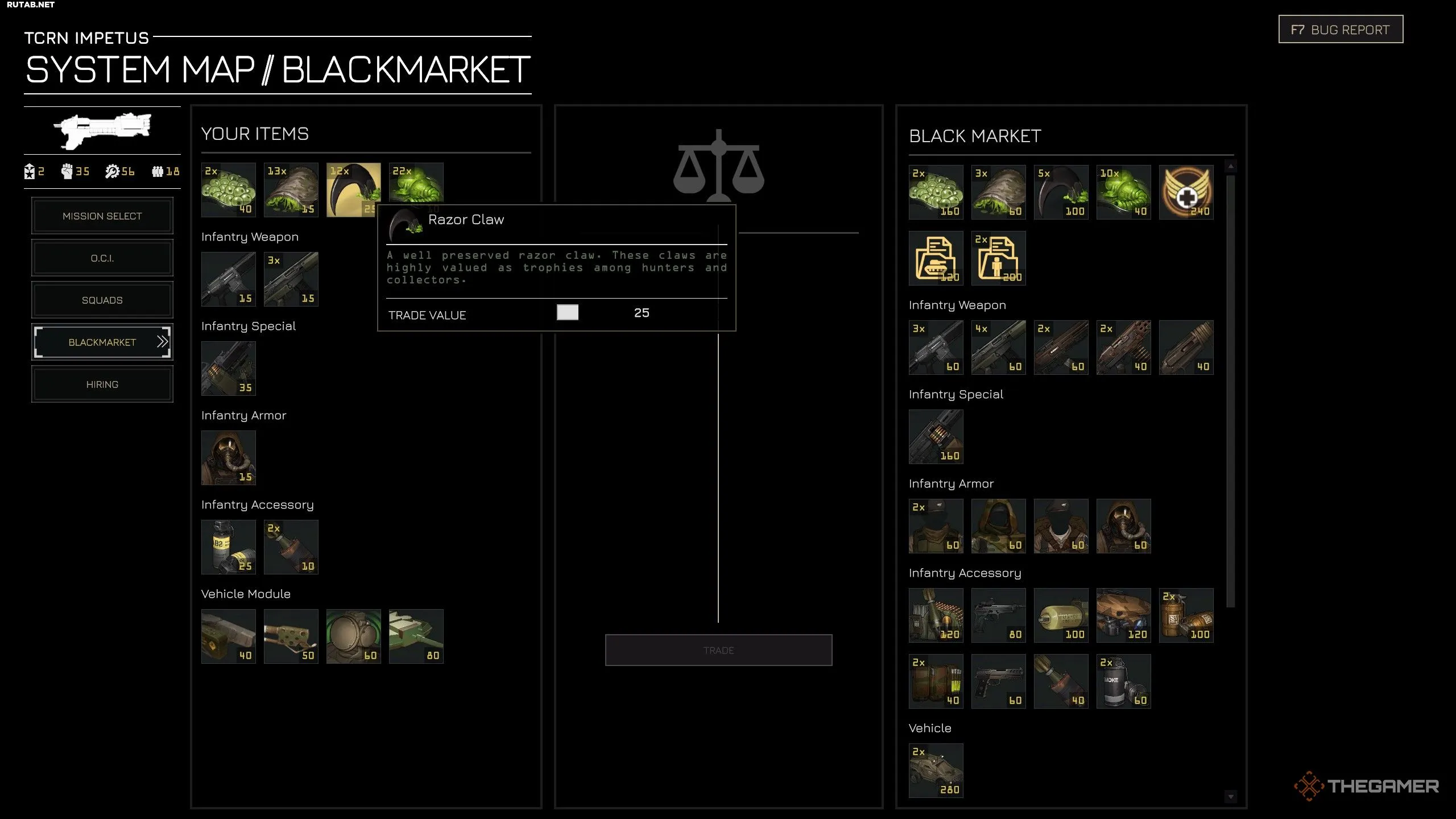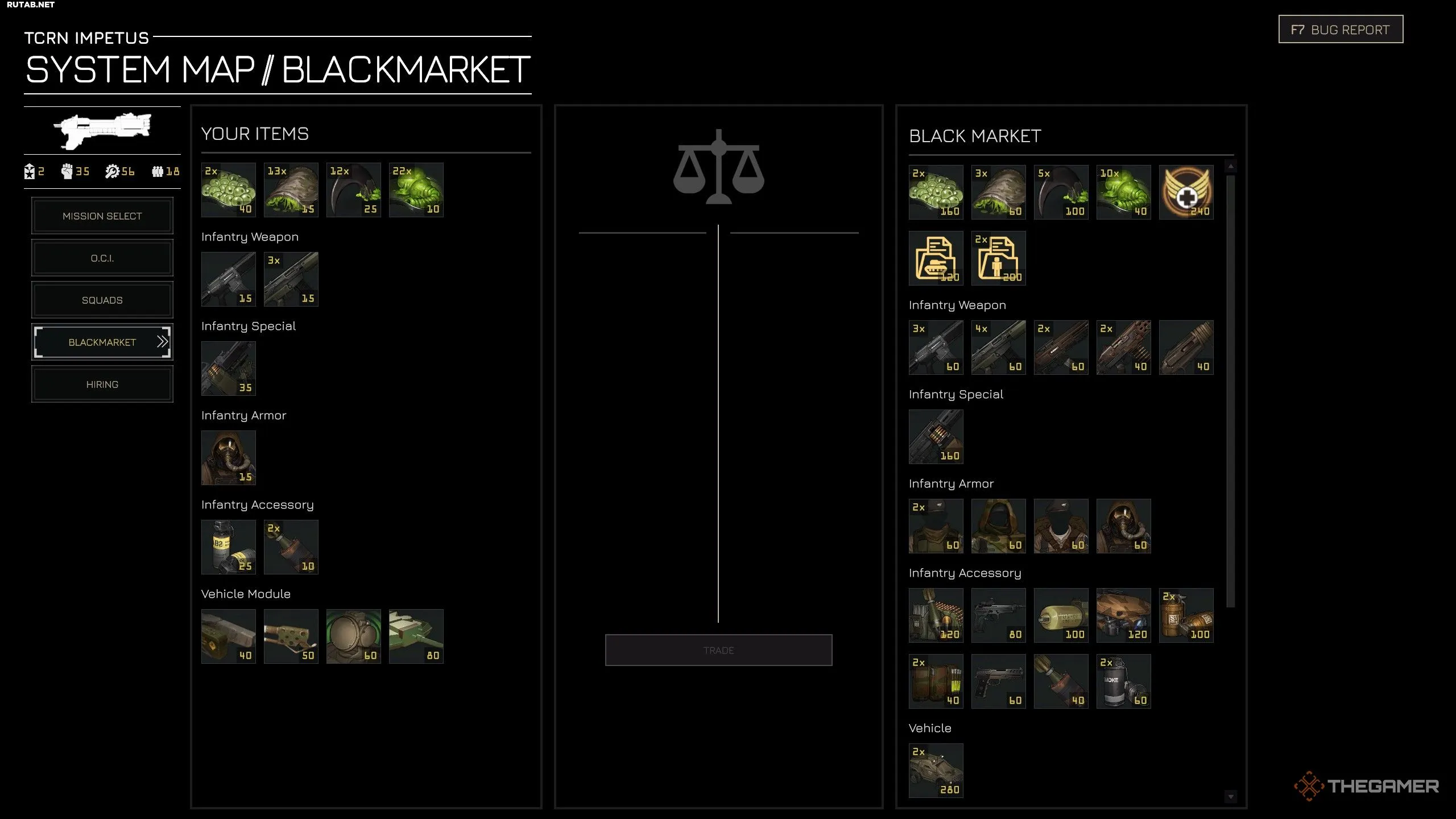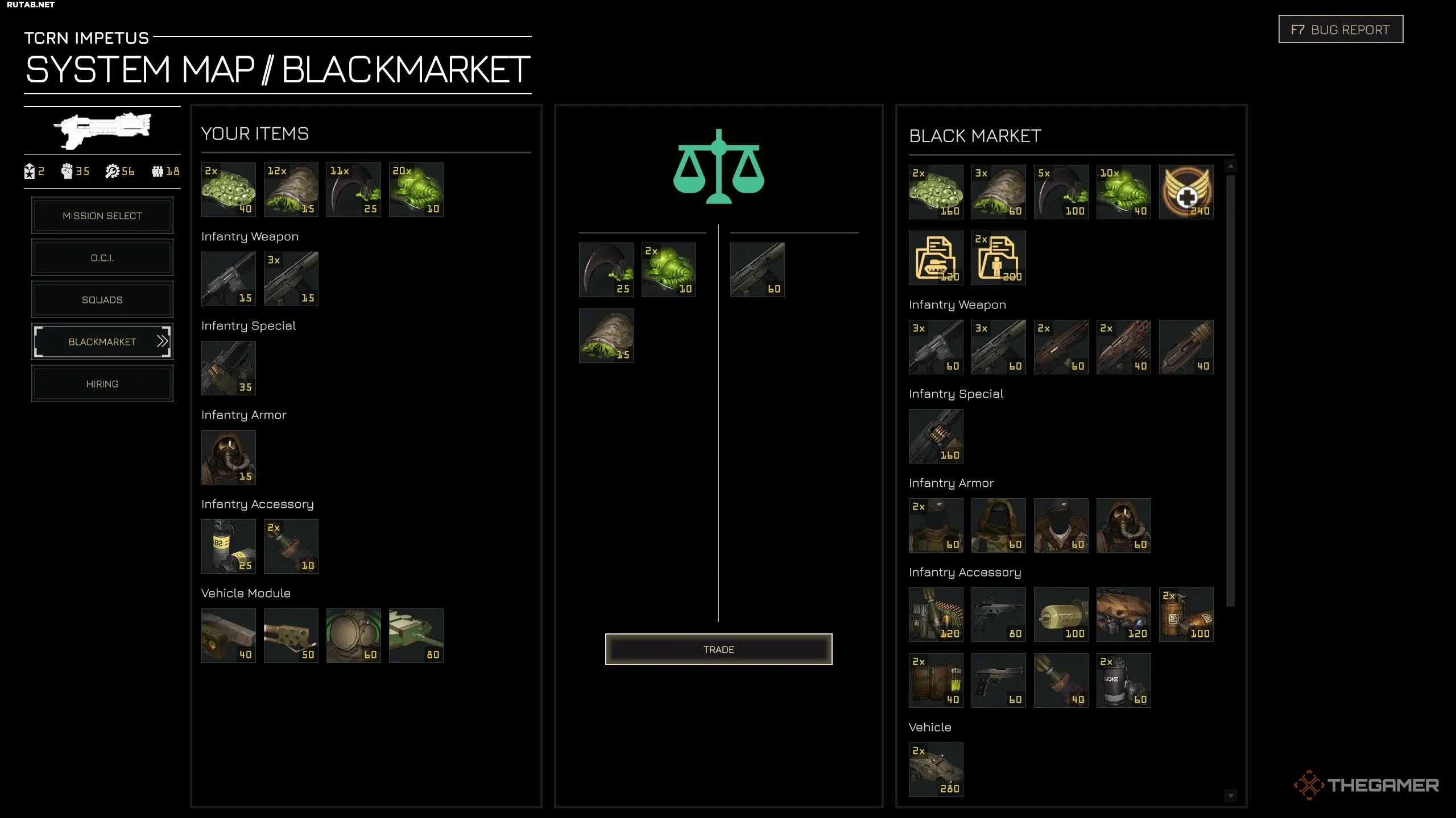 Чёрный рынок — это опция в меню, доступная в любое время между миссиями. Здесь вам предложат широкий ассортимент предметов для обмена. В нём представлено всё снаряжение: от оружия и брони до полноценных транспортных средств и мехов.Однако чёрный рынок не работает за деньги. Вместо этого вам нужно обменивать собственные товары, чтобы получить доступ к его запасам. У каждого предмета есть своя ценность, и для совершения сделки вам необходимо предложить товары, совокупная ценность которых равна или превышает ценность желаемого предмета.